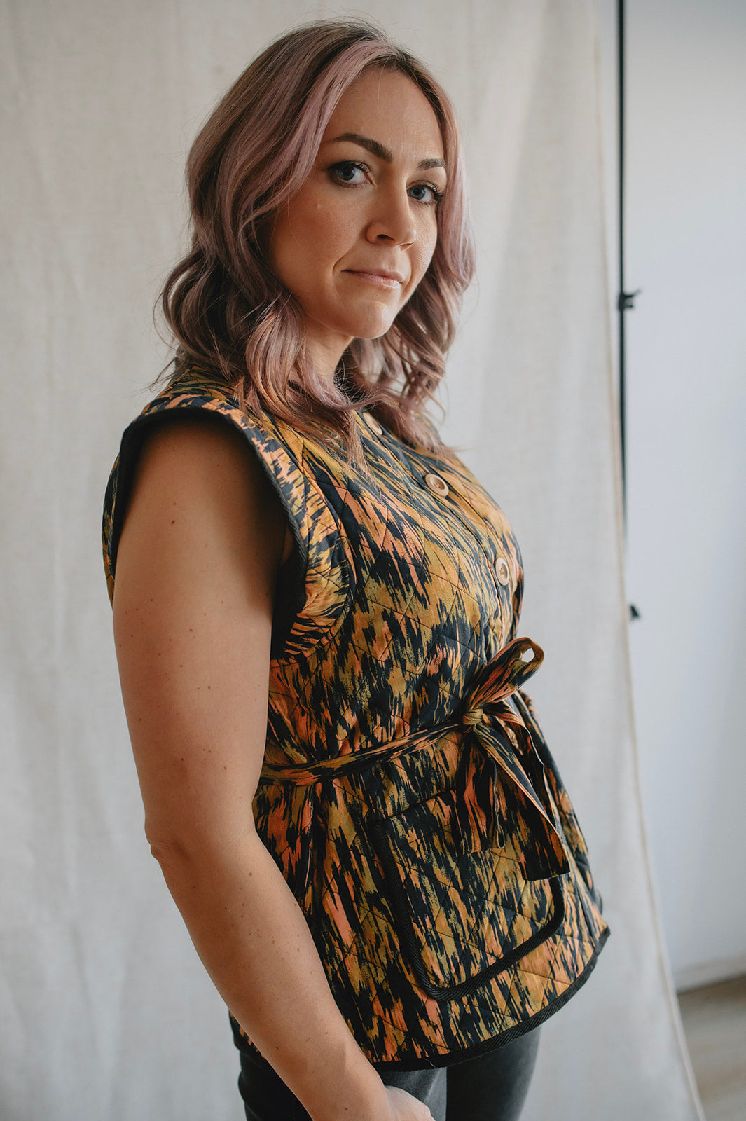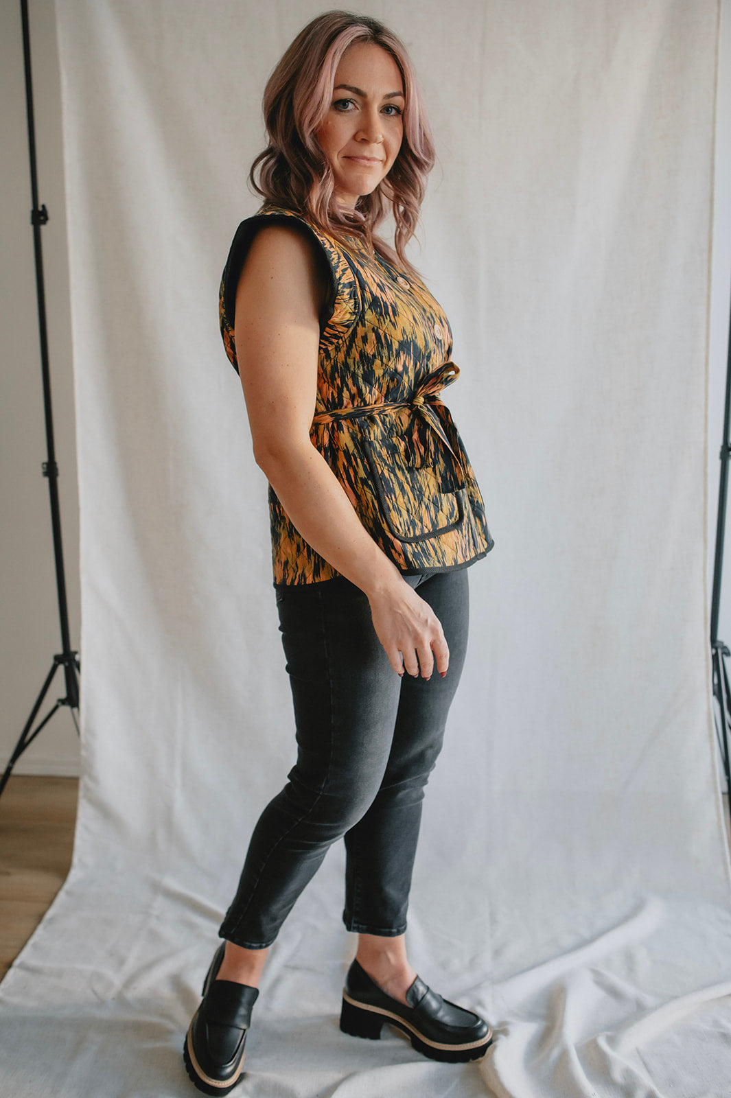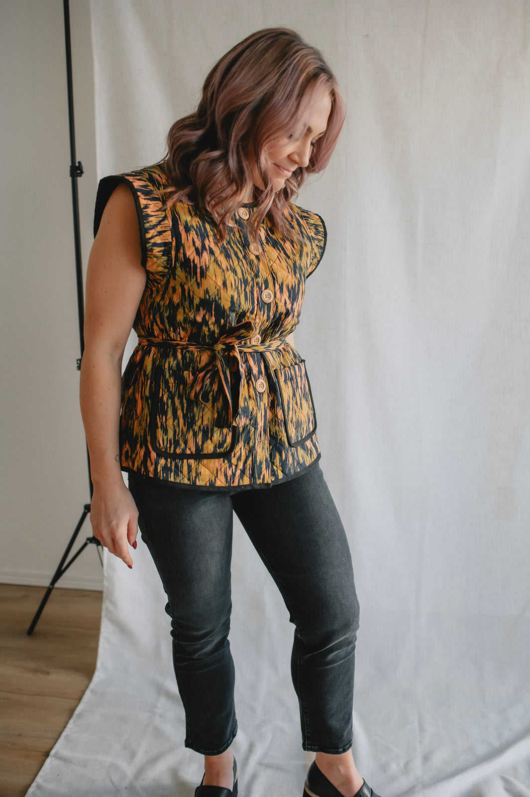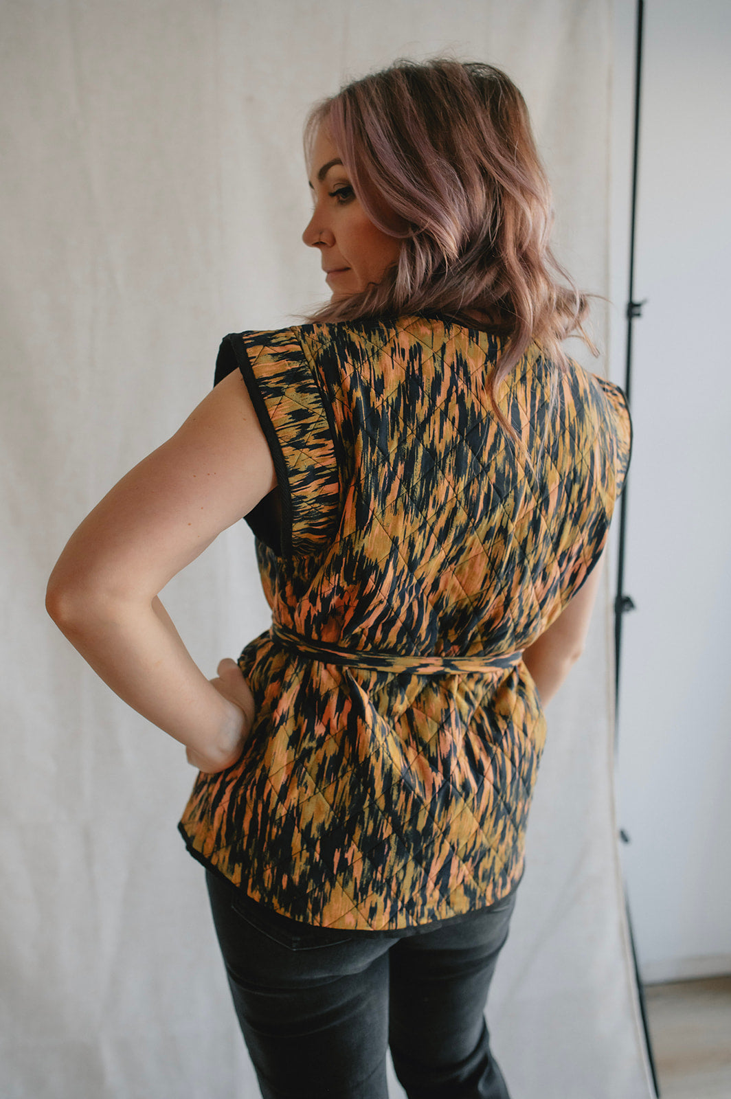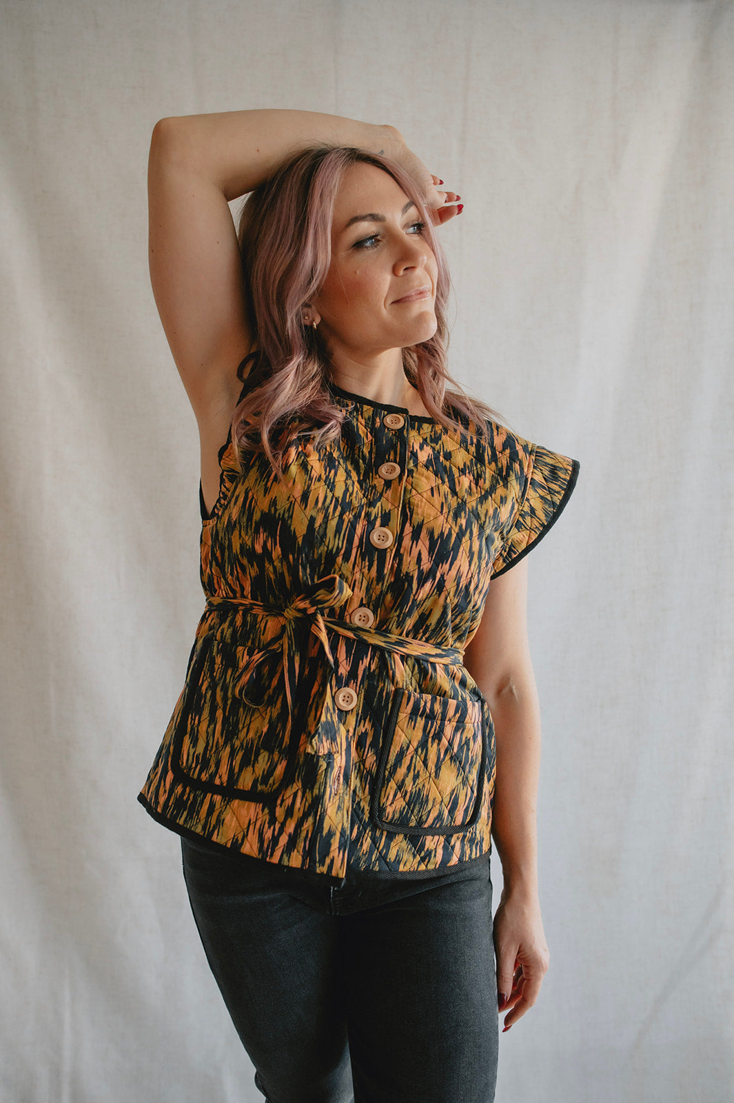This Leonardie Waistcoat is the perfect layering piece for any wardrobe. Crafted with light quilting and an eye-catching abstract print, it is designed to fit any occasion using cream buttons, navy cotton trim, and a tie waist. Elevate your look today!.