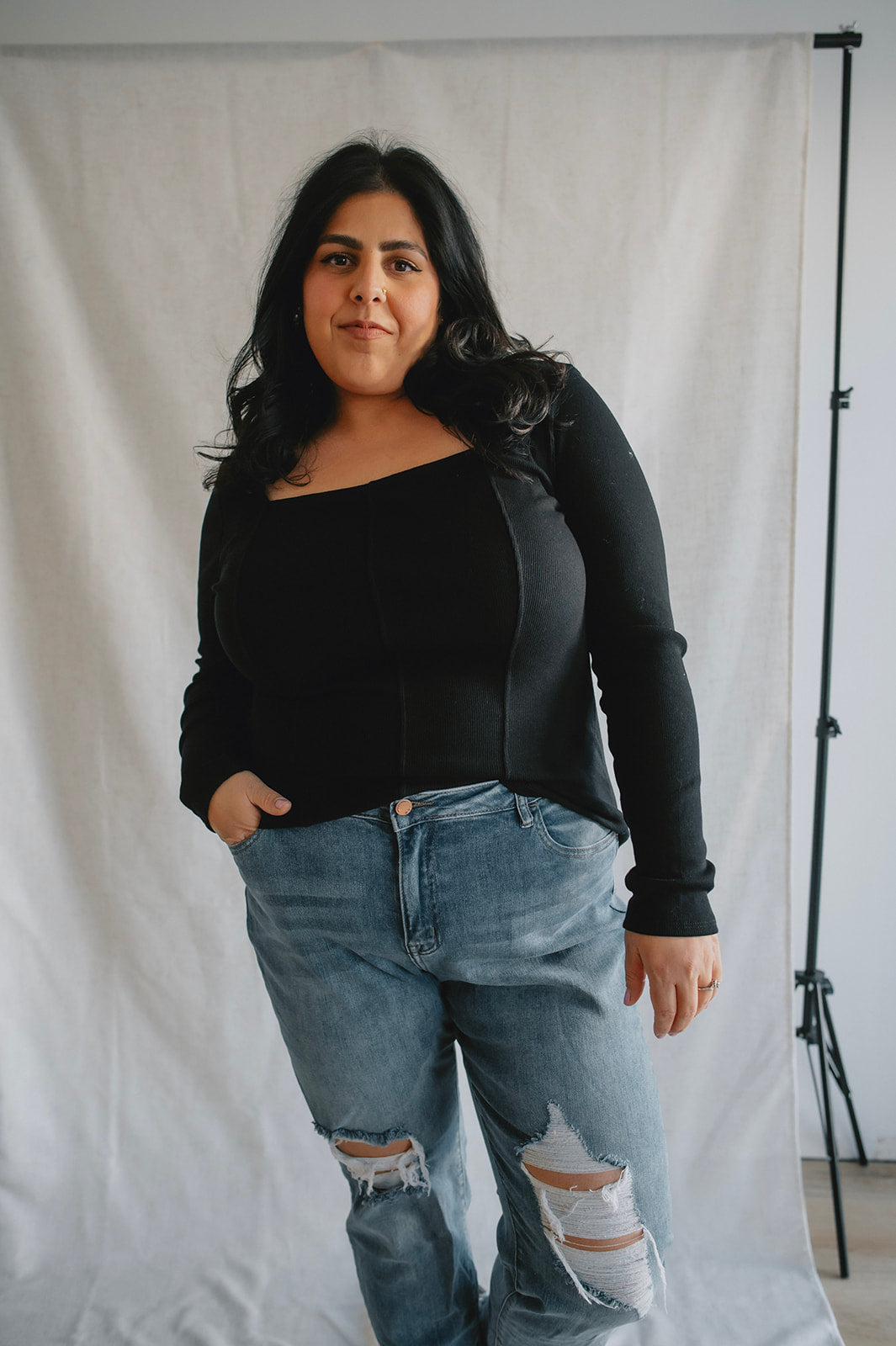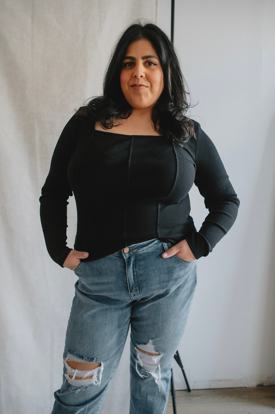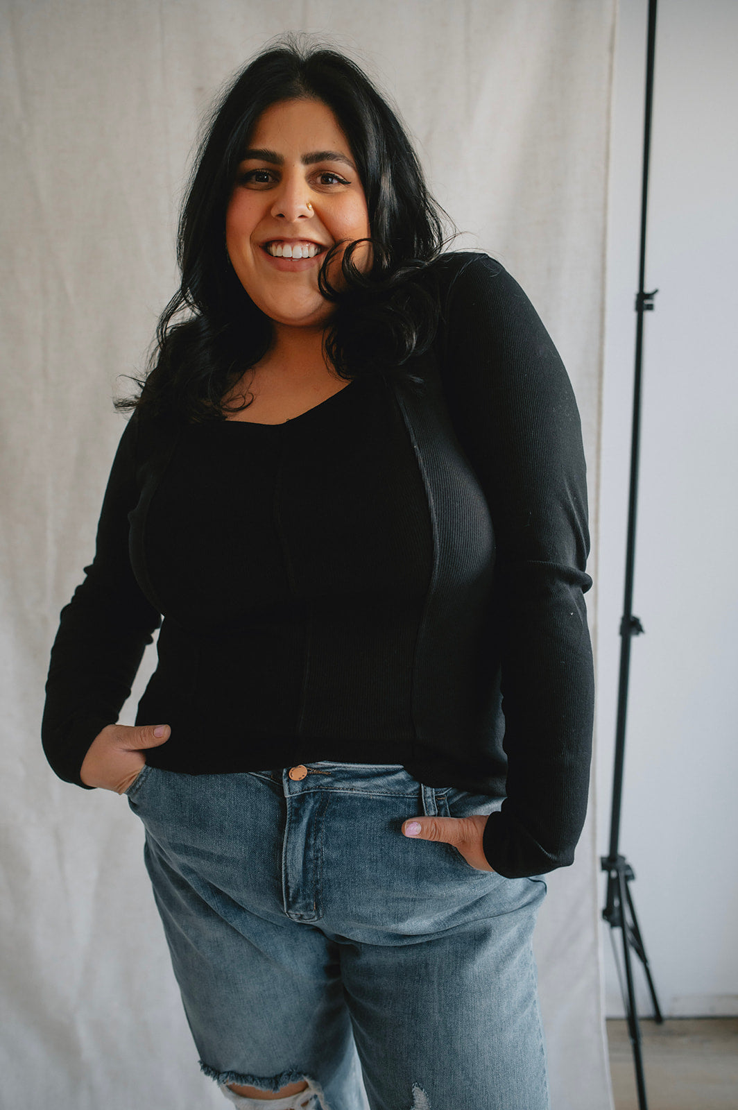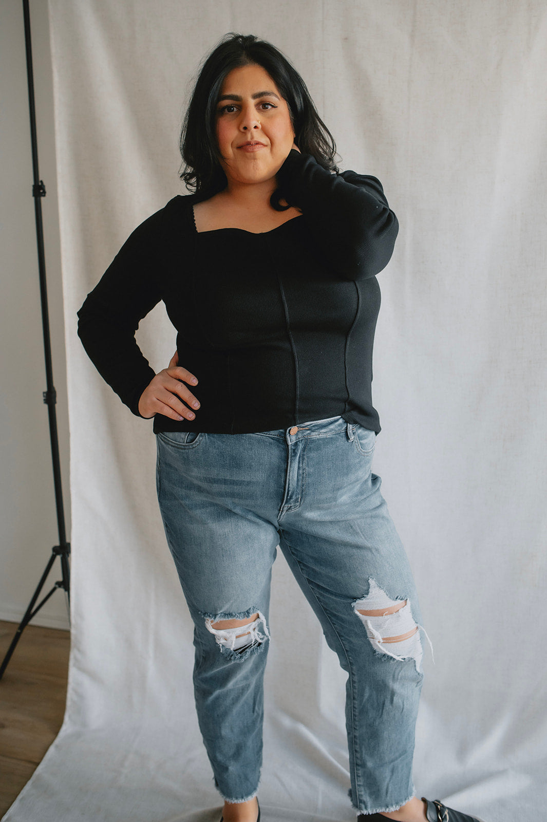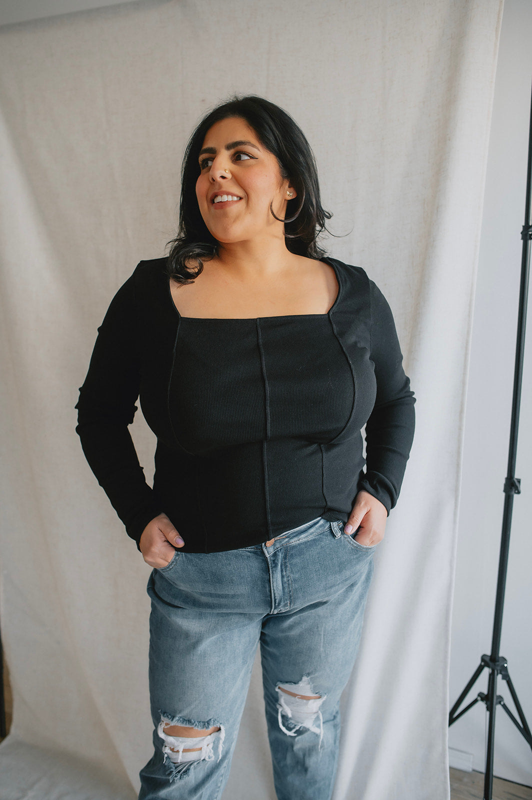 A simple top with a big personality. This ribbed long sleeve has a square neck and front piping to mimic a corset fit. Made of a soft ribbed fabric so you'll never want to take her off!