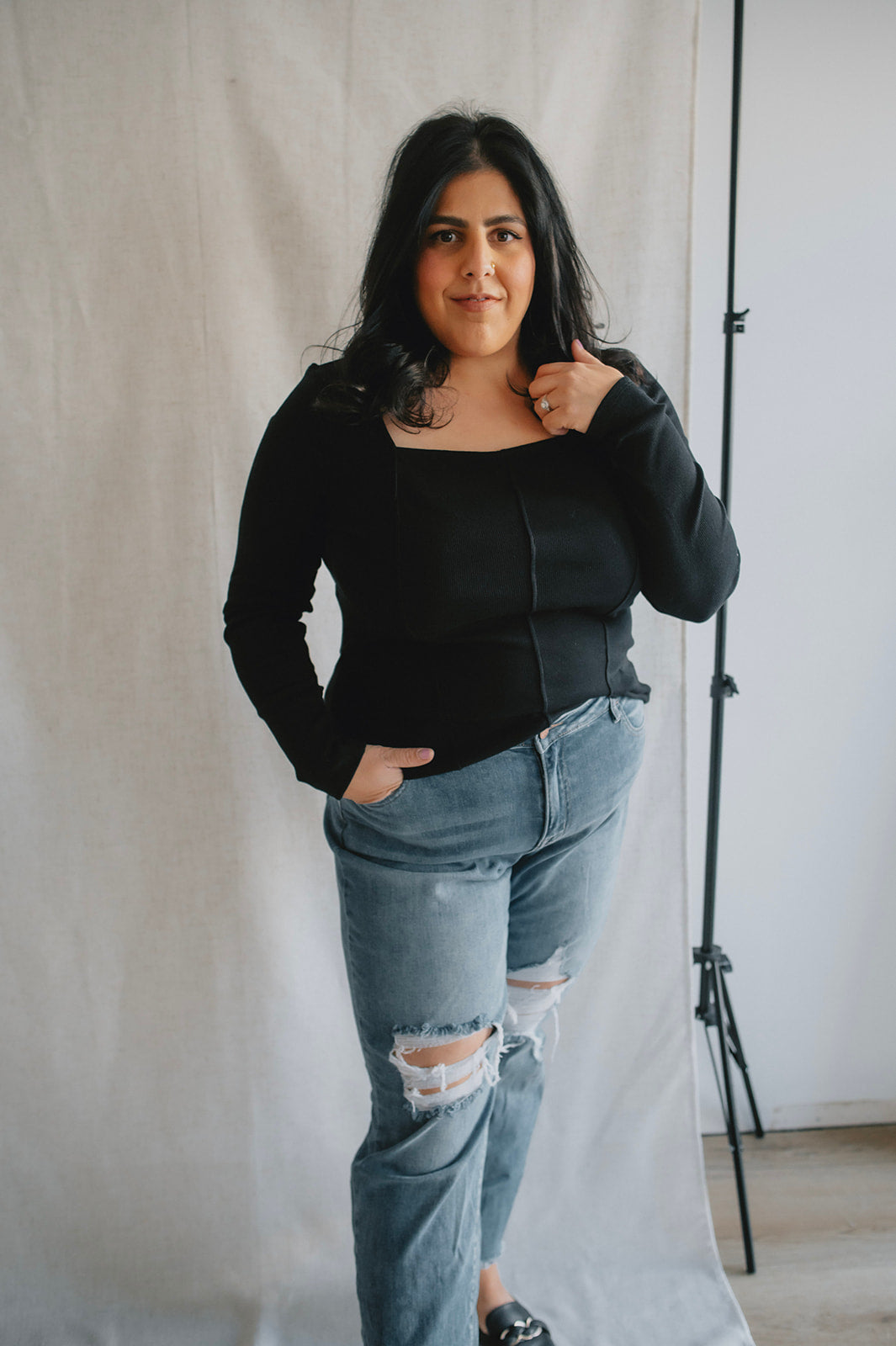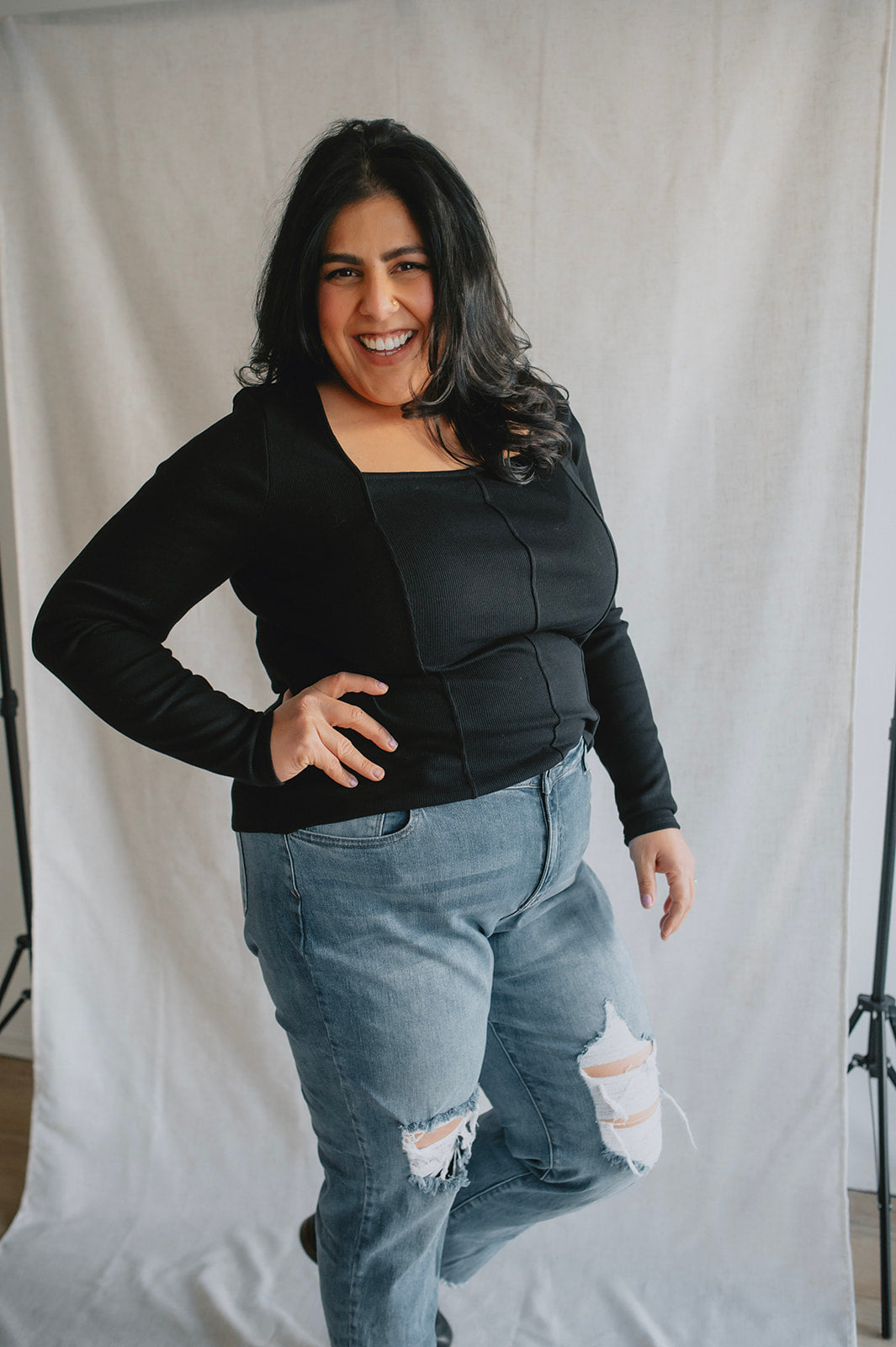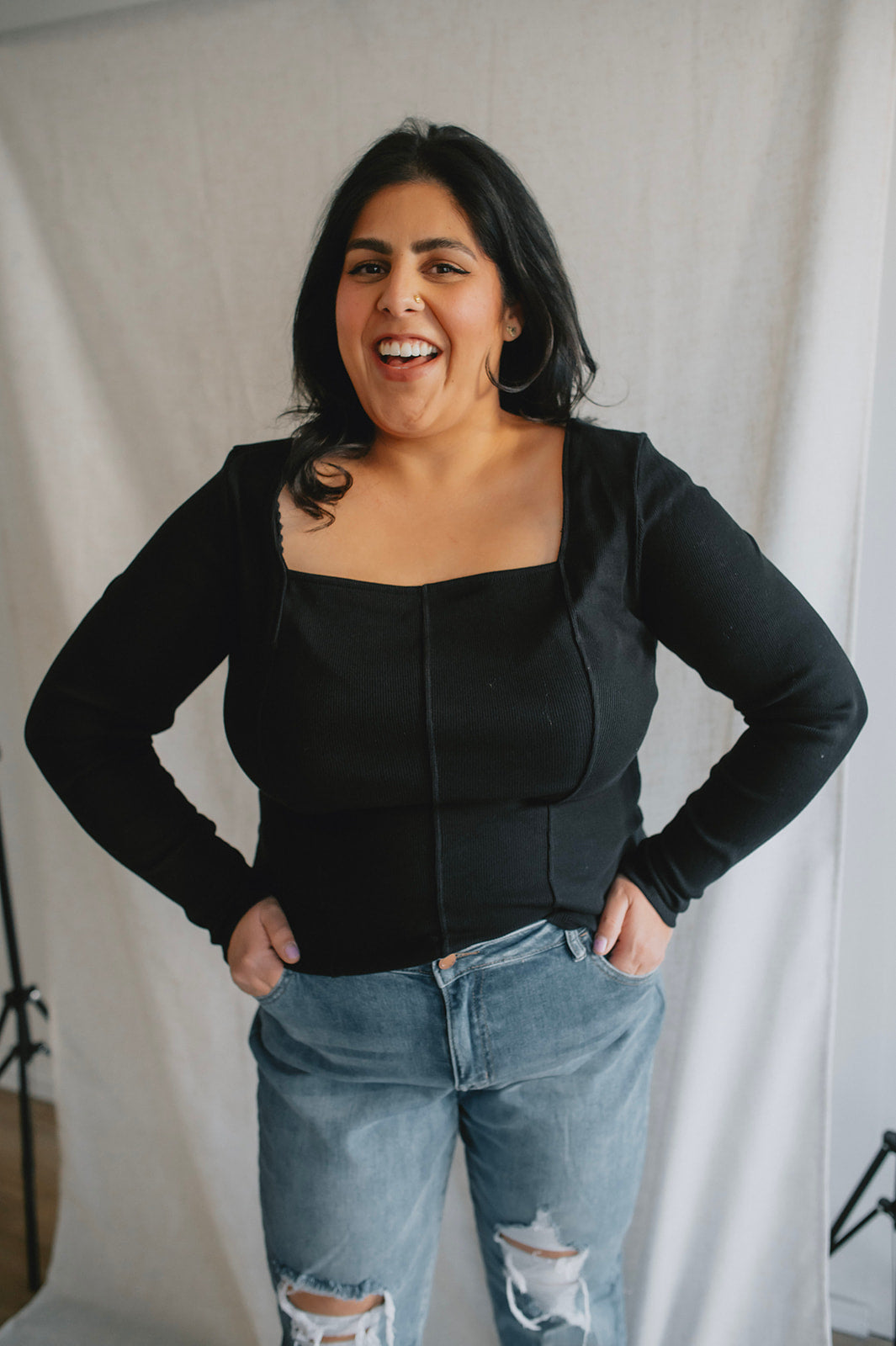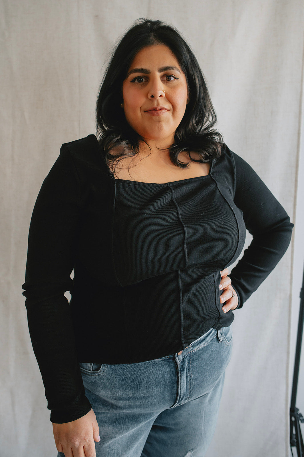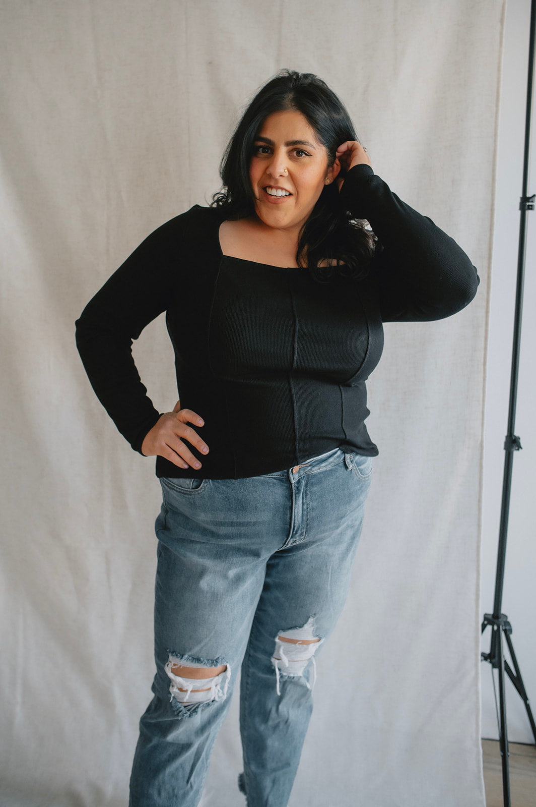 A simple top with a big personality. This ribbed long sleeve has a square neck and front piping to mimic a corset fit. Made of a soft ribbed fabric so you'll never want to take her off!