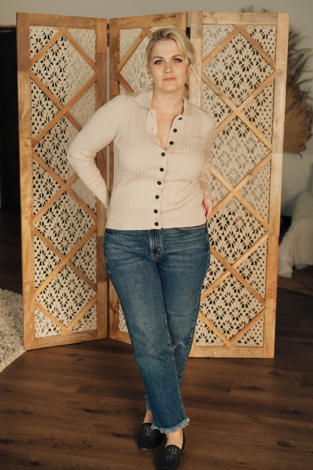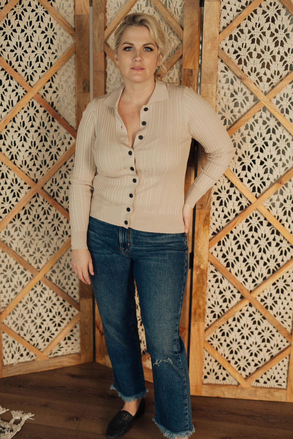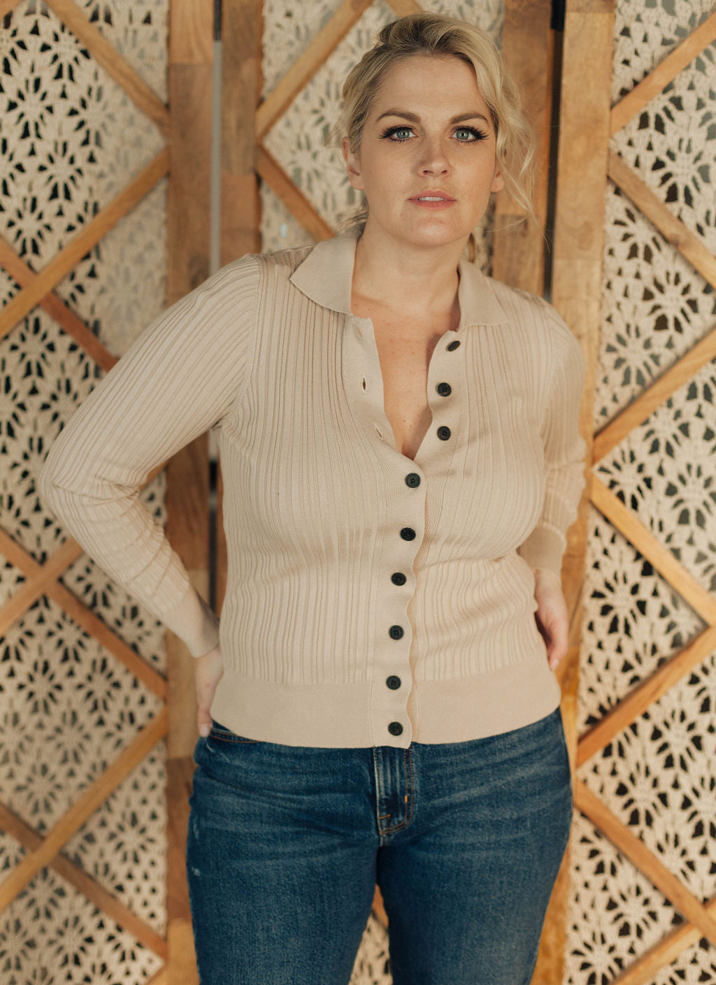 Hello, fitted cardigan. A super soft and stretchy ribbed long sleeve. Great layered or worn as is. A staple.