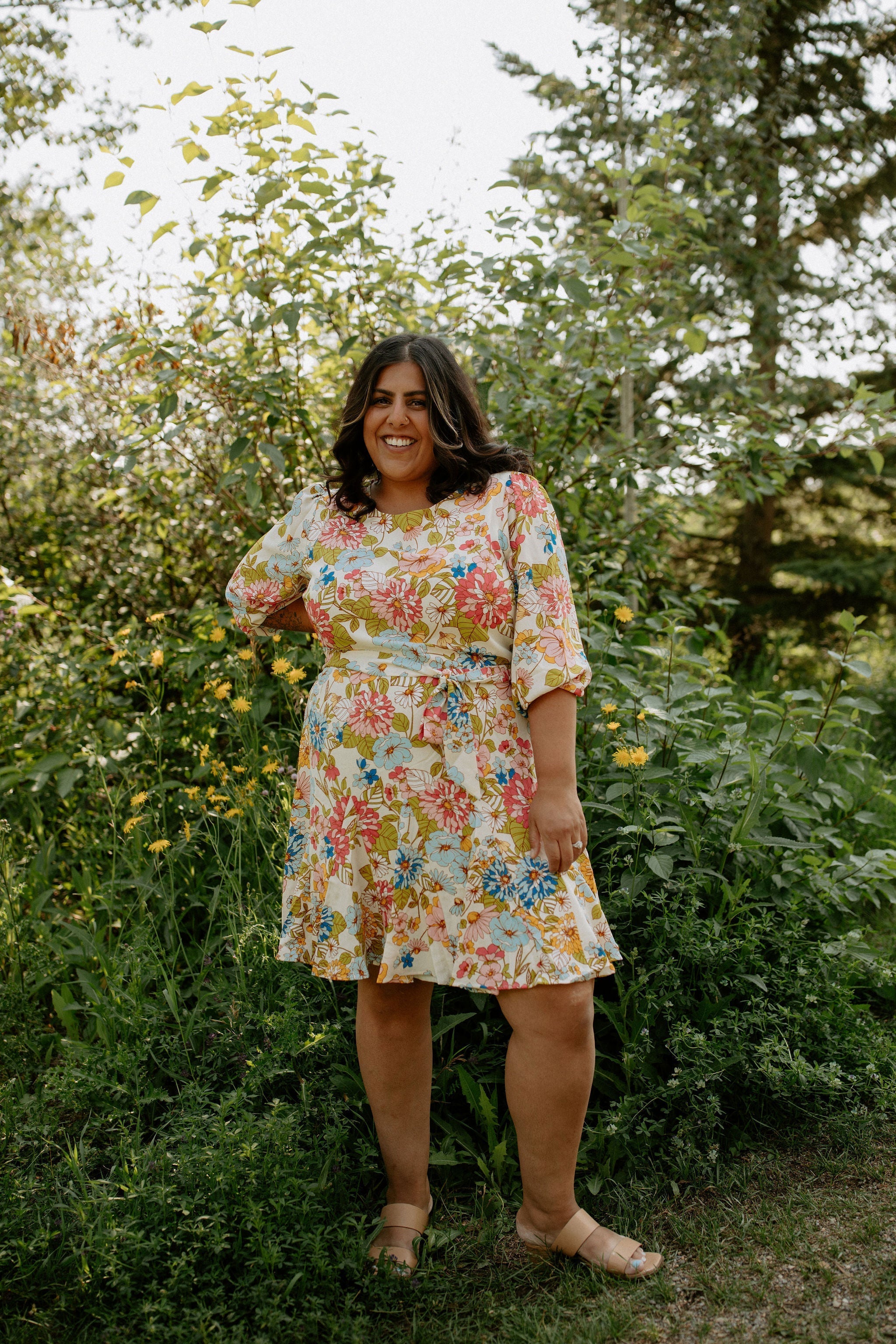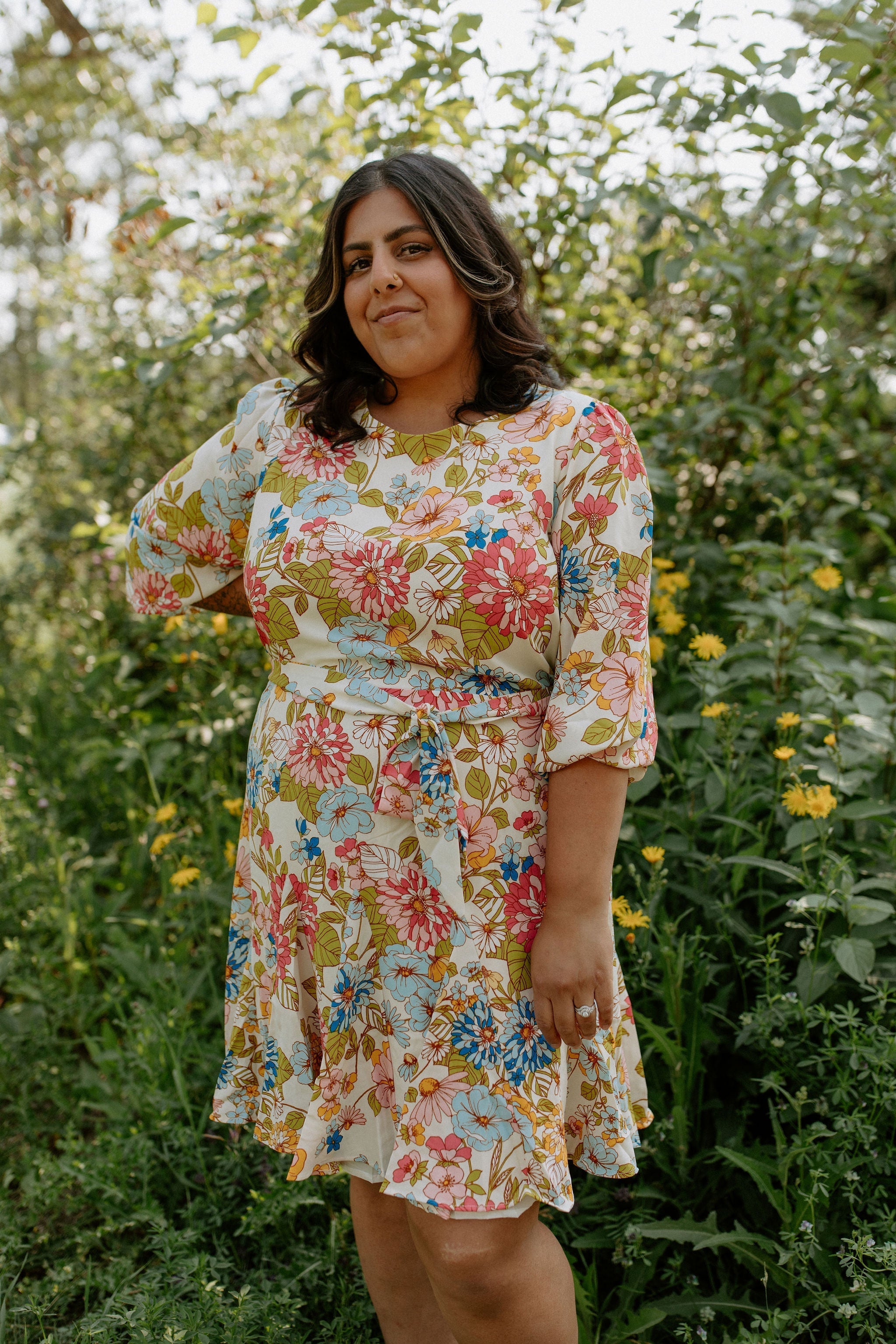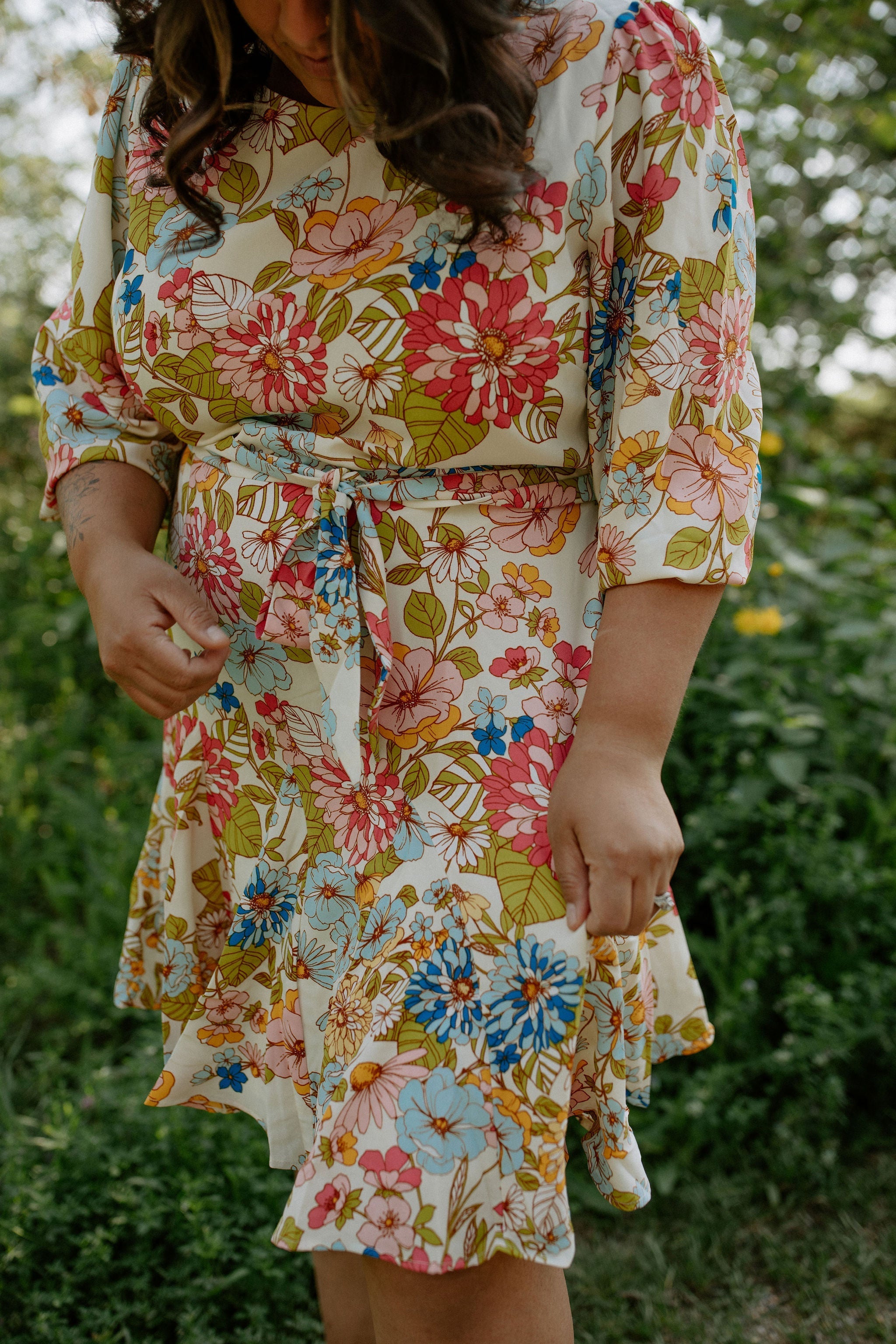Nothing but good vibes in the Rochelle Balloon Sleeve Dress. Various bold flowers embody this classic style that features a flattering tie at the waist, and a slight ruffle at the bottom.