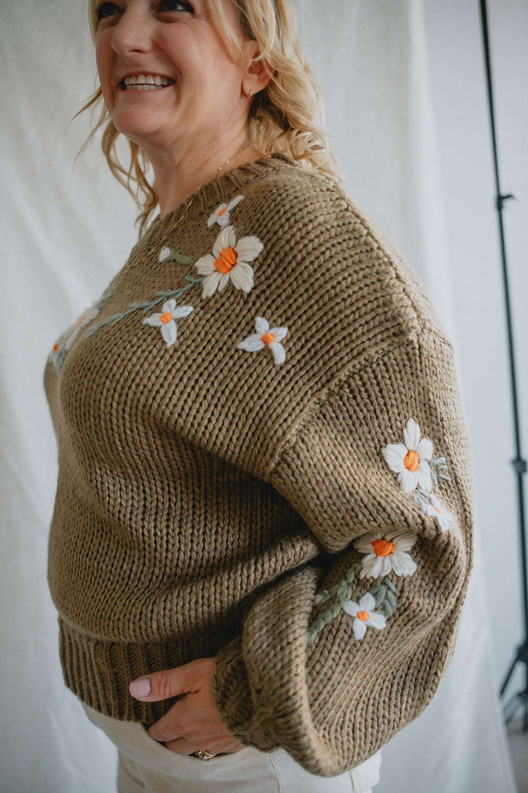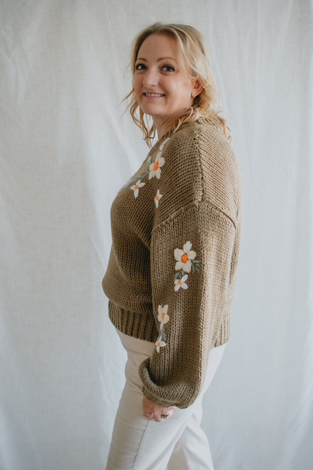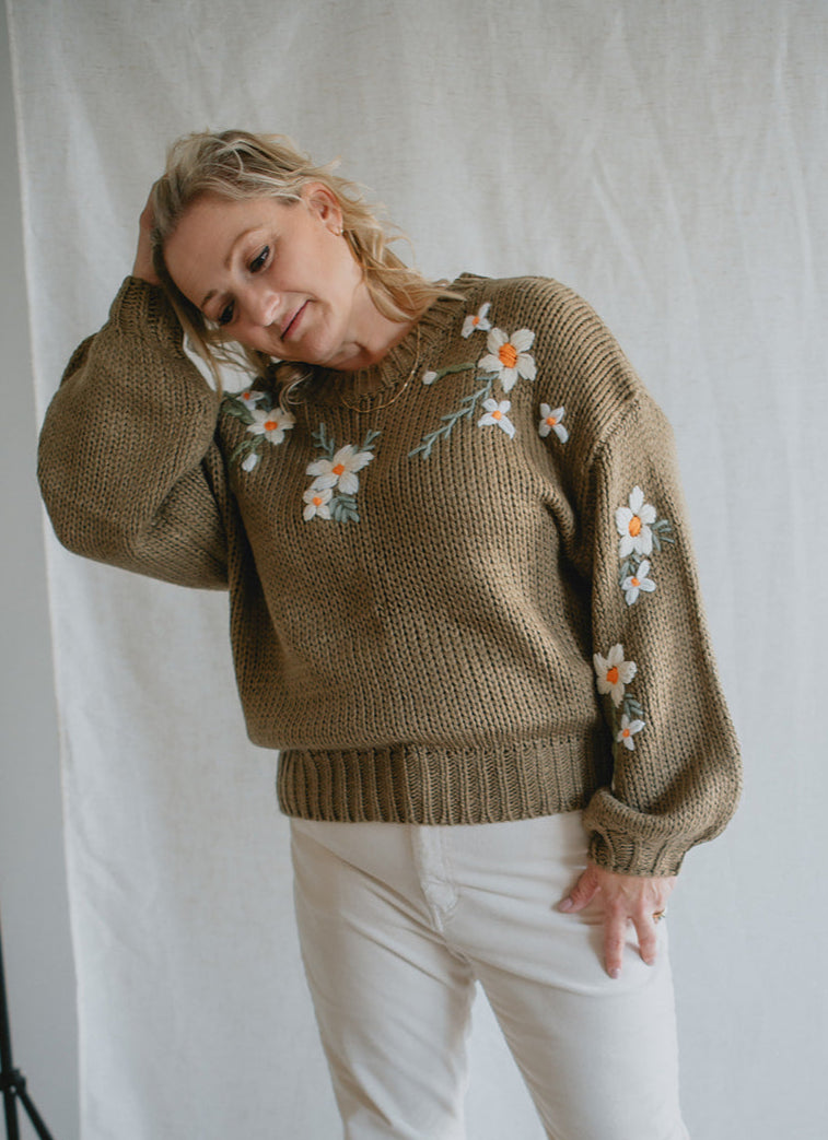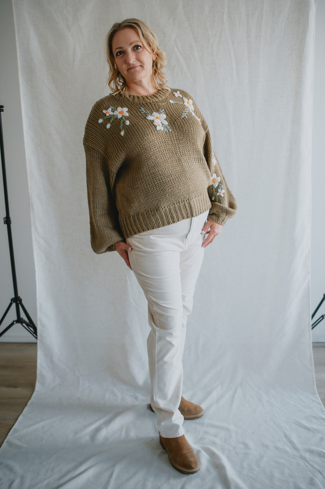 The Wren Embroidered Floral Sweater is a cozy yet elegant piece, featuring delicate white embroidered blooms for a cute and timeless touch. Designed with a wider round neck, dropped shoulders, and slight balloon sleeves, it offers a relaxed fit for effortless style. Crafted from a soft acrylic knit, this sweater is as comfortable as it is stylish, perfect for everyday wear!