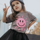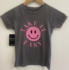 Keep it cool and comfy with this playful short sleeve tee! Made from soft, breathable fabric, this grey t-shirt features a cheerful pink smiley face front and center, with the uplifting message "Take It Easy" to inspire good vibes all day long. Perfect for playtime, school, or lounging at home, this tee adds a fun pop of positivity to any outfit. Designed with a relaxed fit for easy movement and all-day comfort.