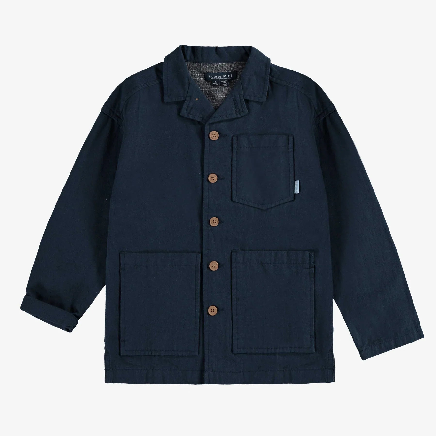 Navy long-sleeved overshoe with shirt collar, three front pockets and a buttonhole with imitation wood hooks, made of linen and cotton blend.