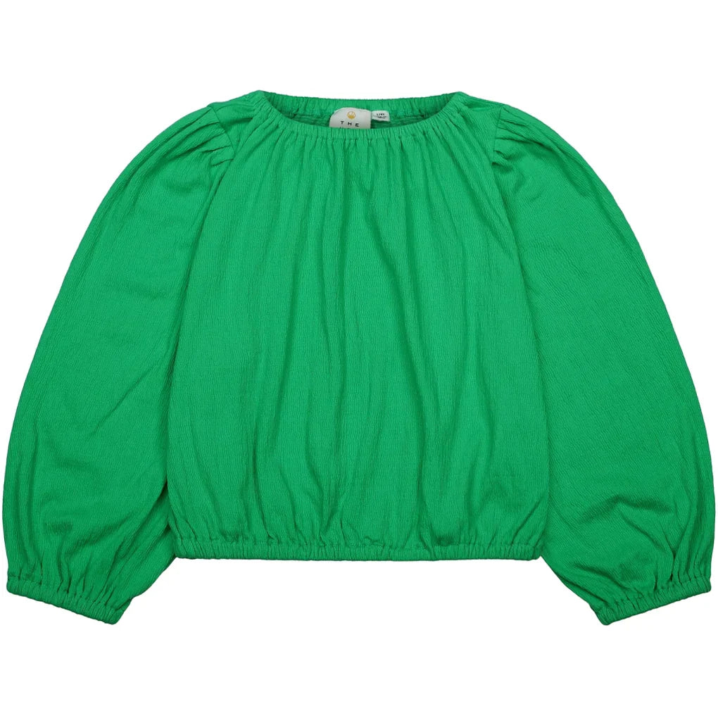 Vibrant green blouse in a beautiful crêpe jersey quality. This girl's blouse from THE NEW has a slightly cropped length, and it is extra voluminous and airy. The snug elastic around the neckline, the bottom hem, and the cuffs add a final touch to its cool and elegant fit. The blouse is crafted from a blend of organic cotton, polyester, and elastane, which renders it soft, breathable, and stretchable. This is a simple yet exquisite blouse that suits both everyday wear and special occasions. Pair it with the matching Heaven Skirt for a stunning green two-piece outfit.
