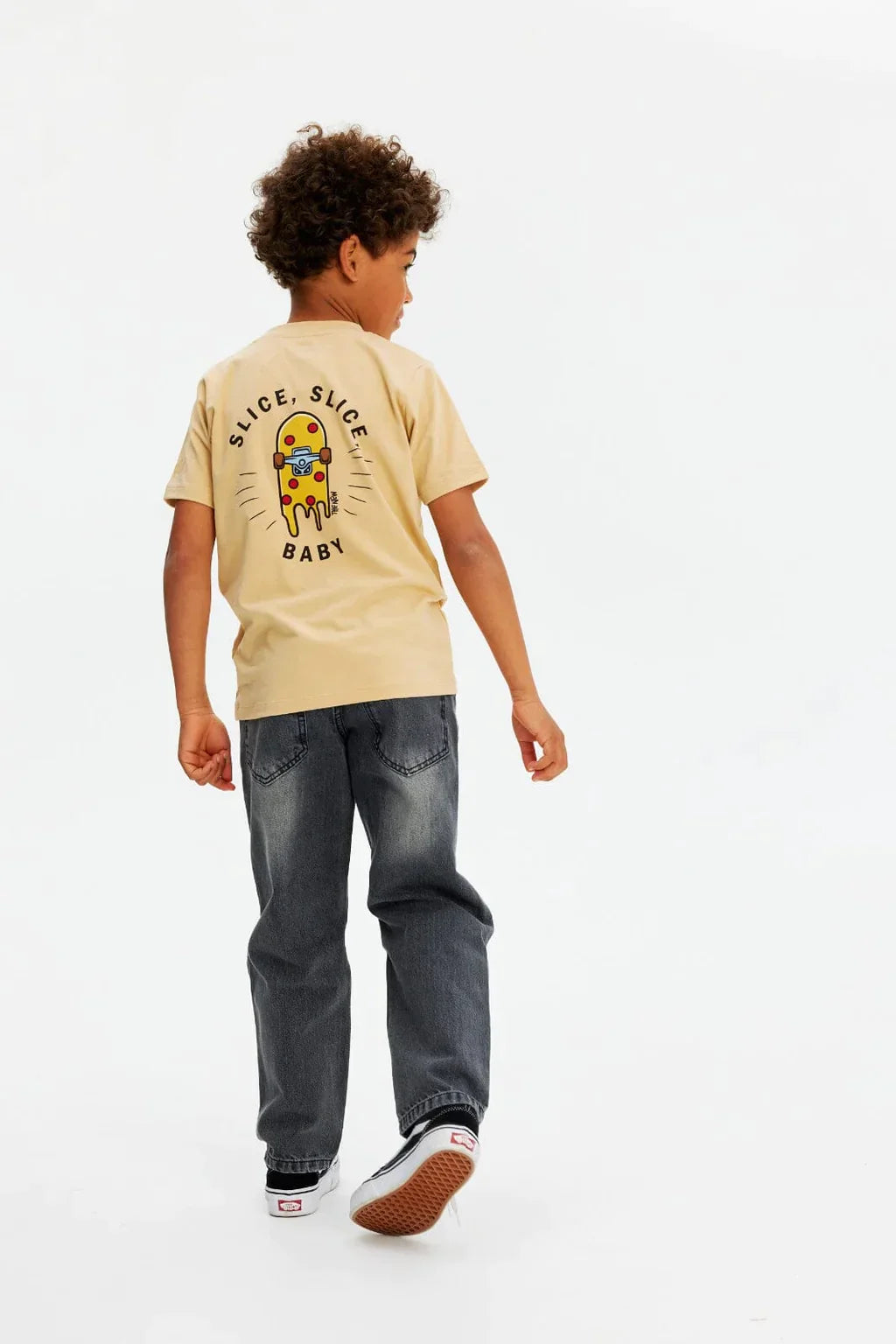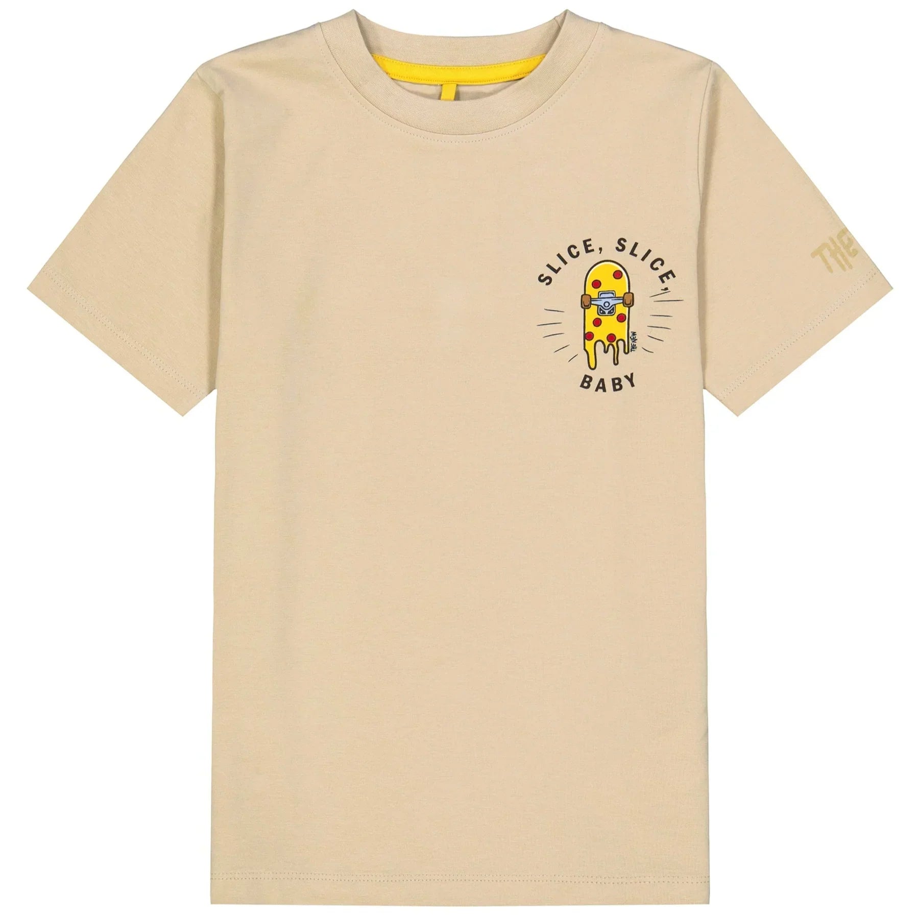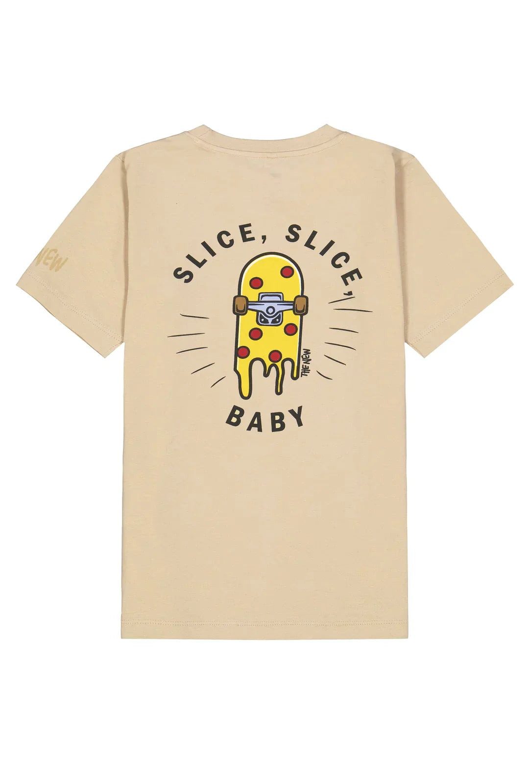 Super cool t-shirt with short sleeves for kids from THE NEW. This one in a nice light brown colour with a print on the left chest of a pizza slice with skateboard wheels and the text; 'Slice, Slice Baby' as well as a large print on the back of the same print and text.