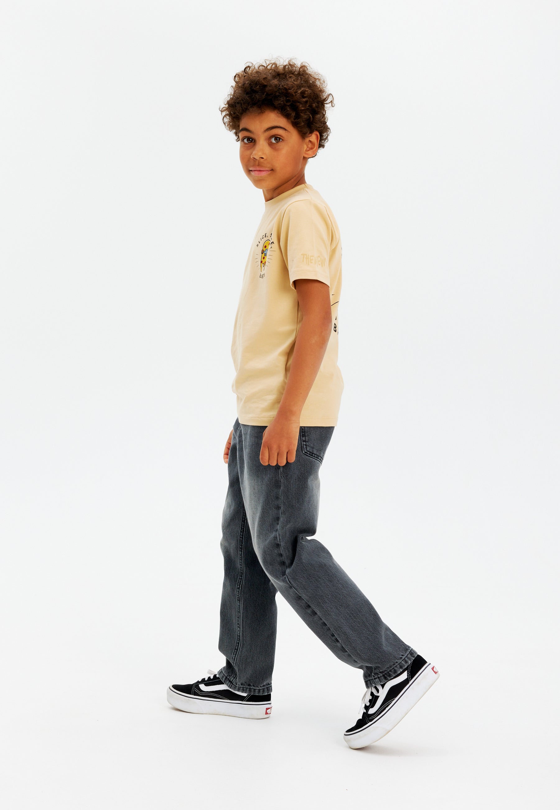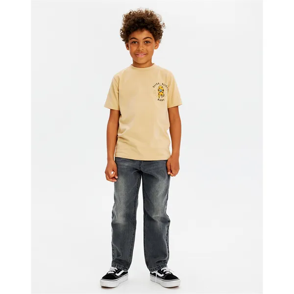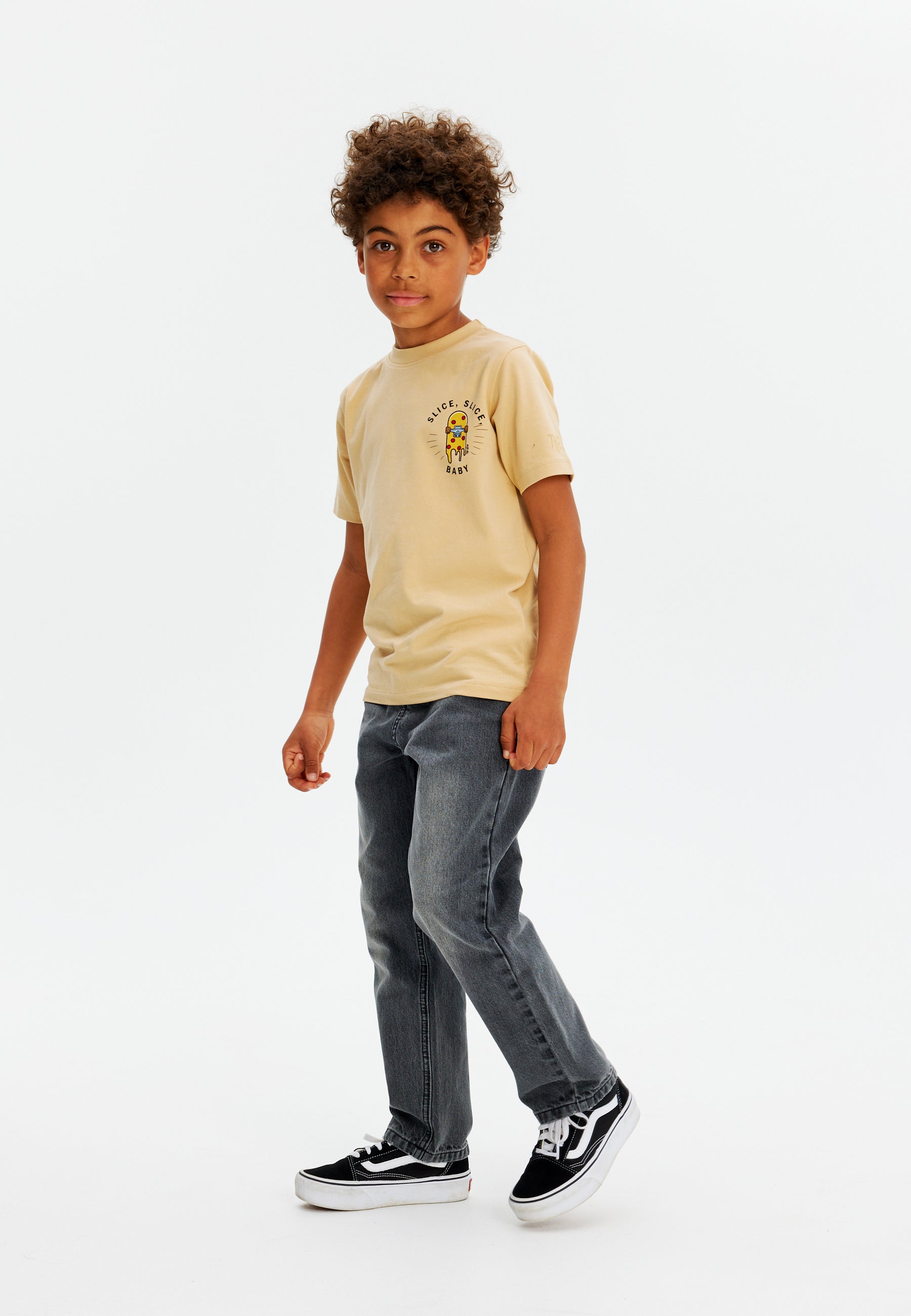 Super cool t-shirt with short sleeves for kids from THE NEW. This one in a nice light brown colour with a print on the left chest of a pizza slice with skateboard wheels and the text; 'Slice, Slice Baby' as well as a large print on the back of the same print and text.