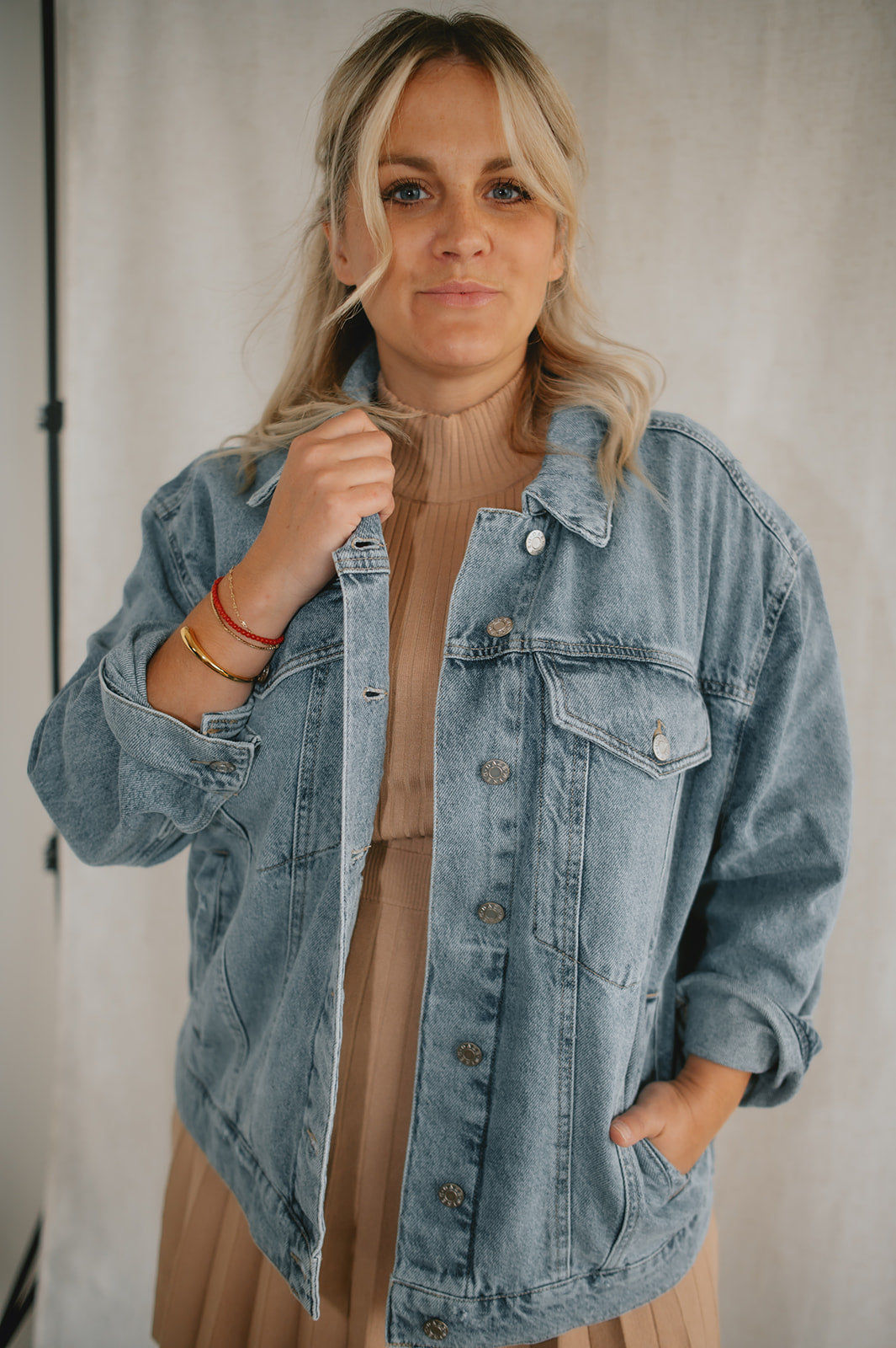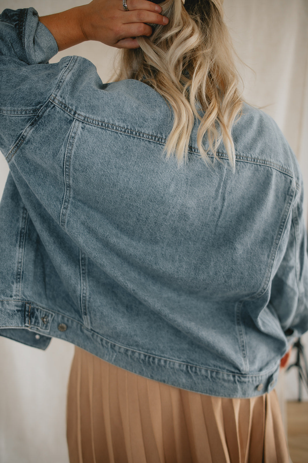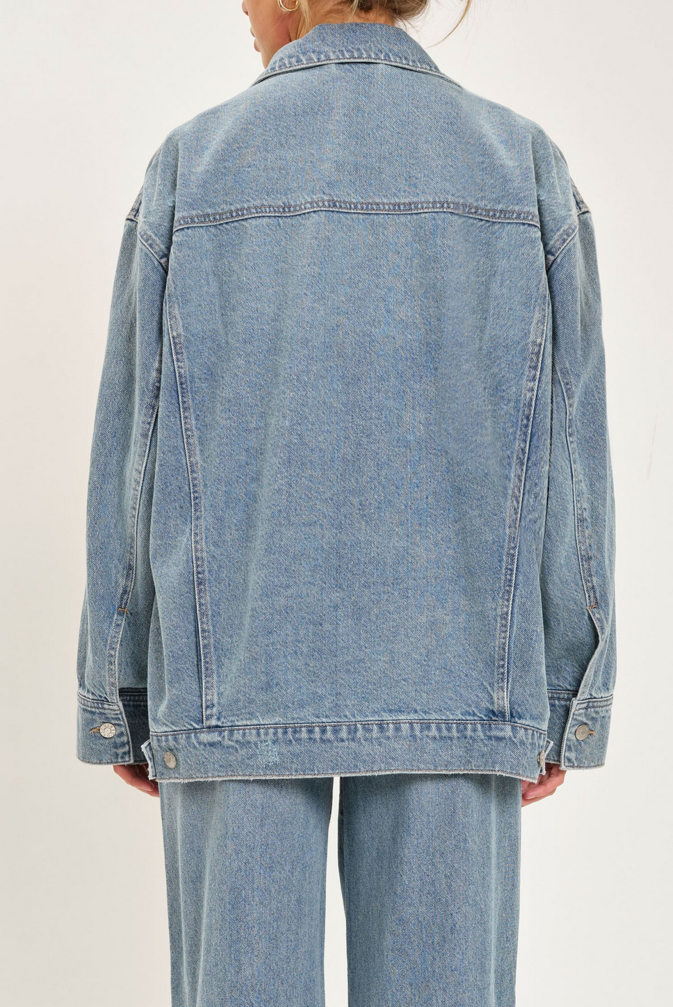 This relaxed denim jacket is the perfect throw-on-and-go complement to any outfit. With a an oversized, "boyfriend" inspired fit, it keeps its structure from 100% cotton and features a versatile medium wash.