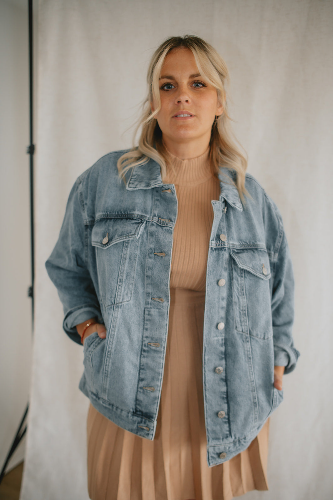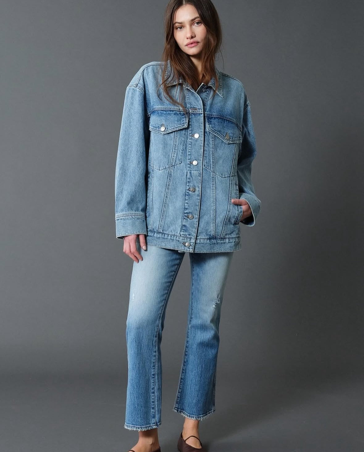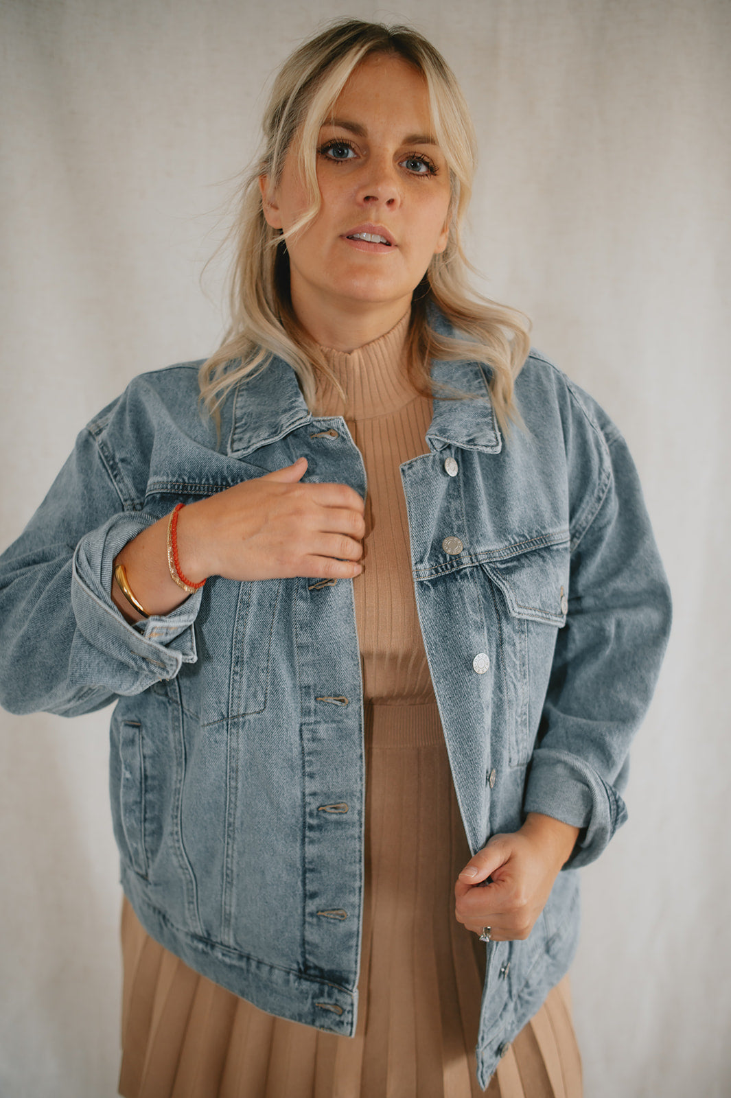 This relaxed denim jacket is the perfect throw-on-and-go complement to any outfit. With a an oversized, "boyfriend" inspired fit, it keeps its structure from 100% cotton and features a versatile medium wash.