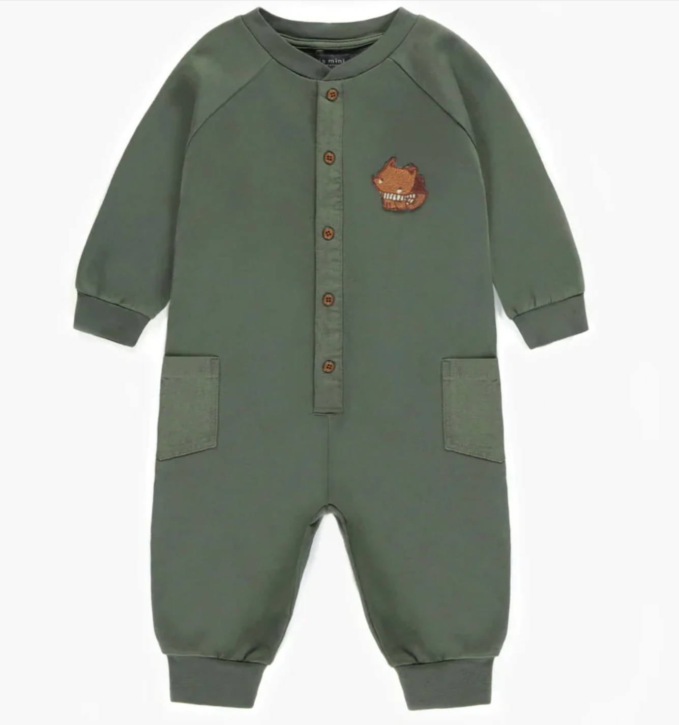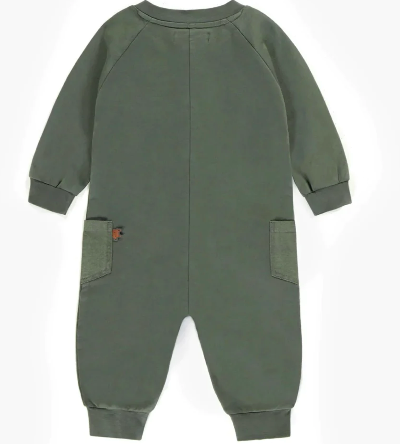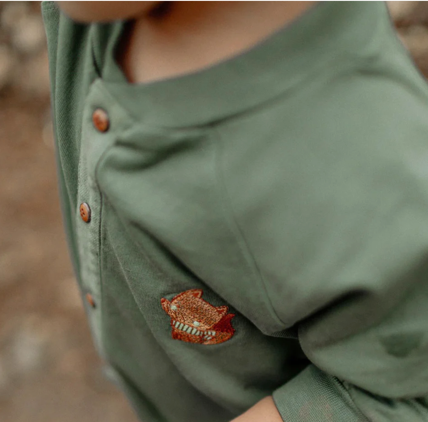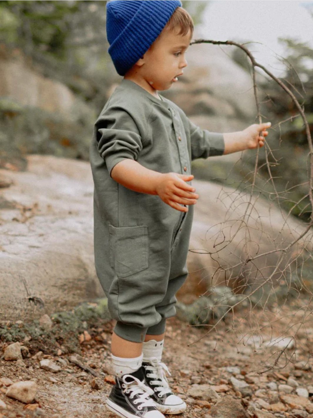 This is a practical and comfortable khaki one-piece baby, made of soft French cotton jersey. This garment has a unisex and timeless style.