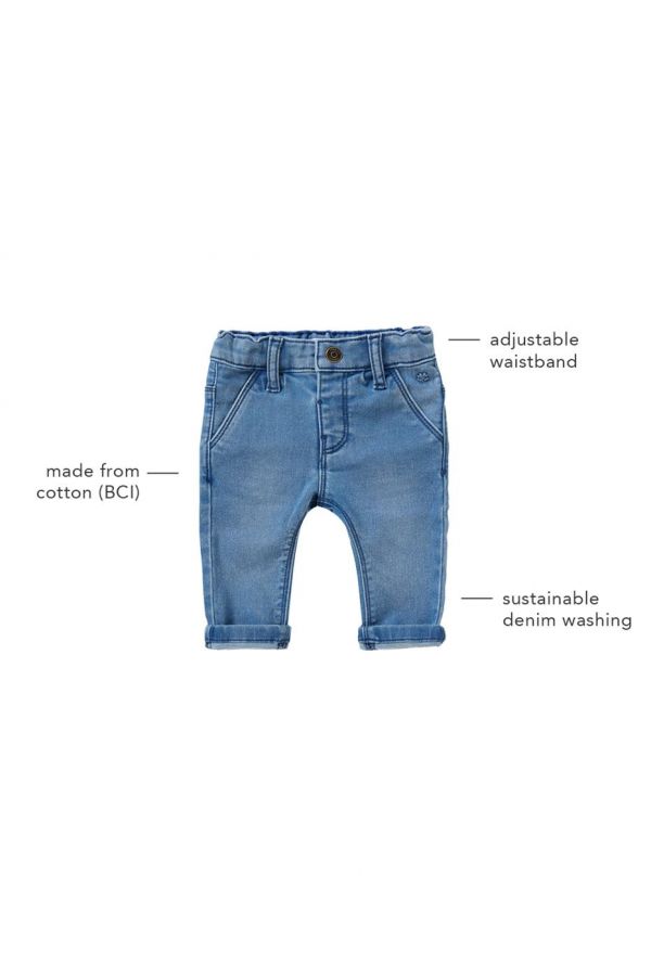 Your newborn's first pair of jeans! The Blue Point Jeans from the Noppies Baby collection are made from a stretchy denim fabric treated with a durable washed effect. These relaxed fit jeans have an adjustable waistband with a press stud, so they stay nicely in place. Bonus: the inside trouser legs are wonderfully soft, so they feel pleasant on your baby's sensitive skin. This garment has been treated with a special washed effect, which gives it a unique, funky look. Please note: make sure you wash this item separately before use. That’s because it may stain lighter-coloured fabrics to start with.