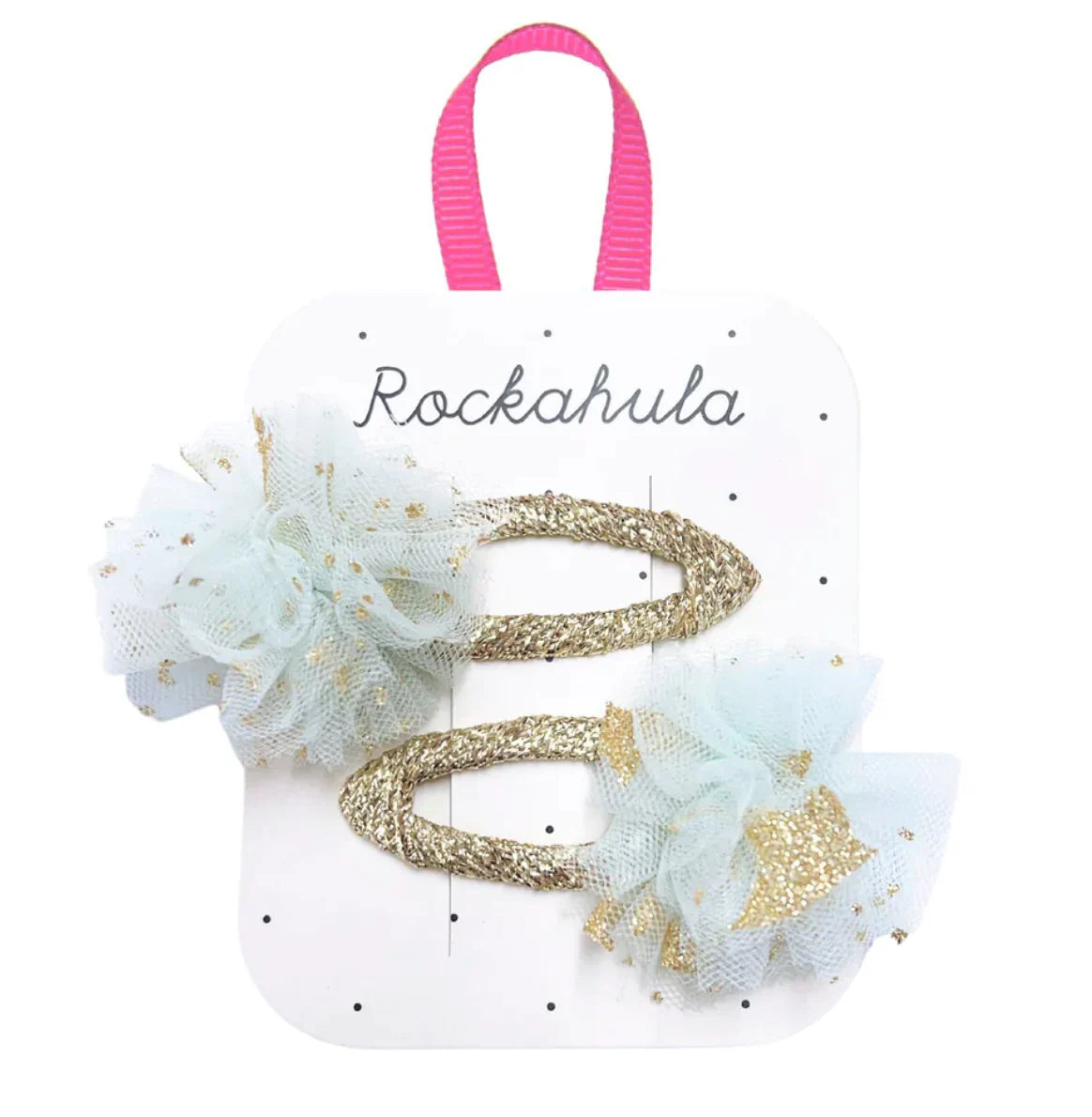 Our gorgeous tulle ruffles are scattered with glittery gold stars and are sat upon two shimmering gold ribbon wrapped snap clips. Perfect for party season!