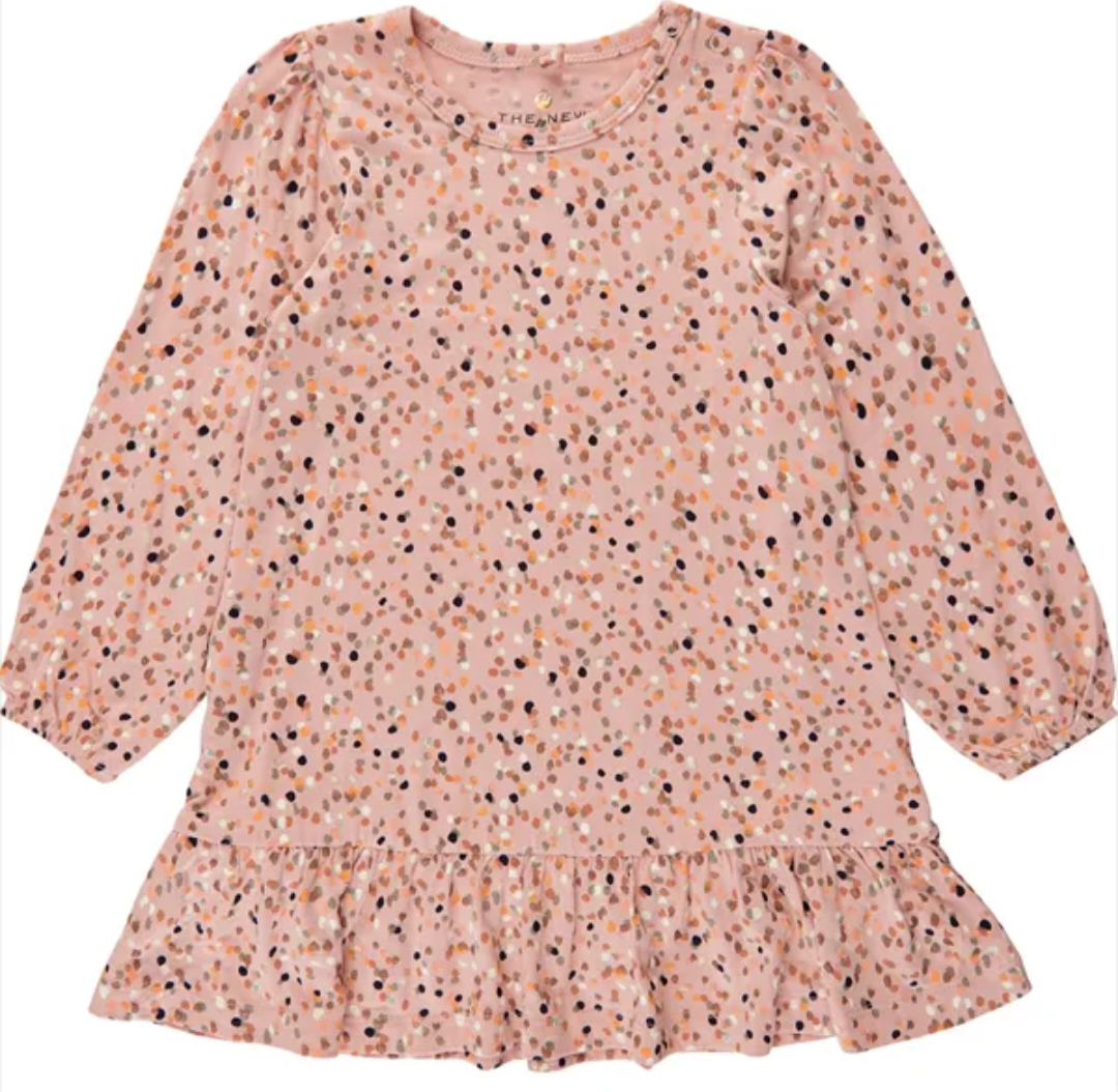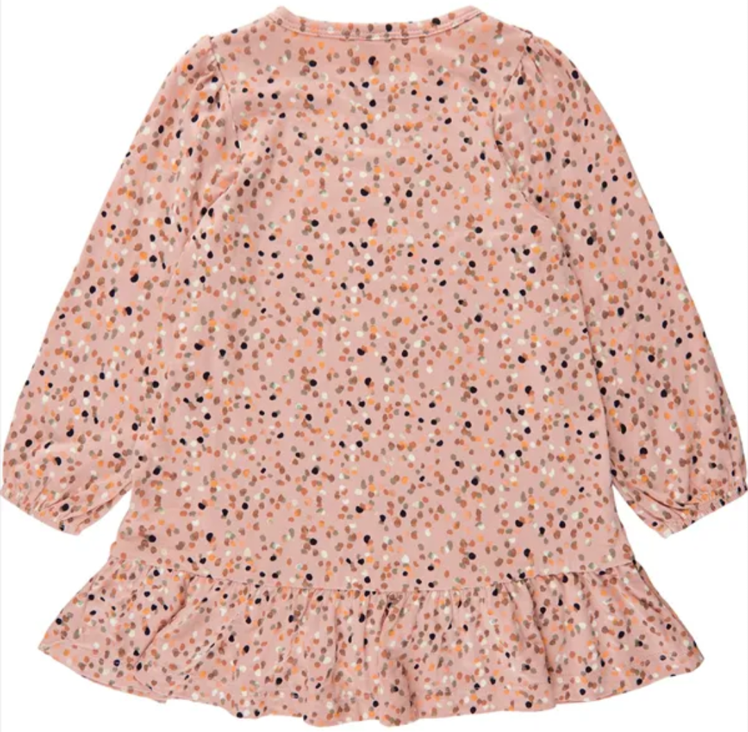Beautiful The New Siblings dress in pink, with dots in different colours and gold glitter all over.