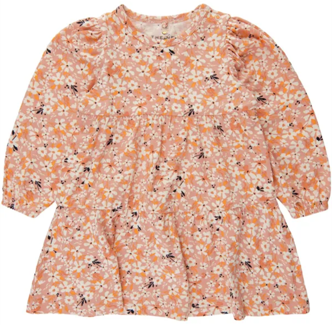 Beautiful The New Siblings dress in pink, with a print of flowers in orange, white and black all over.
