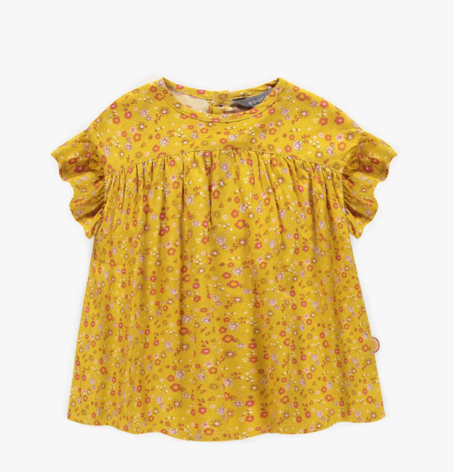 Yellow dress with short sleeves and ruffles made of 100% viscose. The floral pattern is a must for summer. Loose fit but adjusted at the waist. Pleated effect and ruffle at the bottom. Snaps on the back to help put it on. Perfect for park dates and market trips!