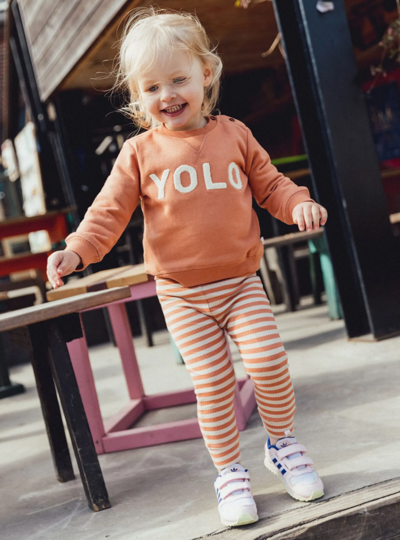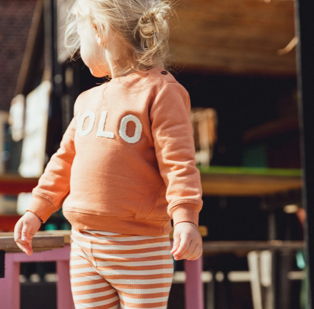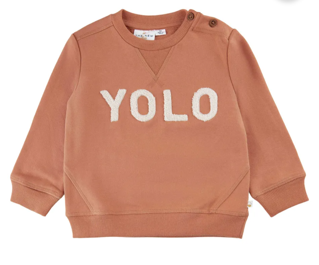 The New Siblings sweatshirt in brown with an orange tint, with YOLO text in soft terry cloth on the front in beige.