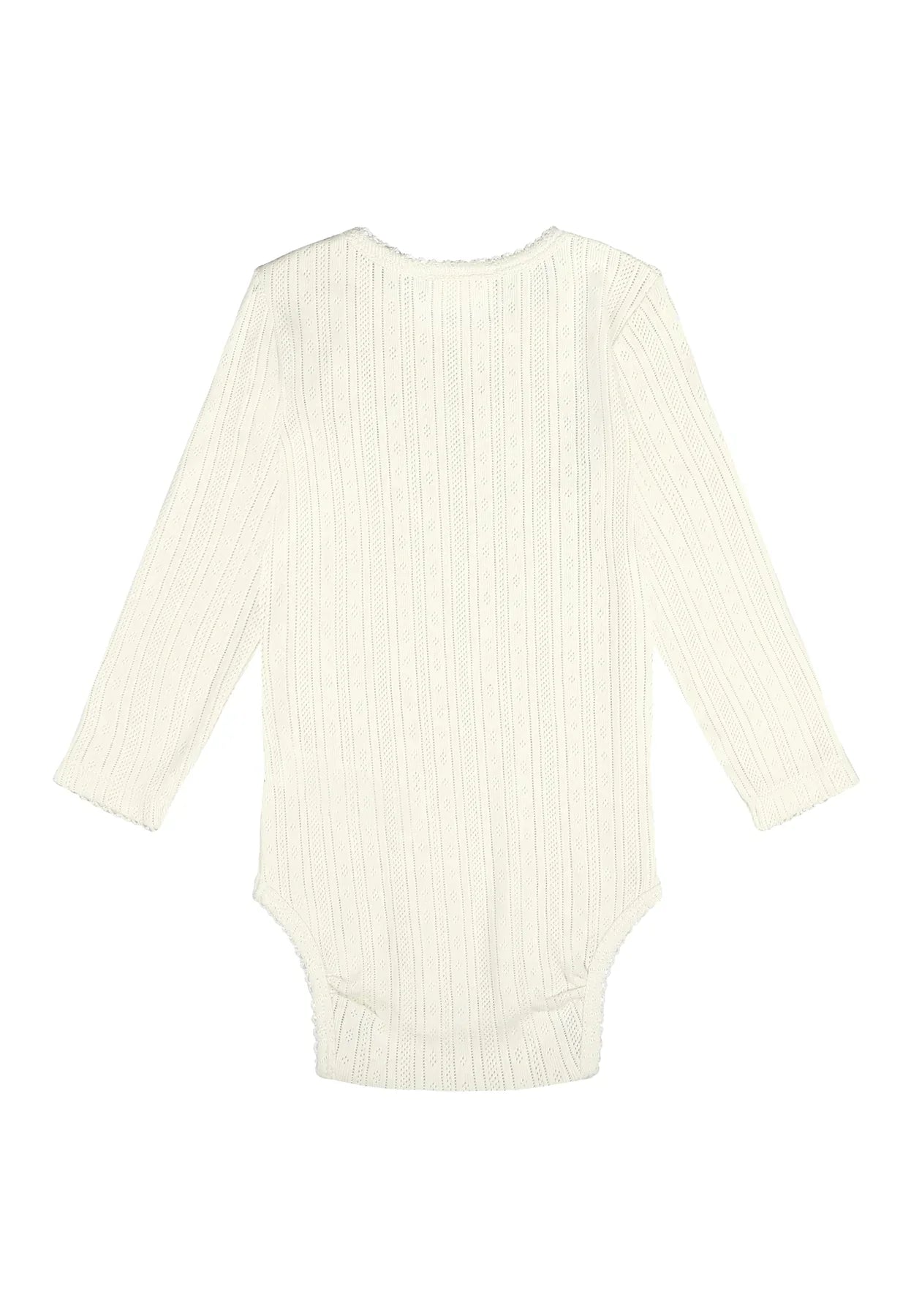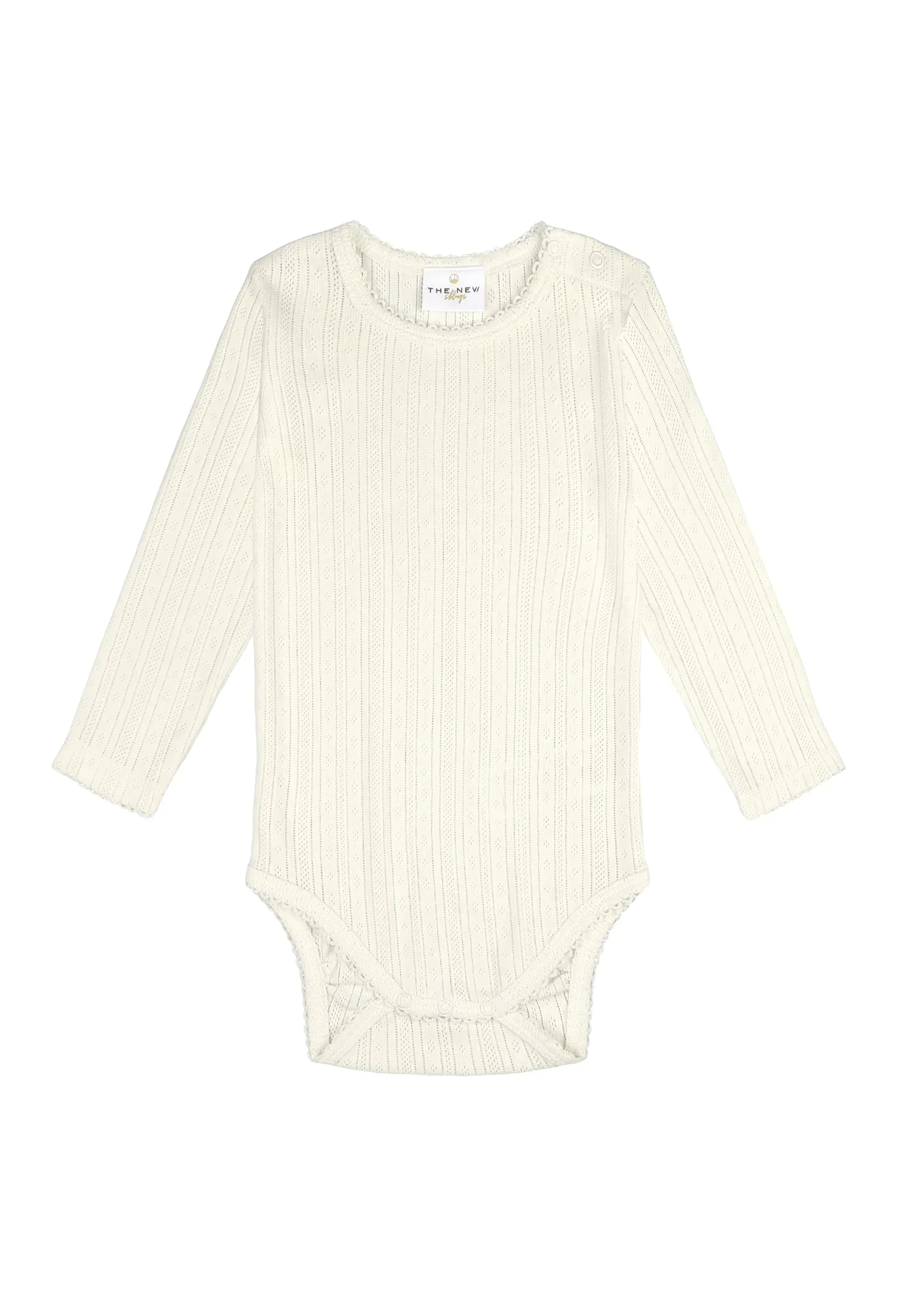 Adorable white bodysuit in a delicate pointelle knitted pattern with tiny holes, which makes the bodysuit incredibly airy and lightweight. It is made purely from organic cotton, to avoid harmful chemicals, and ensure it is soft and breathable. Pair it with the Jin Skirt for a cute Spring outfit!