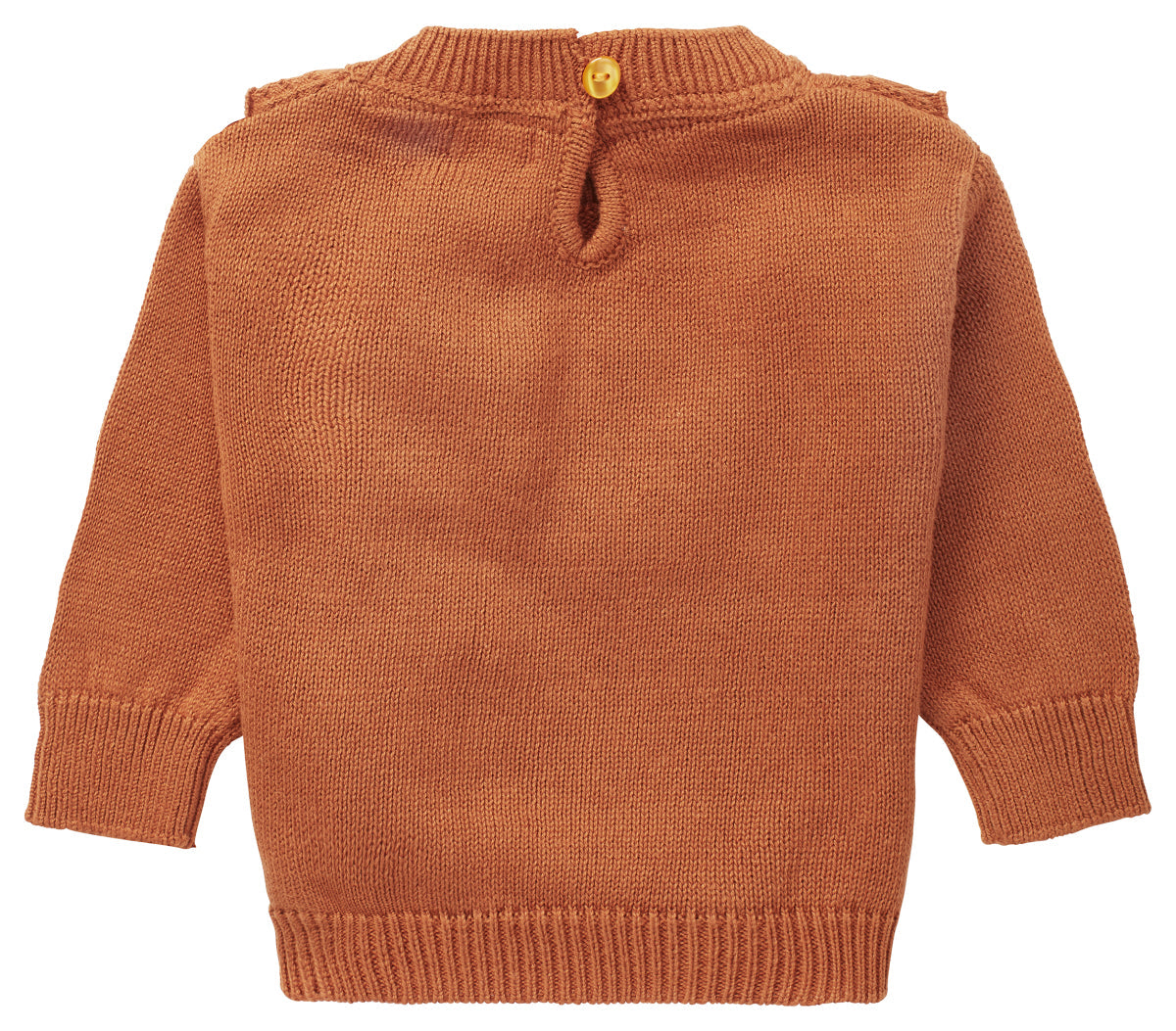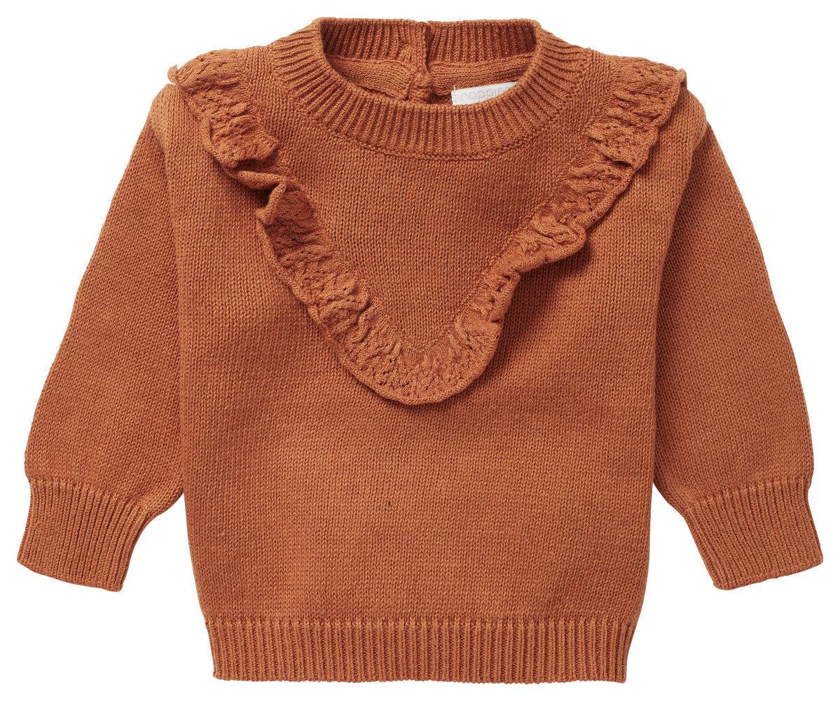 The Jayla Sweater is a beautiful, fine-knit sweater. The openwork V-shaped ruffles on the chest have given this sweater a great classic look. There is a keyhole with a button on the back, making sure pulling the sweater over their little head is nice and easy.
