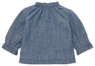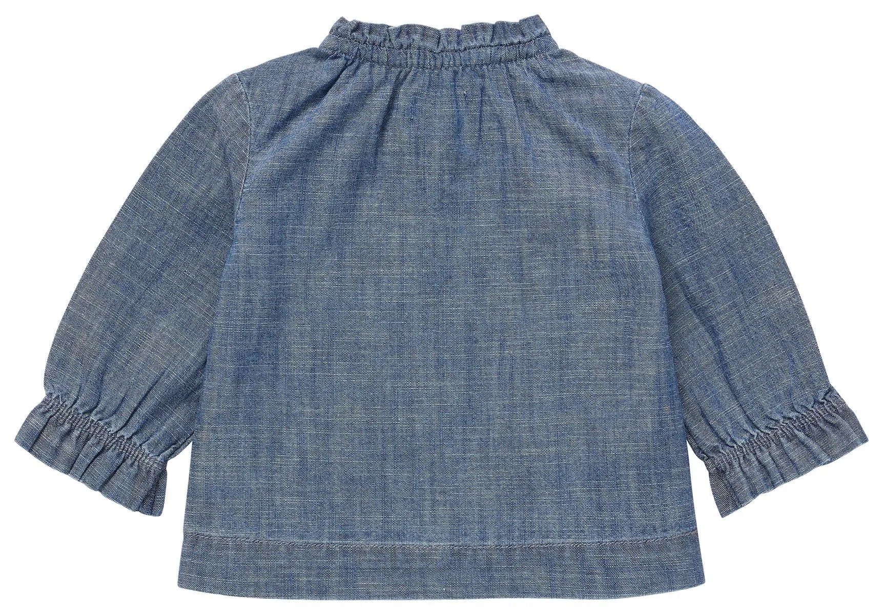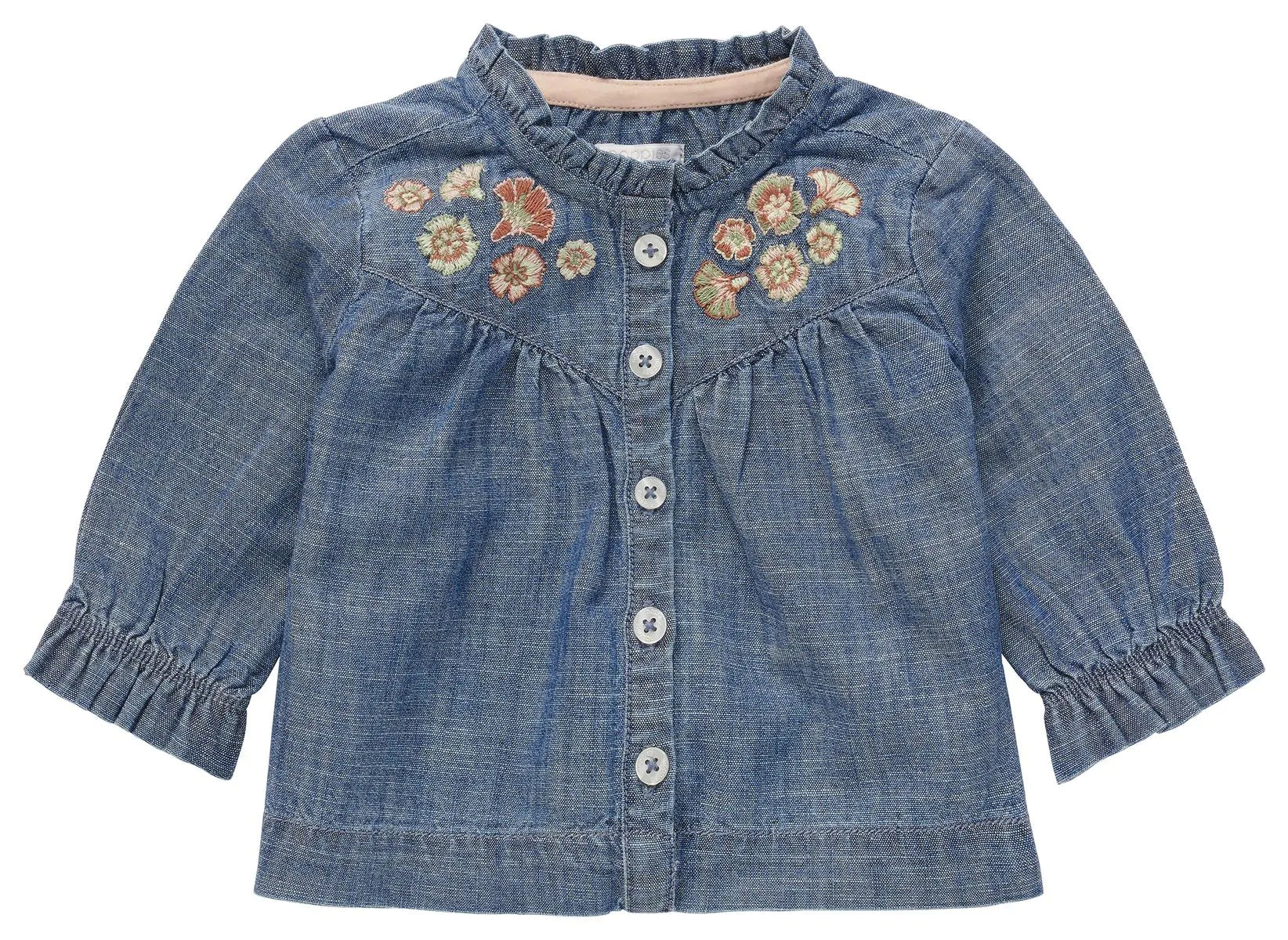 Sweet denim blouse from the Noppies Baby collection. The Lexington blouse features an upright ruffled collar and elasticated sleeve cuffs with a ruffled edge. The flowers depicted on the chest have resulted in a cool retro twist.The buttons will make getting changed and dressed nice and easy!