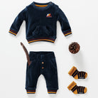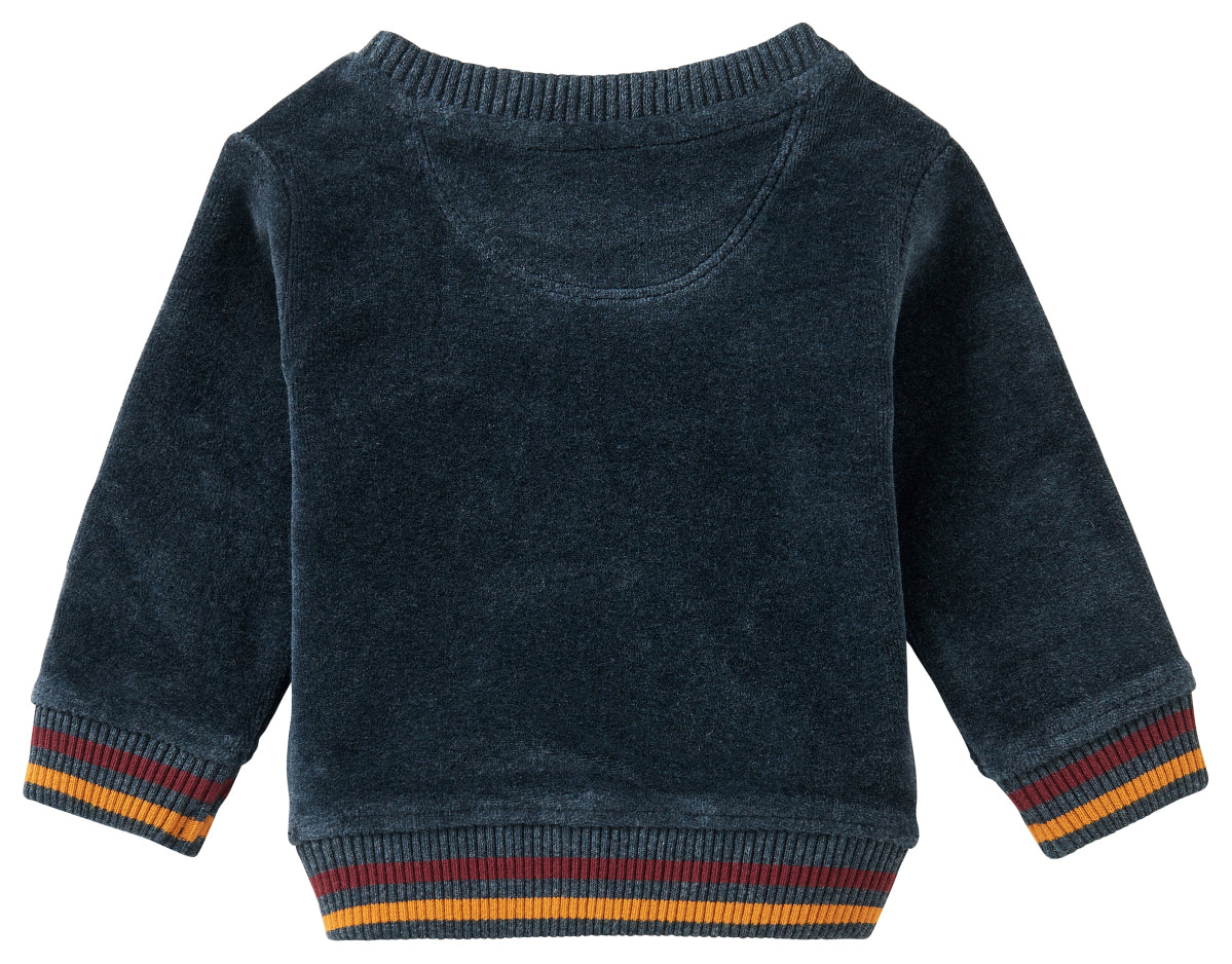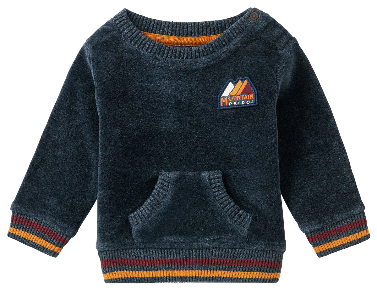 Your little one is the very latest member of the Baby 'Mountain Patrol'! He will feel fantastic in this soft and super ‘cuddly’ sweater from our new collection. The sweater features a round neckline with a handy press stud, a ribbed neckline, cuffs and hem. There is a red and yellow stripe on the cuffs and hem. The sweater also includes a cute pouch on the tummy. You will find a 'Mountain Patrol' logo on the chest and the sweater is made from organic GOTS-certified cotton. Super soft for your little man and perfect for combining with the matching sweater 'The Parow Pant'