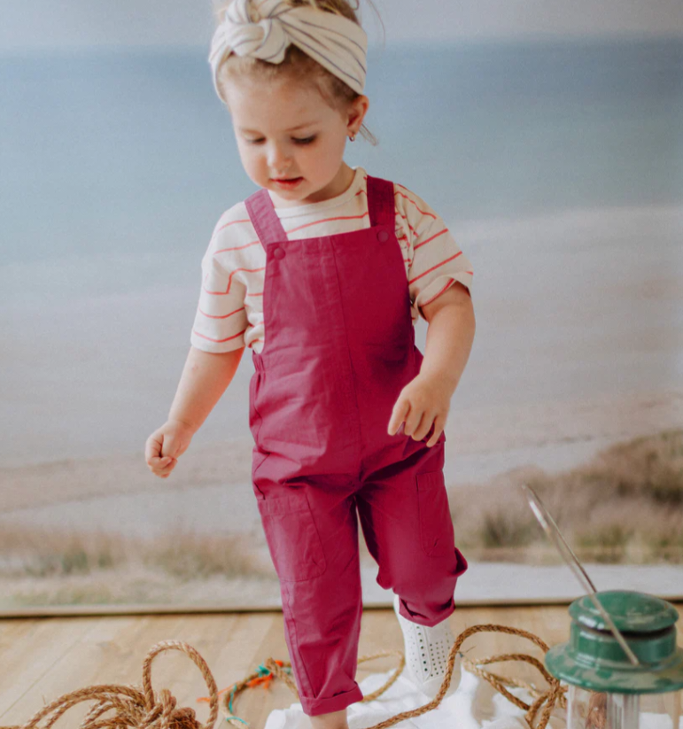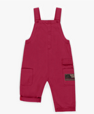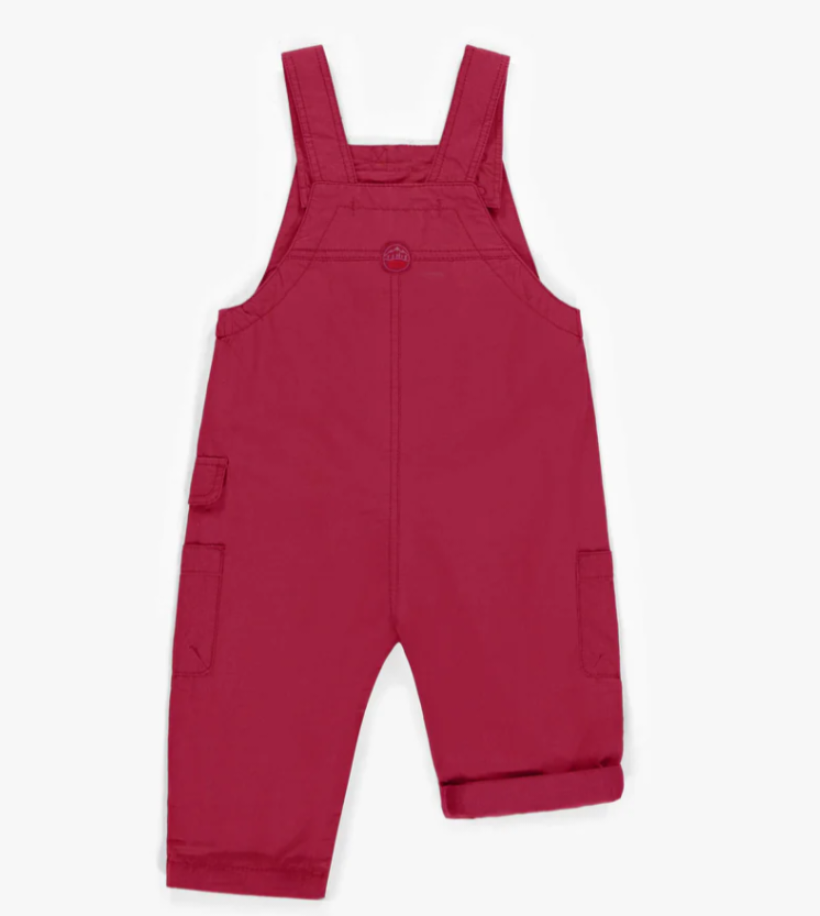 Pink overall with adjustable straps by buttons. An applied pocket on each side. Made in 100% cotton canvas.