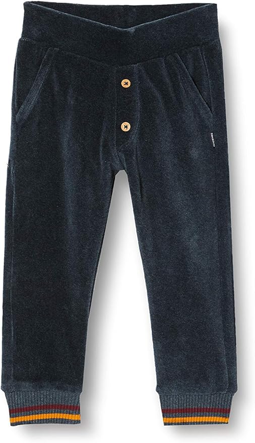 Parow trousers - Discovering the world is a great adventure for the little ones. These trousers are one of the many must-haves. It has an elastic waistband, pockets and wooden buttons. On the ribbed cuffs there is a red and a yellow strip. The super soft fabric has a velvet look, for cuddling.