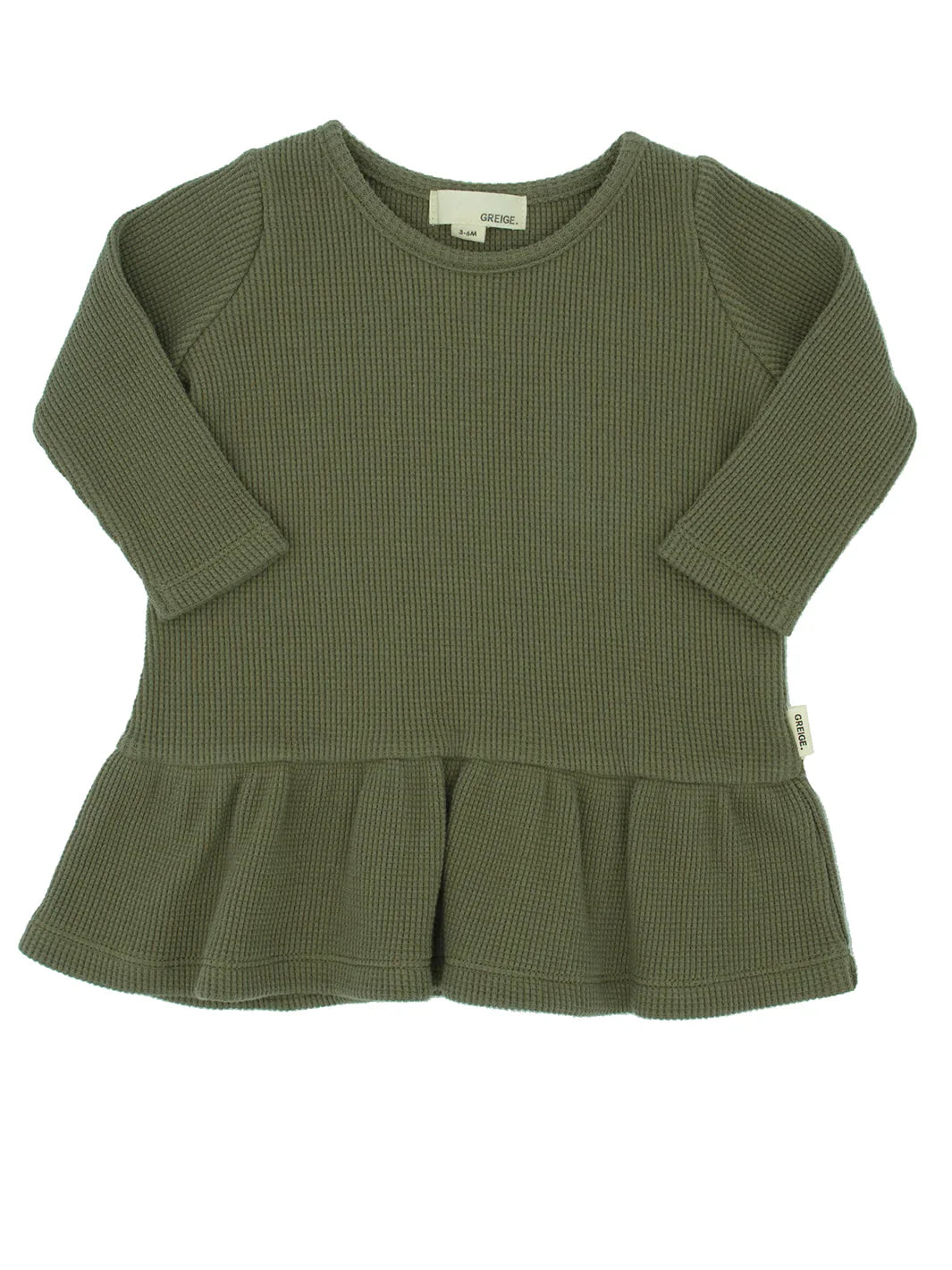 An adorable little top in a waffle textured organic cotton. Matches back perfectly with leggings.