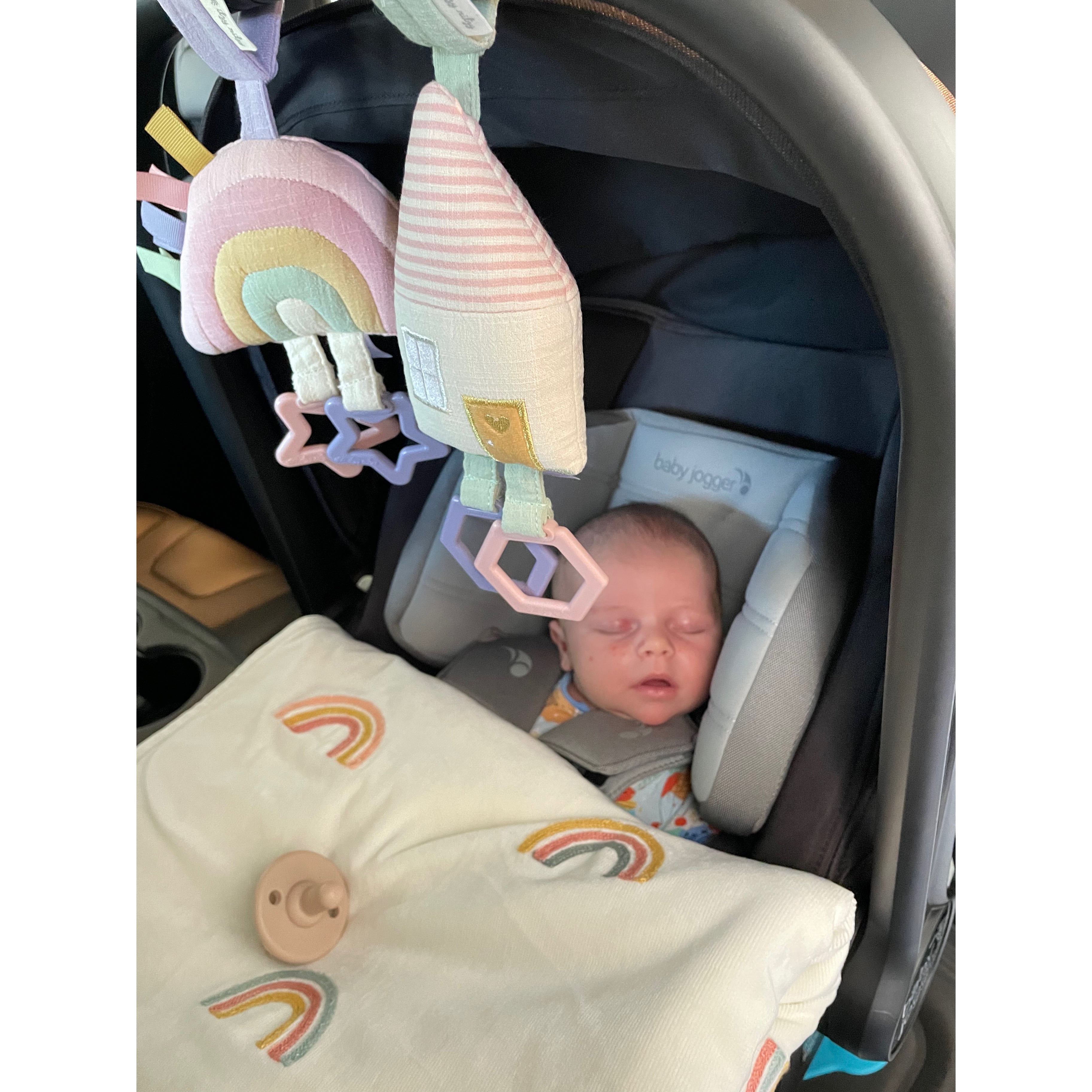 - Attaches easily to car seats, strollers and activity gyms with adjustable hook and loop straps