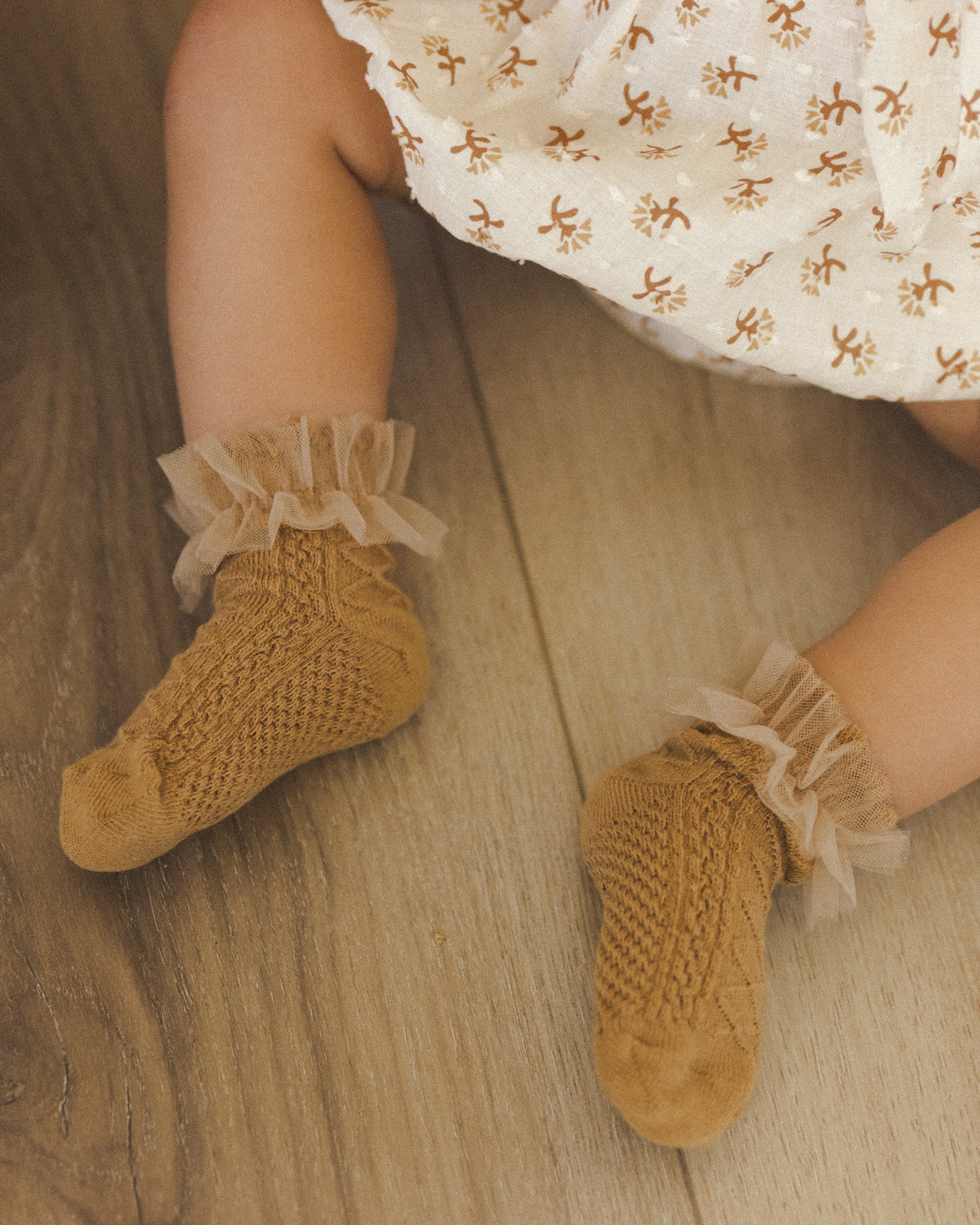 Our cute ruffled socks are made of a soft cotton blend. The ruffle trim make these socks the perfect dressy pair. Featuring our 'golden' & 'ivory' hues.