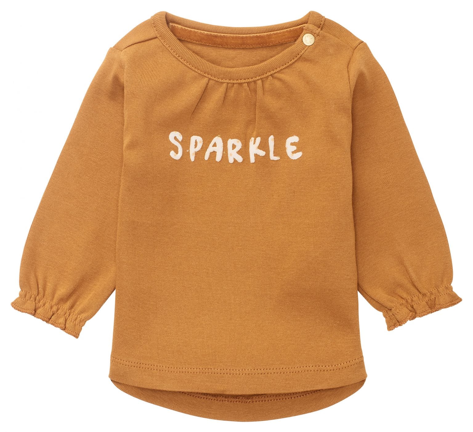 Combines soft mustard with a fun sparkle polka dot print on the graphic. The shirt features a round neckline with a handy press stud, long sleeves with elasticated cuffs and a 'SPARKLE!' on the chest. Let your little one Sparkle!