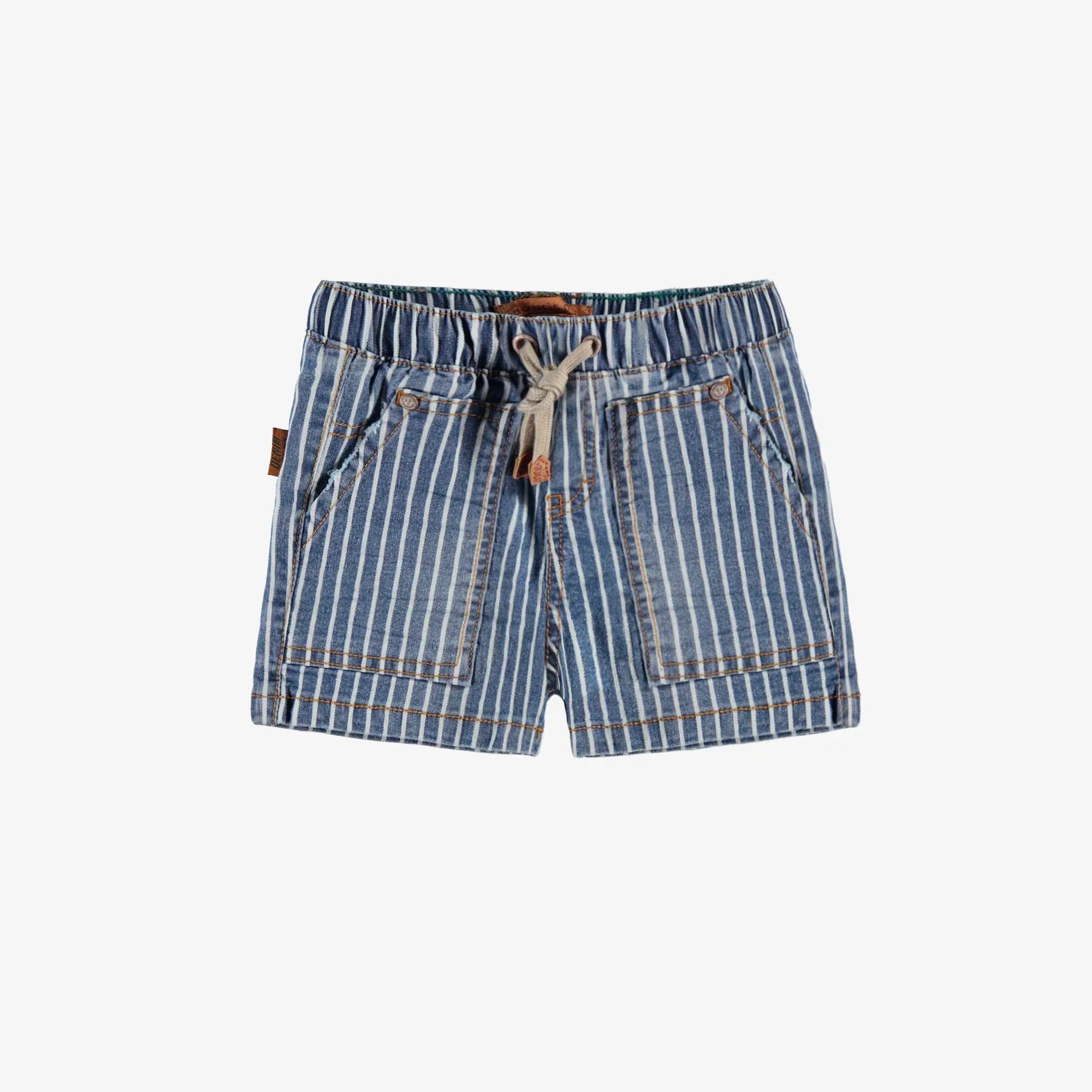 Blue denim shorts with white stripes, featuring two front pockets and one back pocket. Designed with an elastic waistband and an adjustable drawstring for a perfect fit.