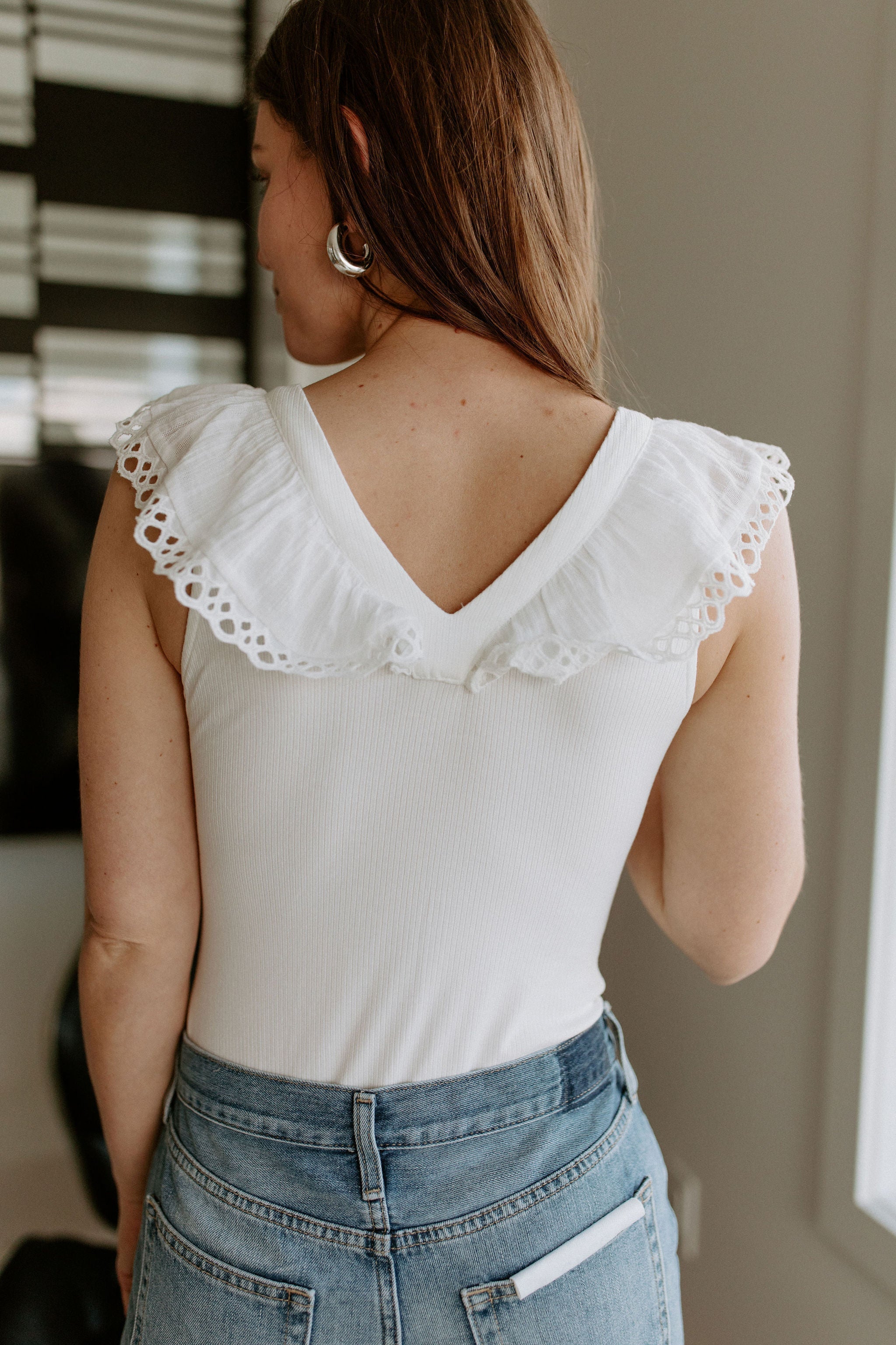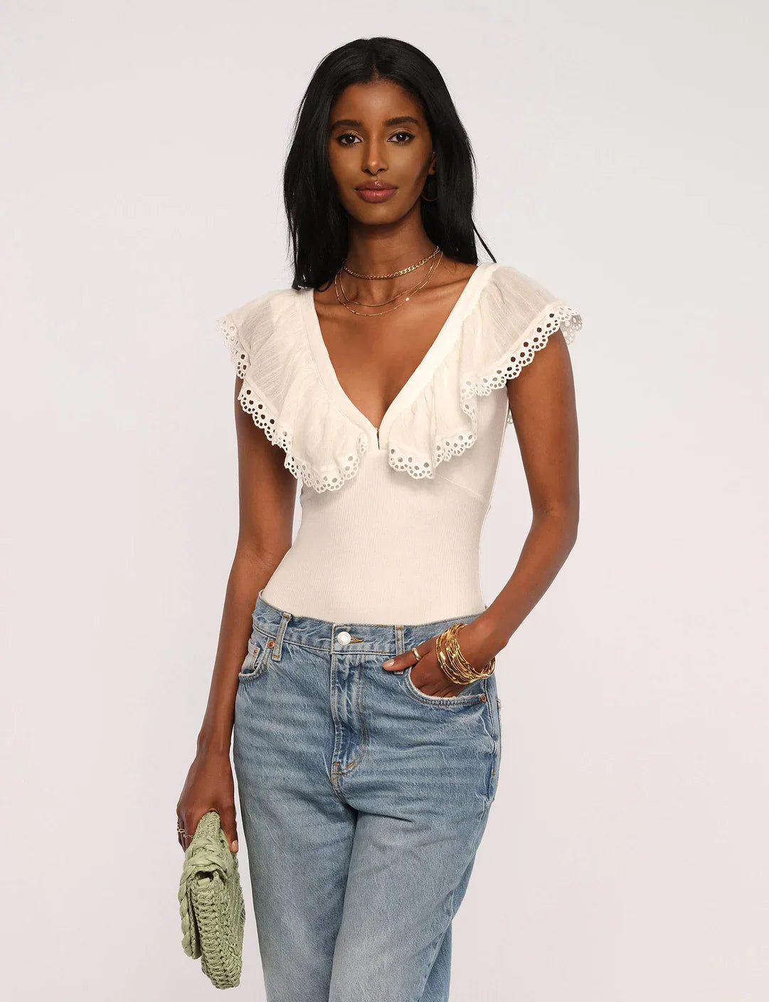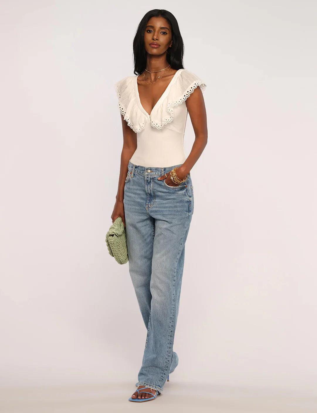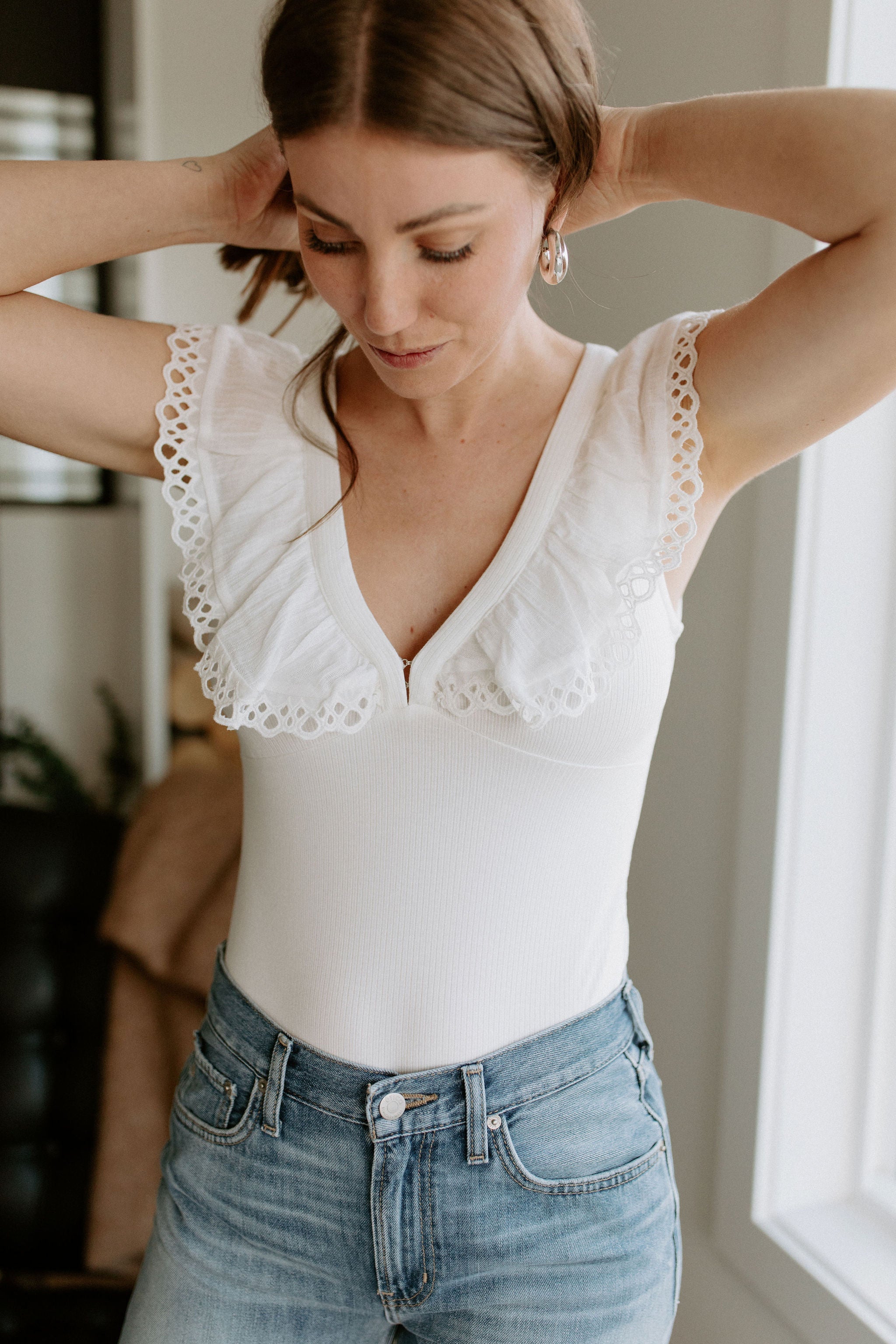 The Deva Bodysuit has a full-coverage bottom that closes with snaps for an adjustable fit. It has a oversized ruffle collar detail and is essential for when you need a seamless fit.
