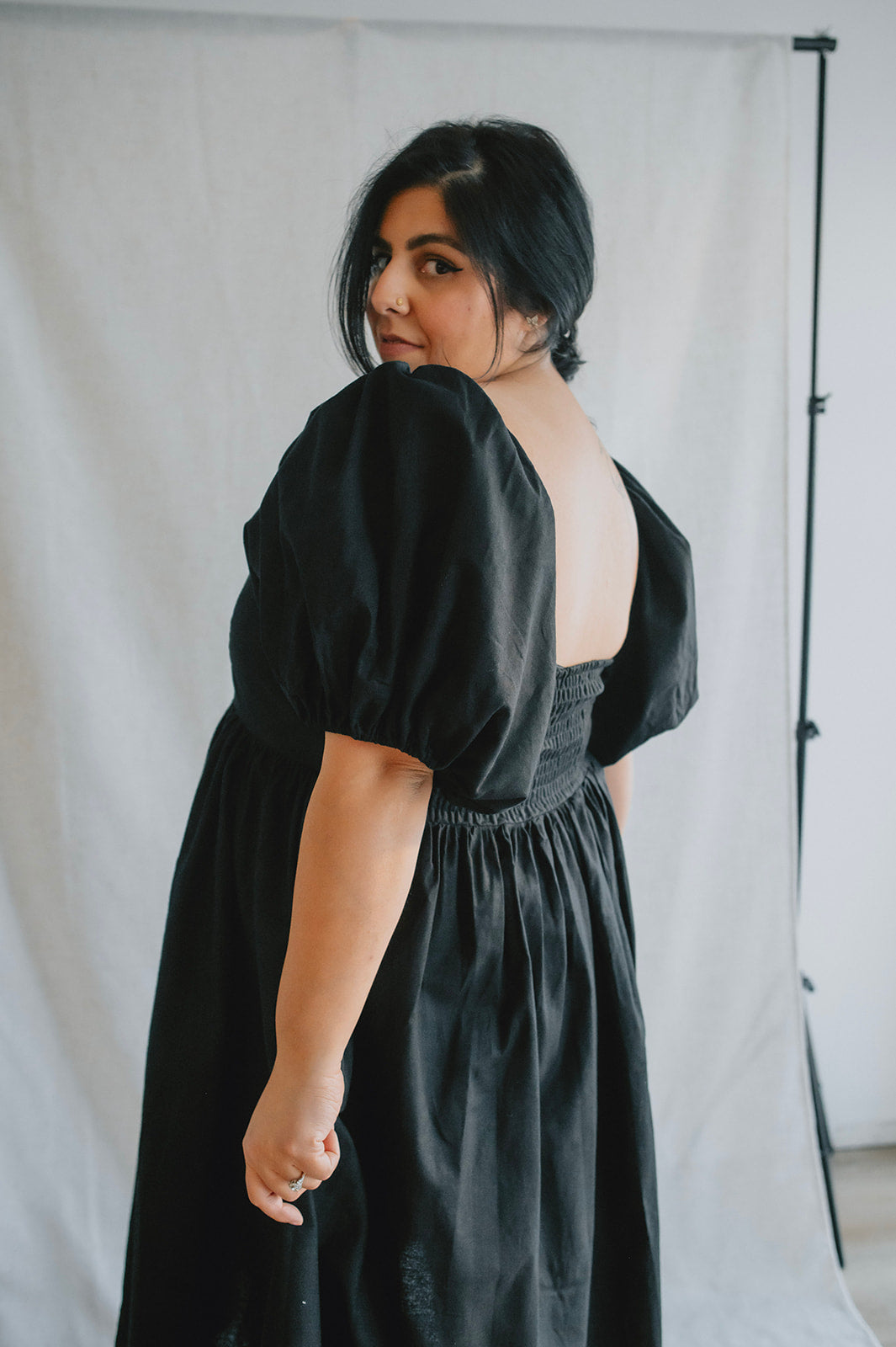 Cut from pure linen for drape and lightness, this romantic midi frock is framed by an on-trend oval neckline and smocked square shape back. Complete the look with tall boots, sneakers, or a heel for year-round wear!