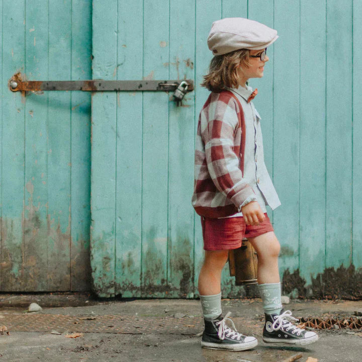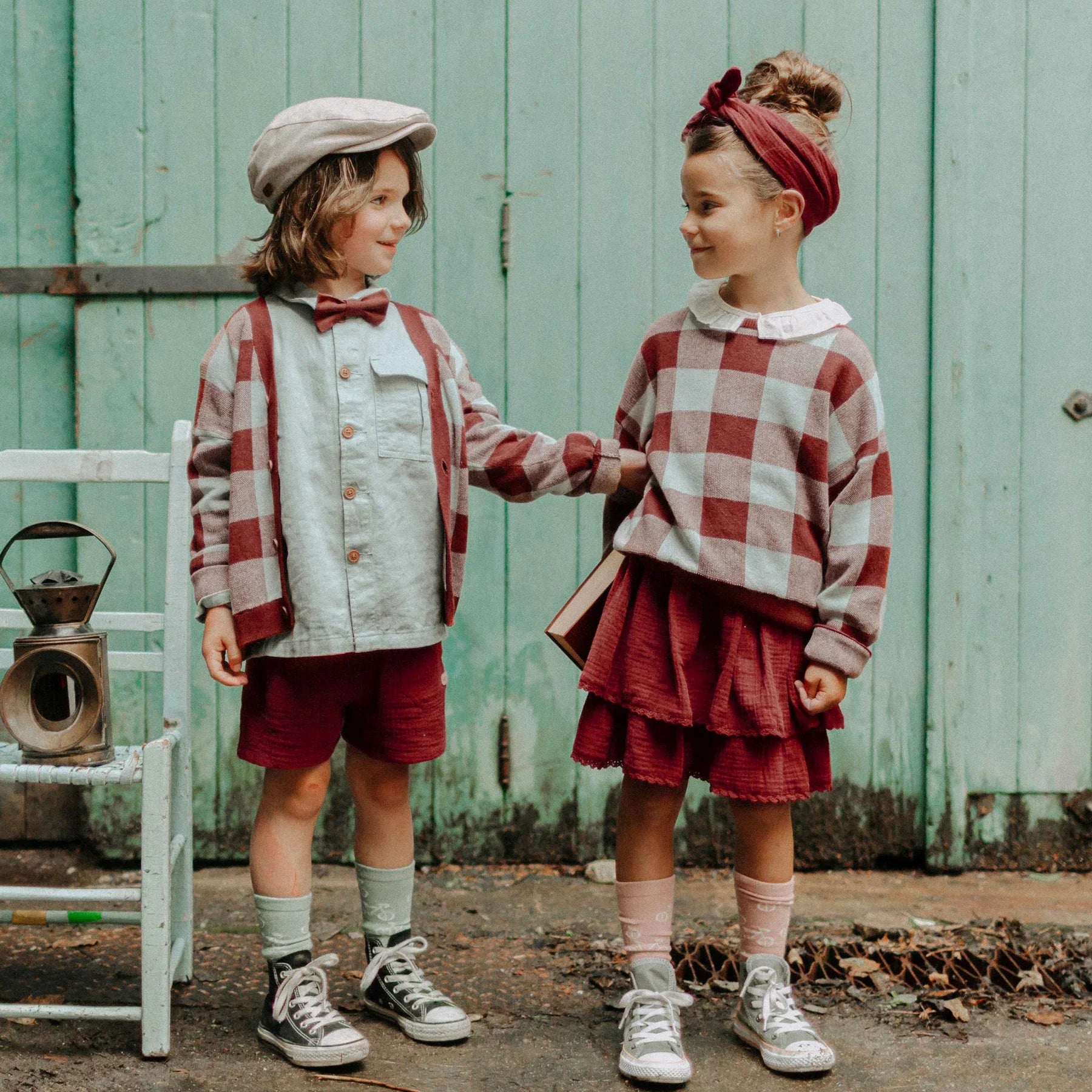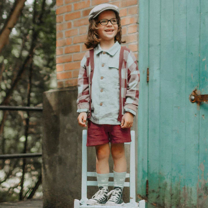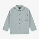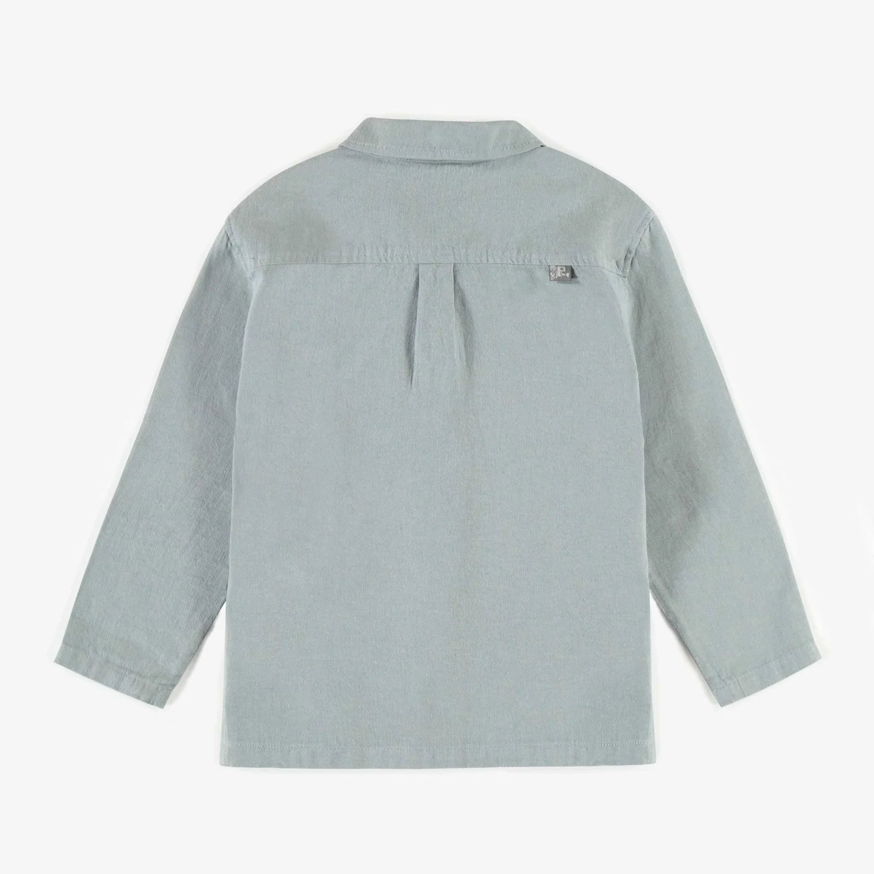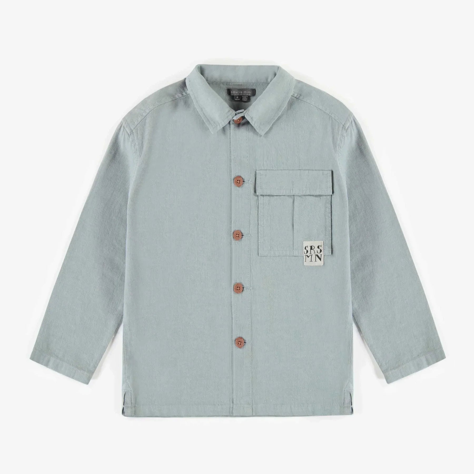 A classic blue shirt with a large applied pocket in front and have buttons to close it. Made in a woven of linen and cotton. Can be folded to make short sleeves shirt. Convenient for overlay.