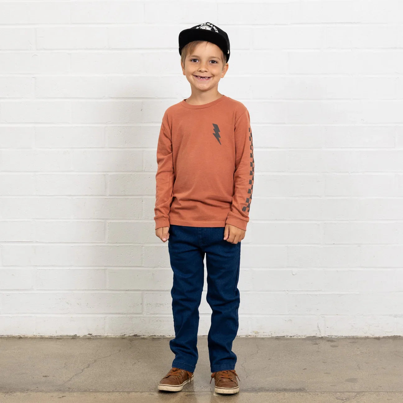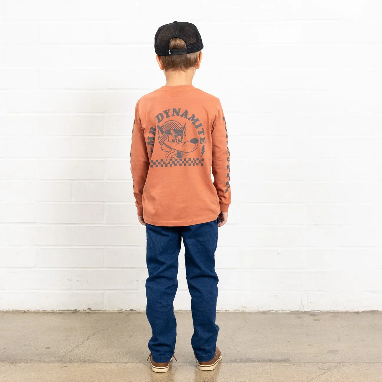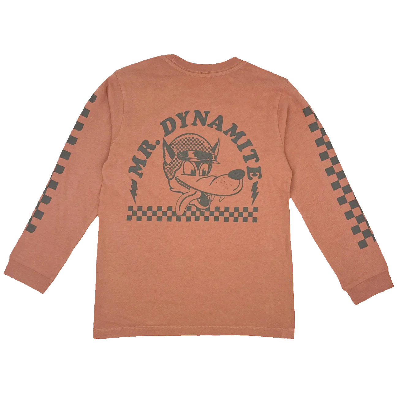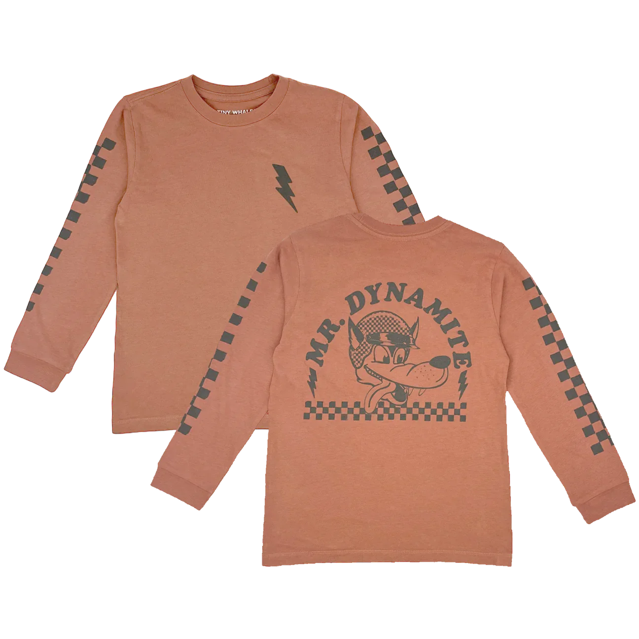 The Mr. Dynamite Long Sleeve Tee brings retro vibes and fun energy to your little one's wardrobe. Made from soft cotton jersey, it features a cartoon wolf in a racing helmet graphic, bold "Mr. Dynamite" text, and lightning bolt accents. Complete with a black racing check border on the sleeves, this tee is a perfect mix of playful and cool.