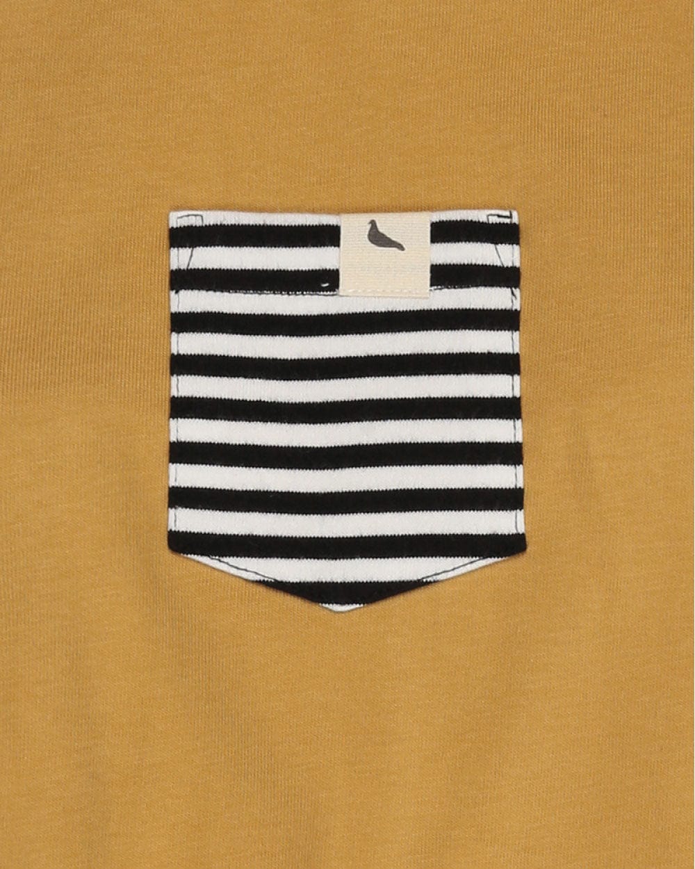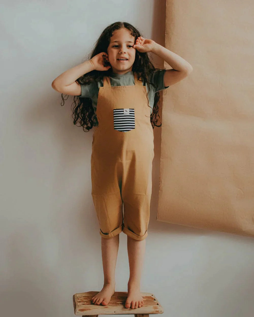 Our best selling organic cotton dungarees but with a short leg version for summer dressing! The relaxed fit shape has a dropped crotch and wider seat for a comfort fit. The straps fasten to a lower cut back and can be adjusted to two button positions for extra growing room. These sunny coloured dungarees look great worn back with one of our tops for cooler days too. Contrast monochrome stripe pocket to chest and button fastening straps for easy dressing.