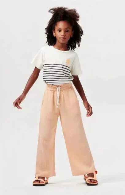 These light and airy trousers from the Noppies Kids collection are lovely to wear on a warm spring or summer day. The Poinciana trousers feature a relaxed, looser fit and comfy pockets. The tie ribbon in the elasticated waistband is made so that it can’t get pulled out whilst tightening. The trousers are made from wonderfully soft and light, stretchy cotton.