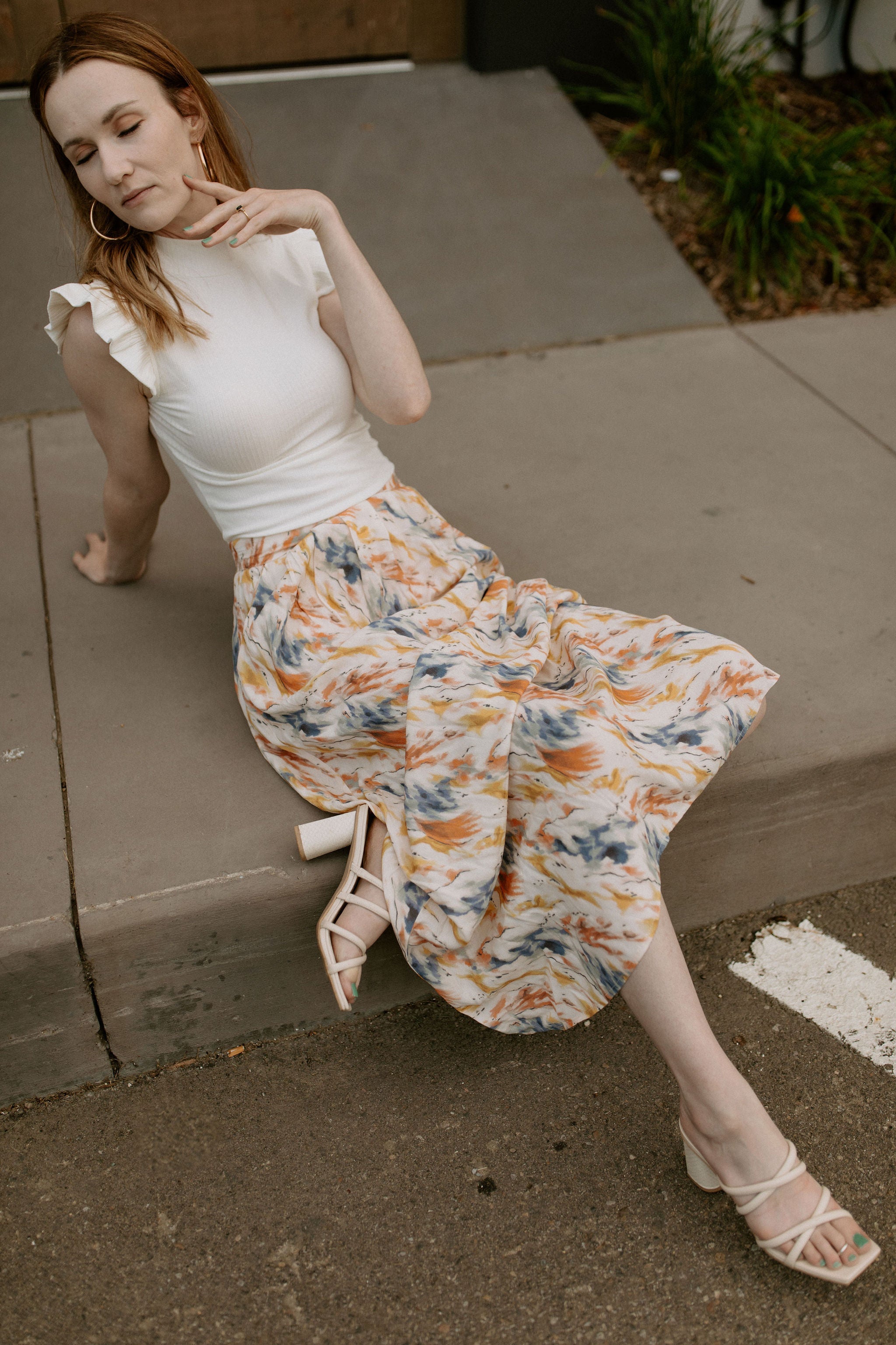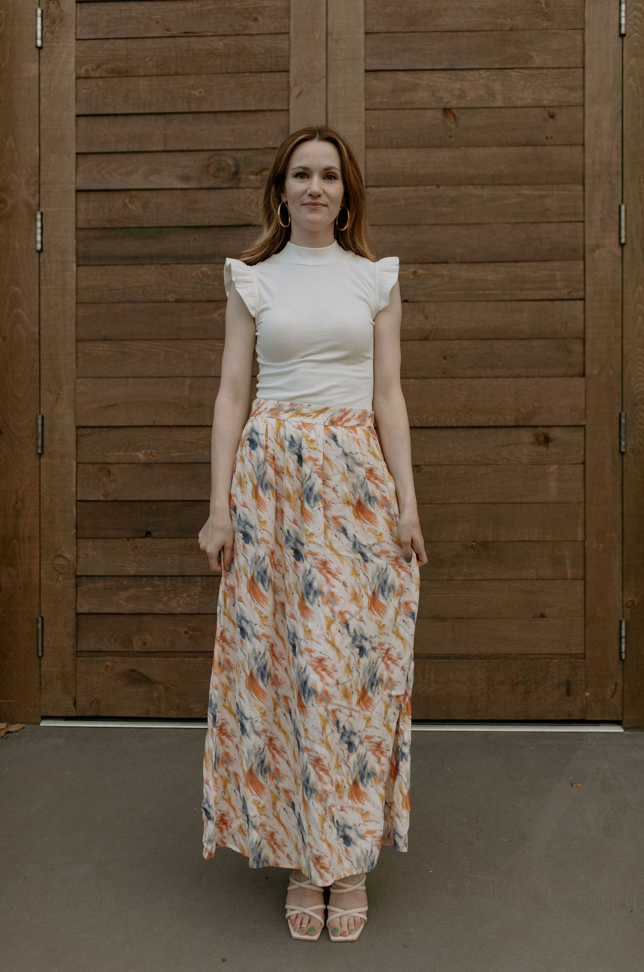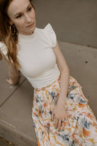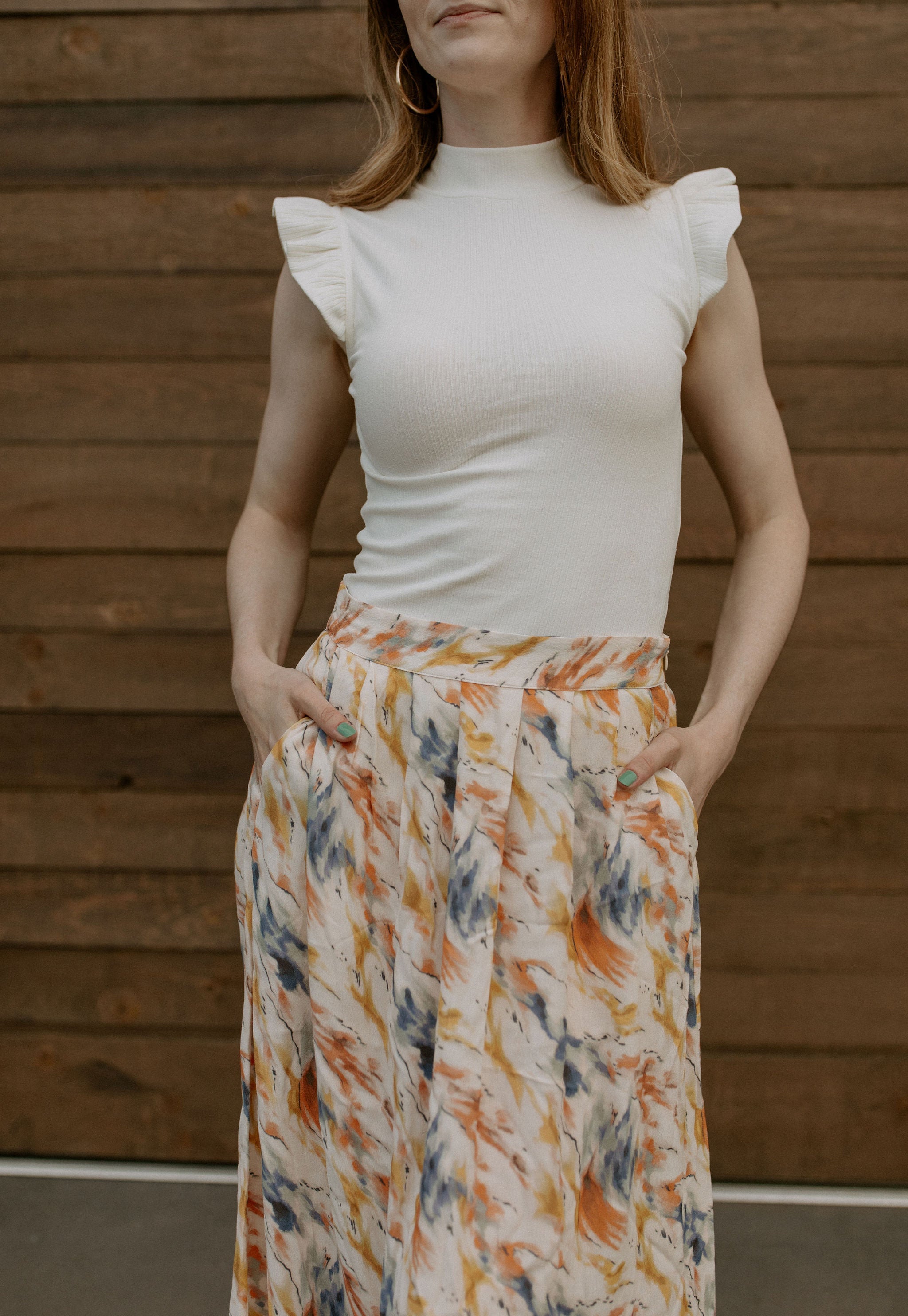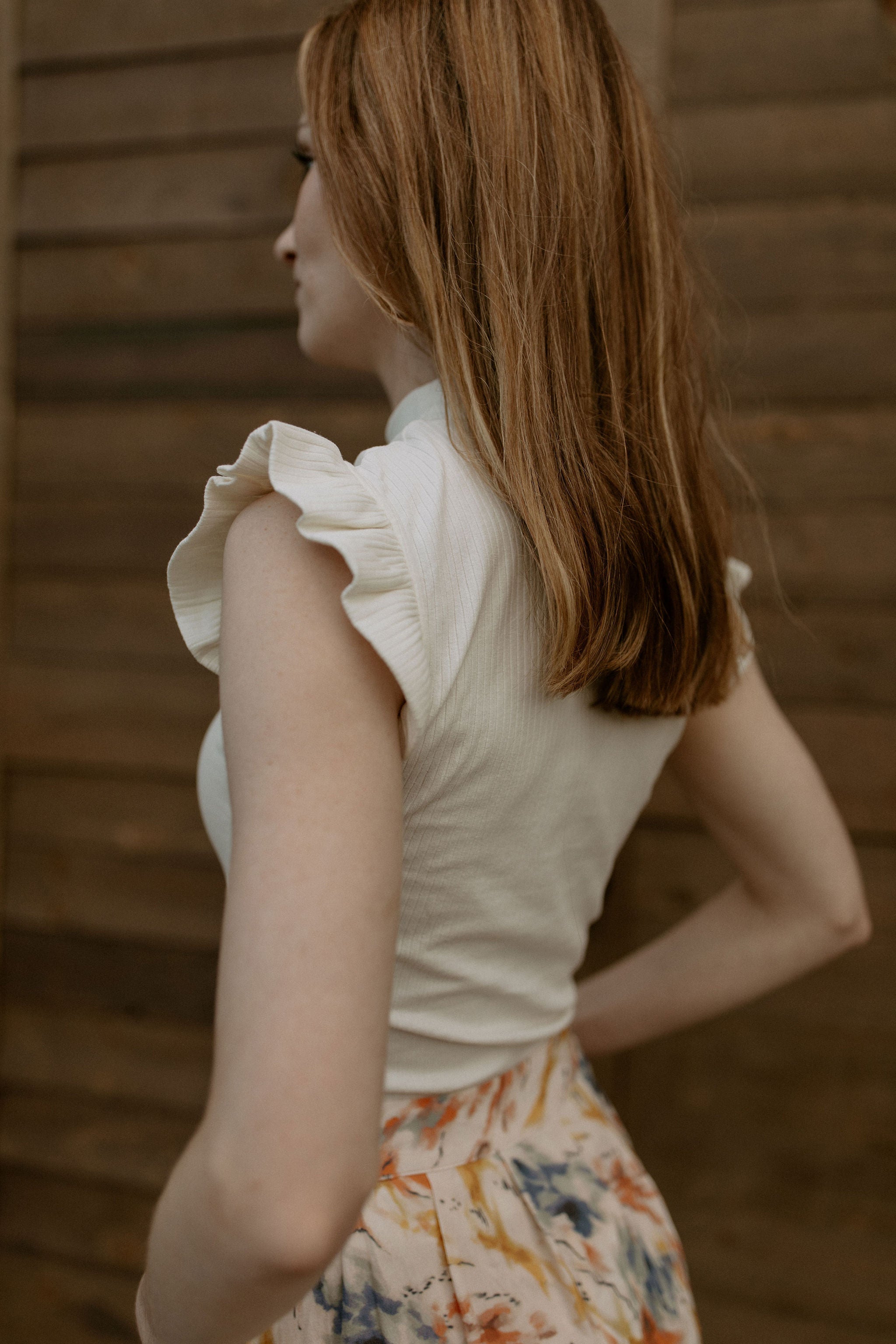 This cute little ribbed tank has a mock neck and ruffle cap sleeves making it a great piece to transition into fall and winter. We love her with a pair of denim, under a blazer, or with a skirt!