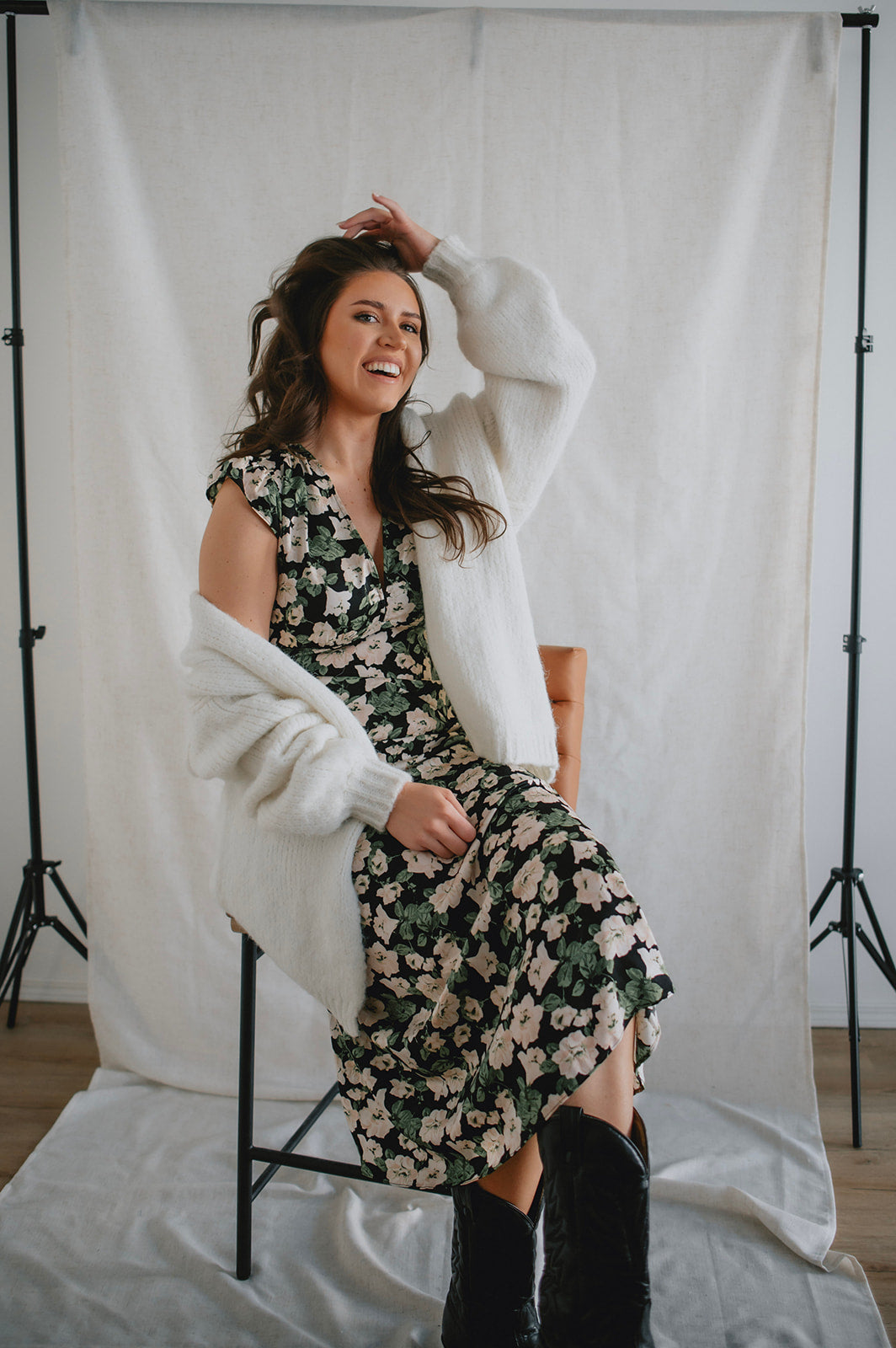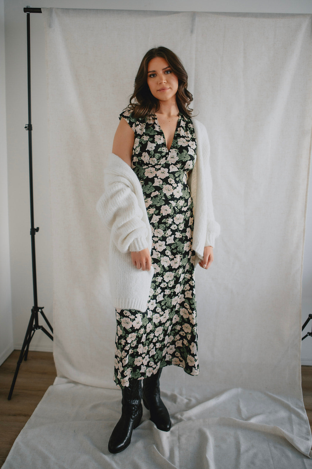 • Sayla (floral dress) is wearing a L/XL and is 6'0