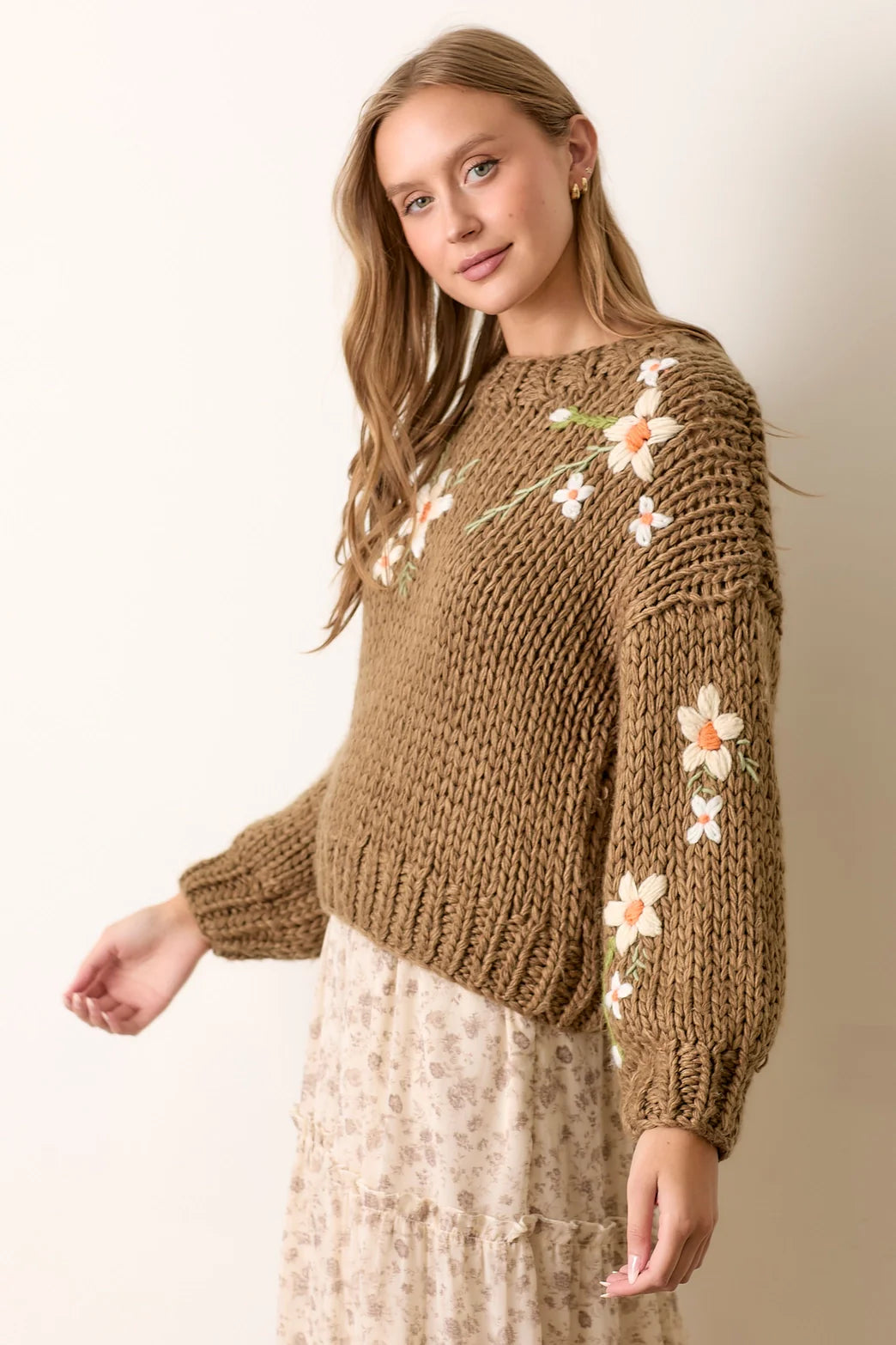 The Wren Embroidered Floral Sweater is a cozy yet elegant piece, featuring delicate white embroidered blooms for a cute and timeless touch. Designed with a wider round neck, dropped shoulders, and slight balloon sleeves, it offers a relaxed fit for effortless style. Crafted from a soft acrylic knit, this sweater is as comfortable as it is stylish, perfect for everyday wear!