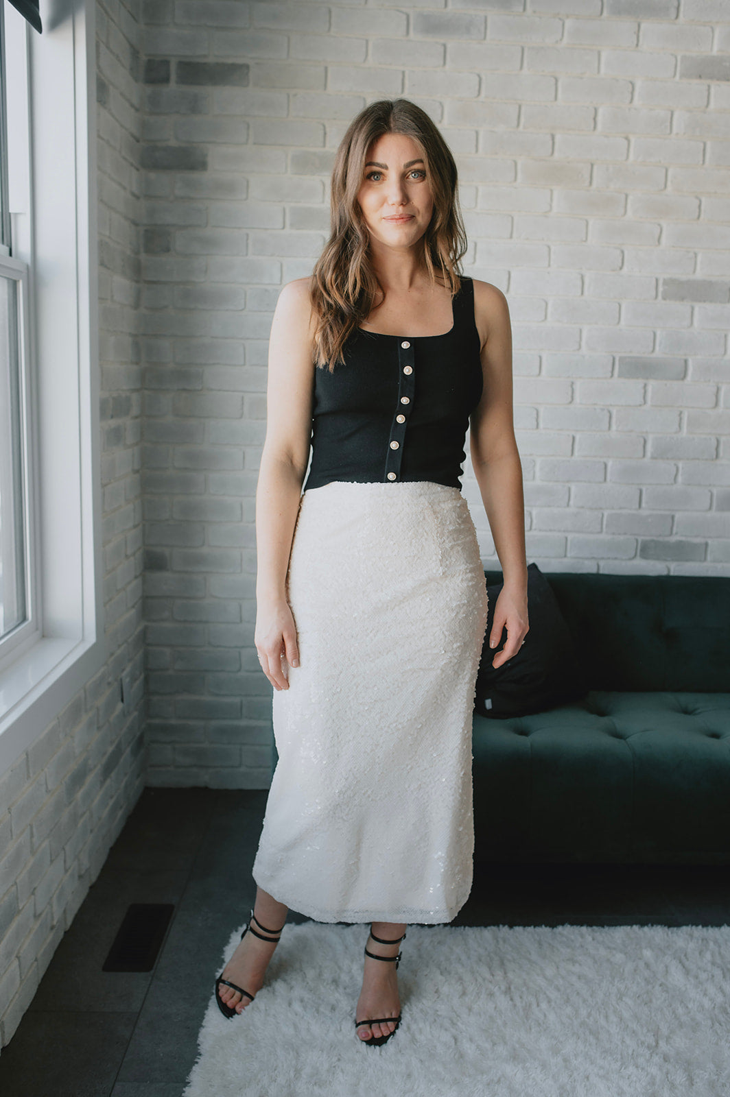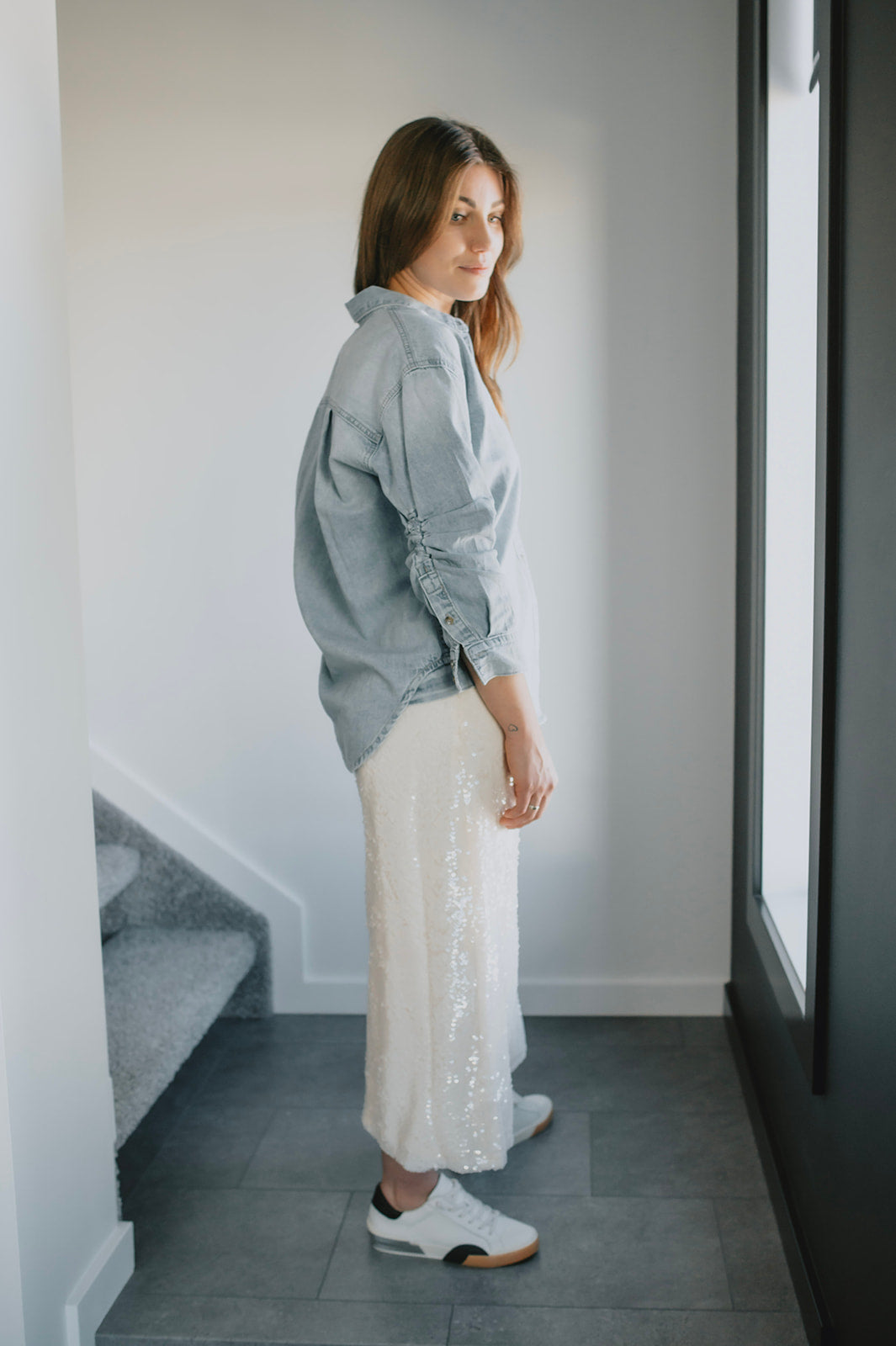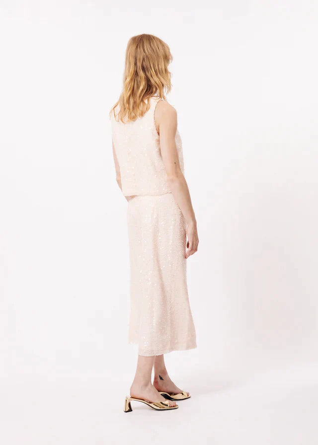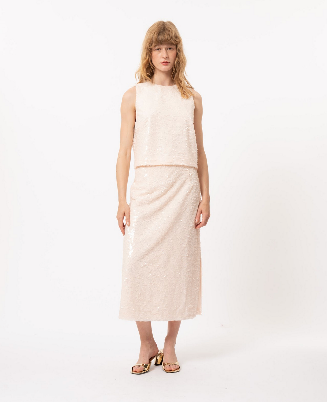 The Agnesa skirt, with its perfect length, exudes timeless elegance. The side slit adds a touch of allure, creating a perfect balance between sophistication and a hint of daring flair. This captivating skirt, adorned with sequins, promises to make a statement and ensure you stand out on any special occasion. Easy to dress down, try pairing with your favourite graphic tee or denim shirt and some sneakers!