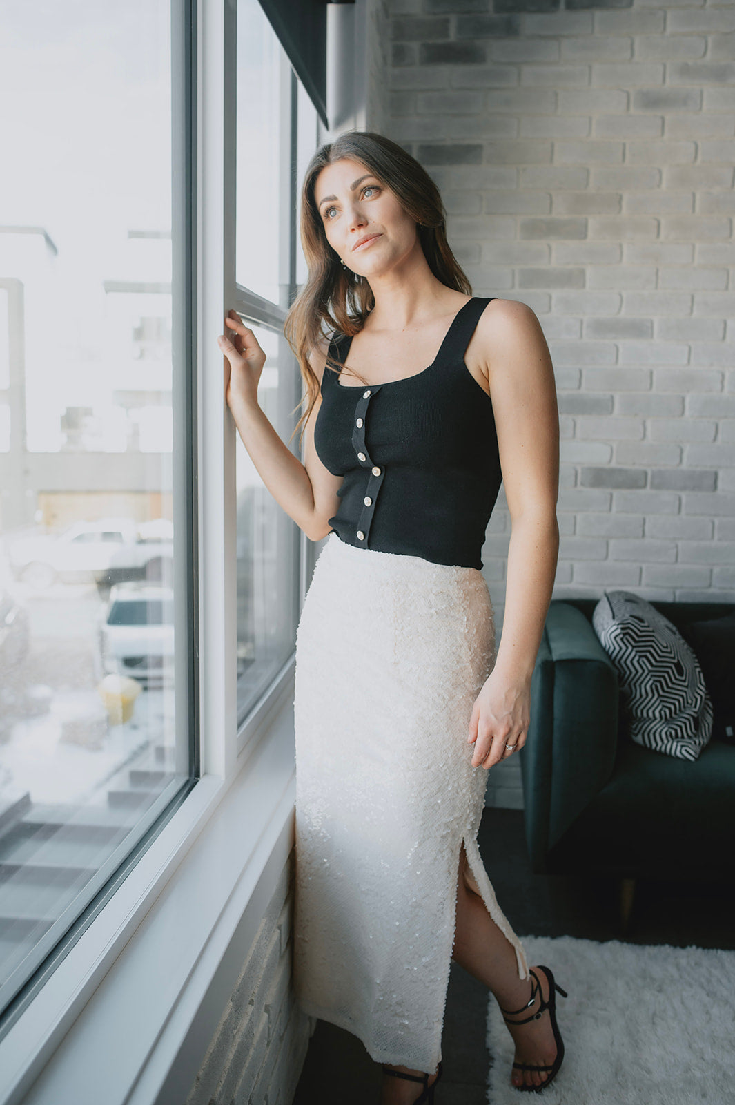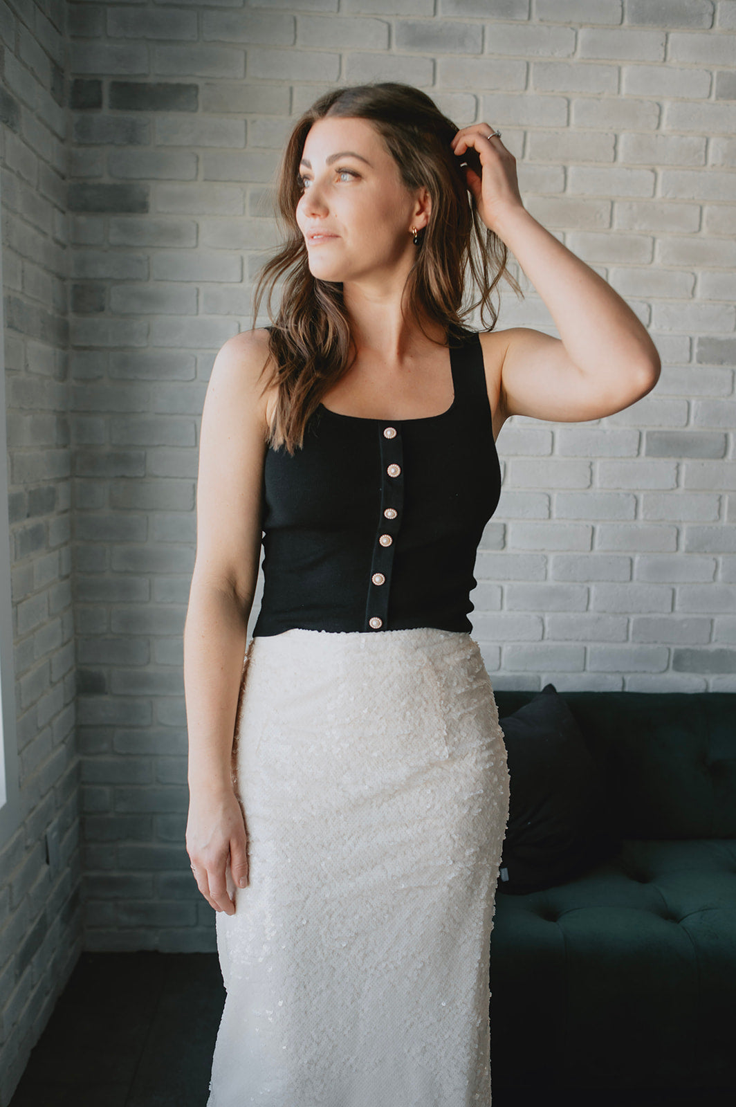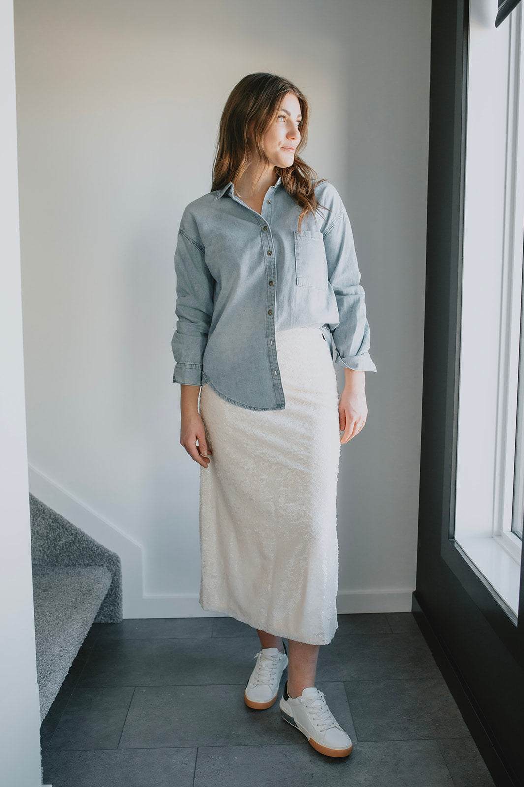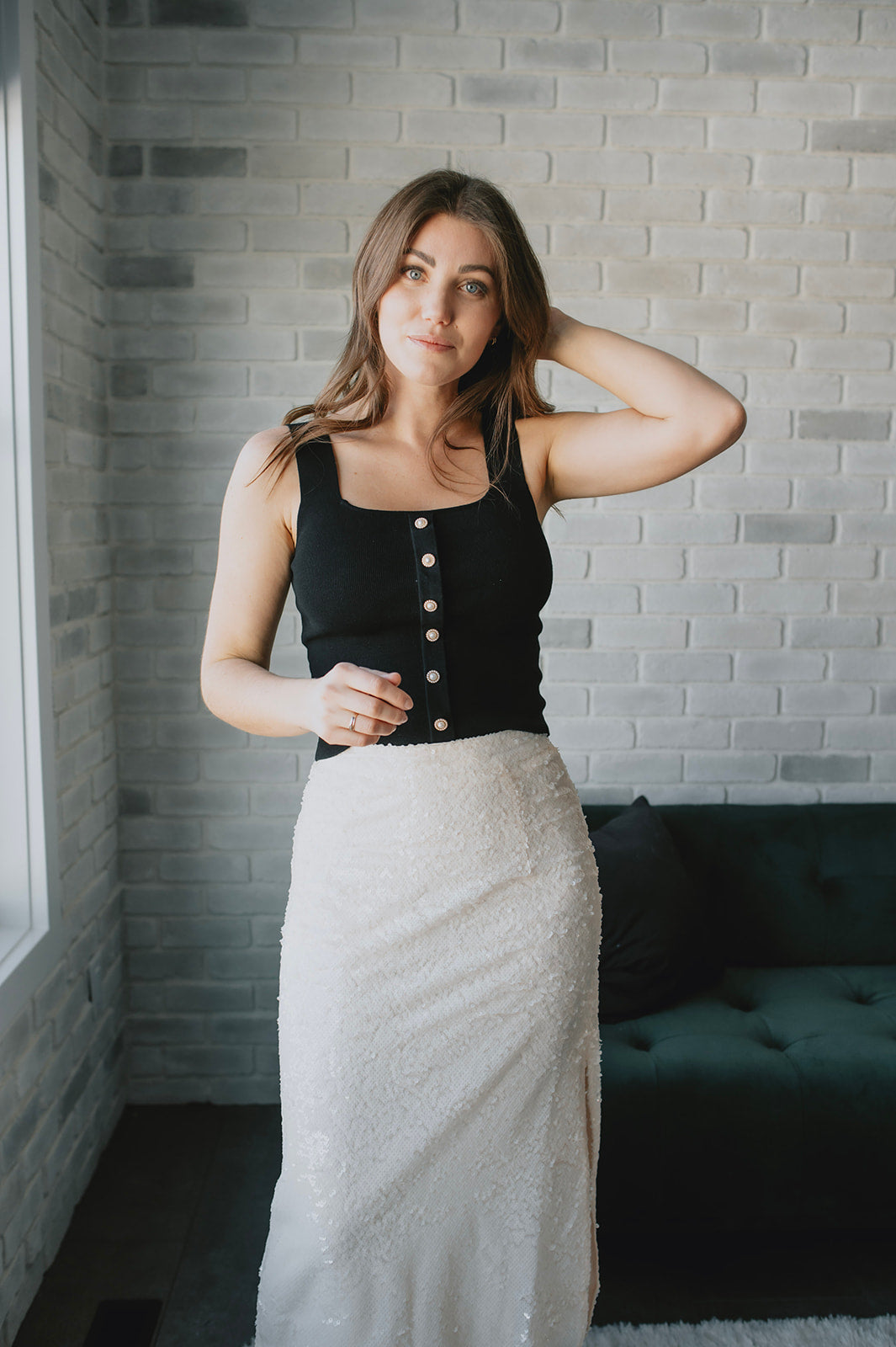 The Agnesa skirt, with its perfect length, exudes timeless elegance. The side slit adds a touch of allure, creating a perfect balance between sophistication and a hint of daring flair. This captivating skirt, adorned with sequins, promises to make a statement and ensure you stand out on any special occasion. Easy to dress down, try pairing with your favourite graphic tee or denim shirt and some sneakers!
