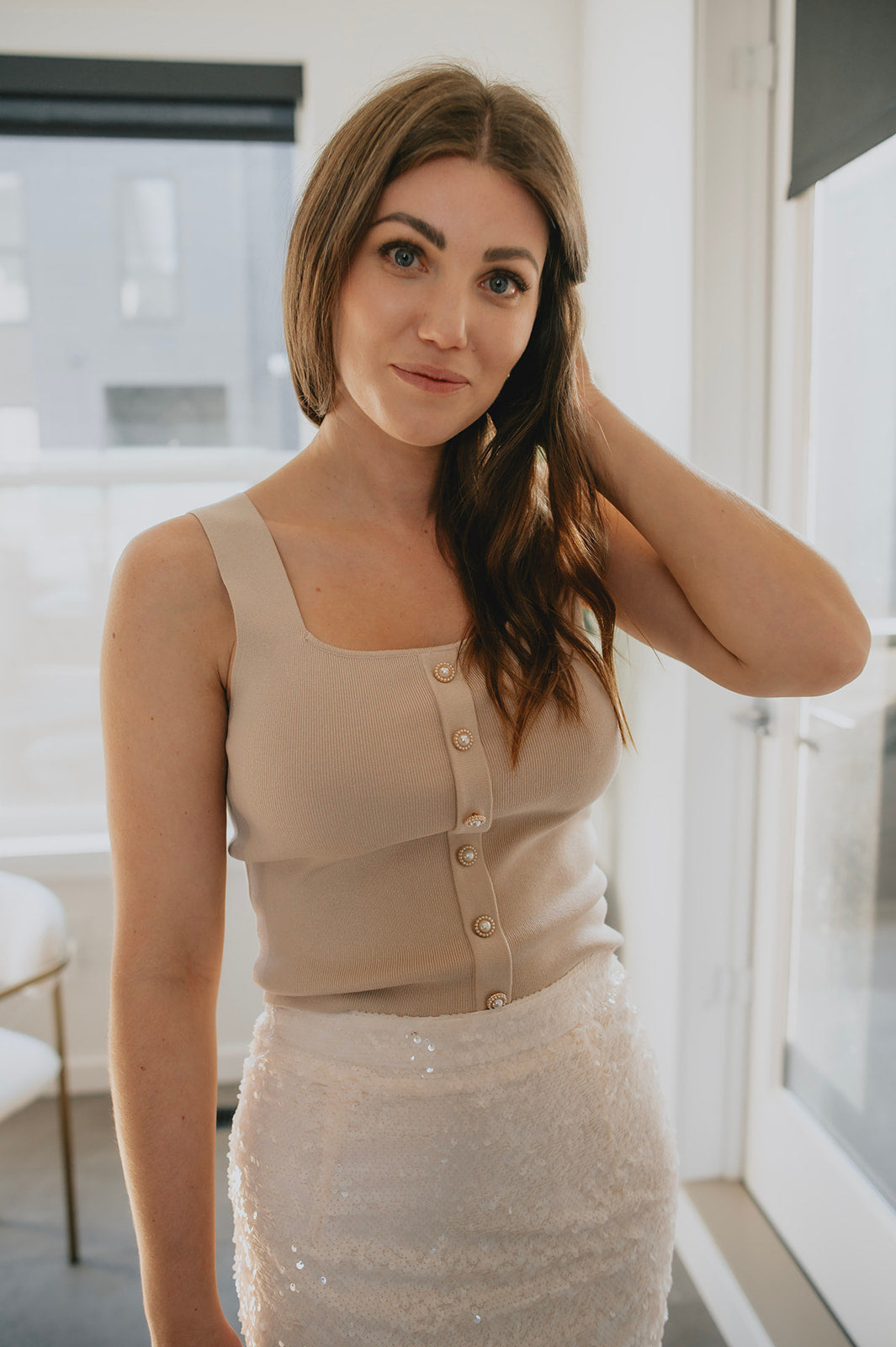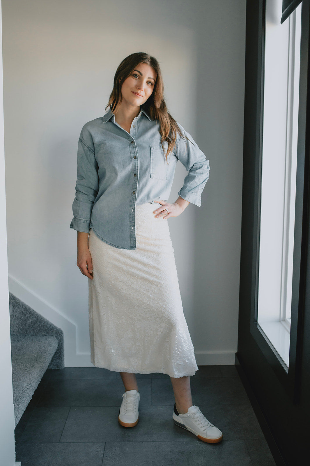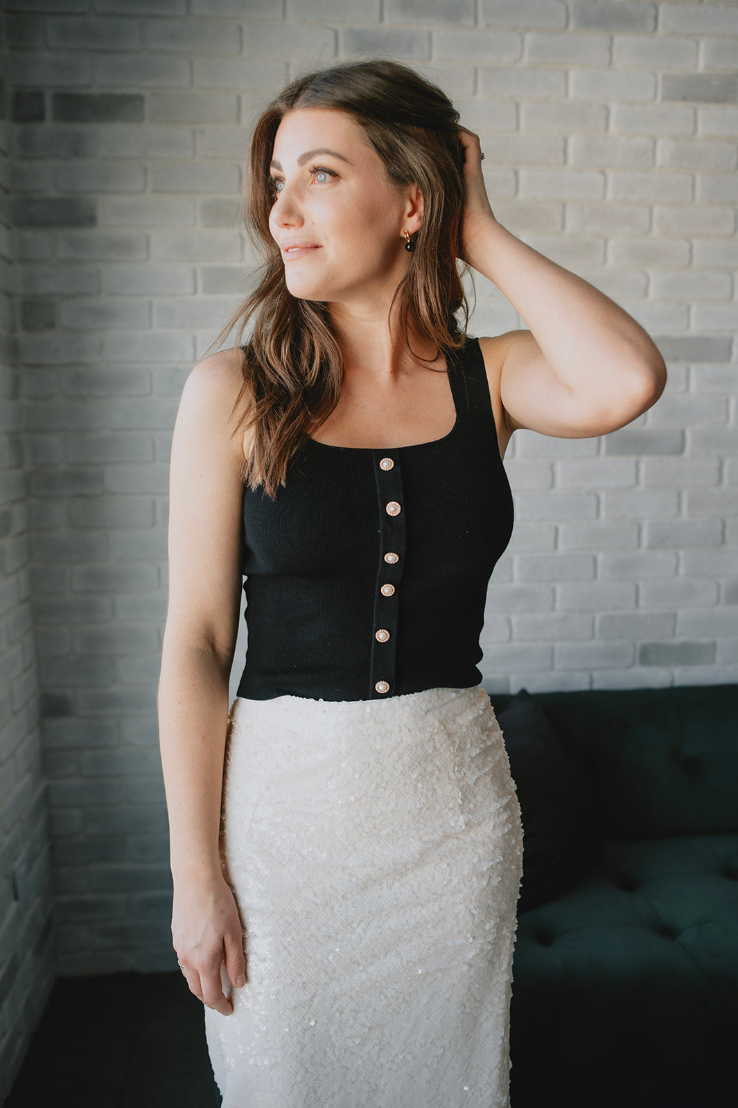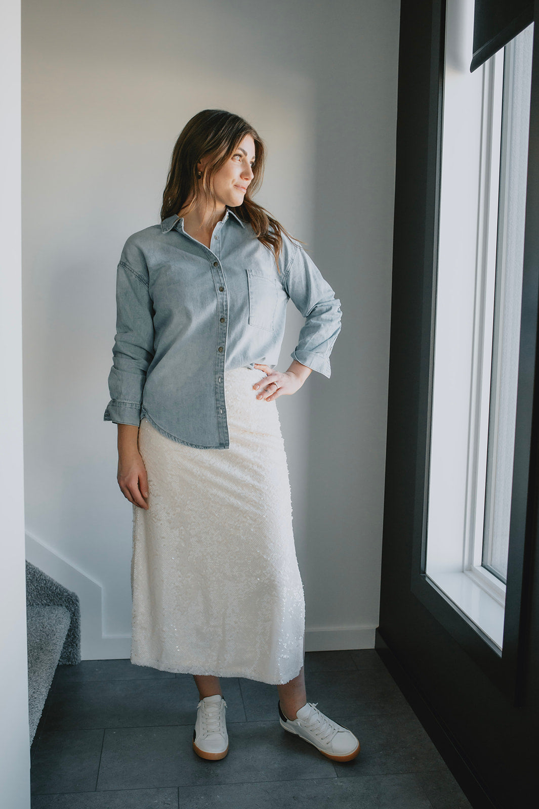 The Agnesa skirt, with its perfect length, exudes timeless elegance. The side slit adds a touch of allure, creating a perfect balance between sophistication and a hint of daring flair. This captivating skirt, adorned with sequins, promises to make a statement and ensure you stand out on any special occasion. Easy to dress down, try pairing with your favourite graphic tee or denim shirt and some sneakers!
