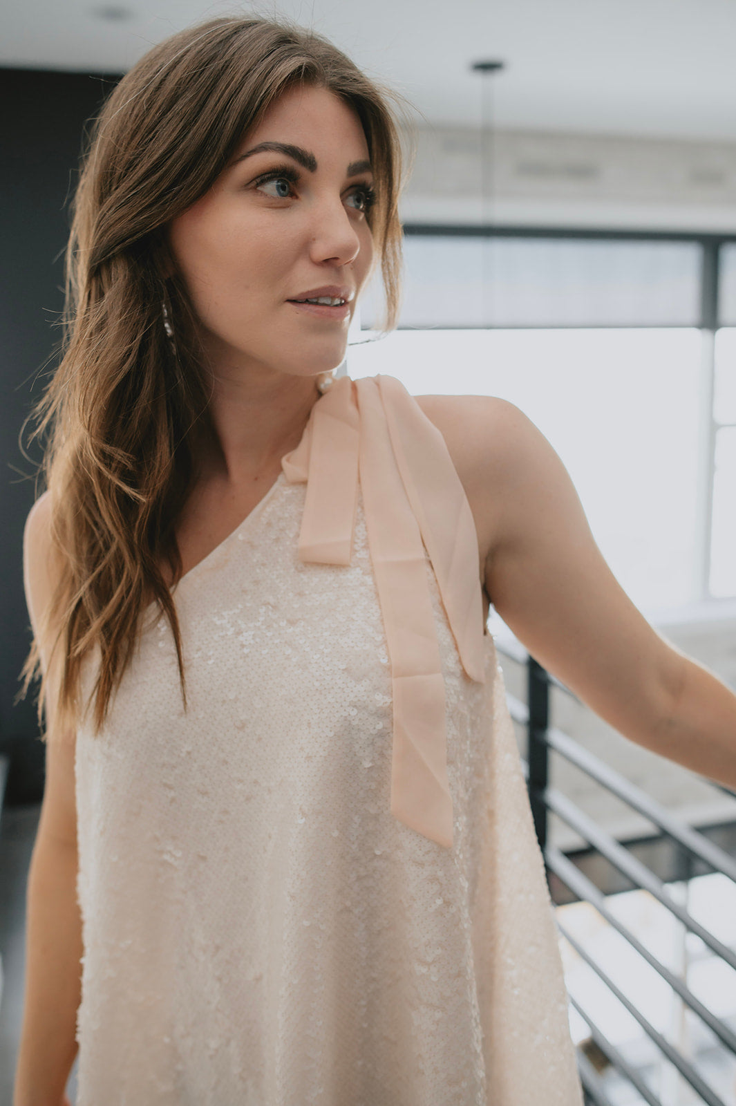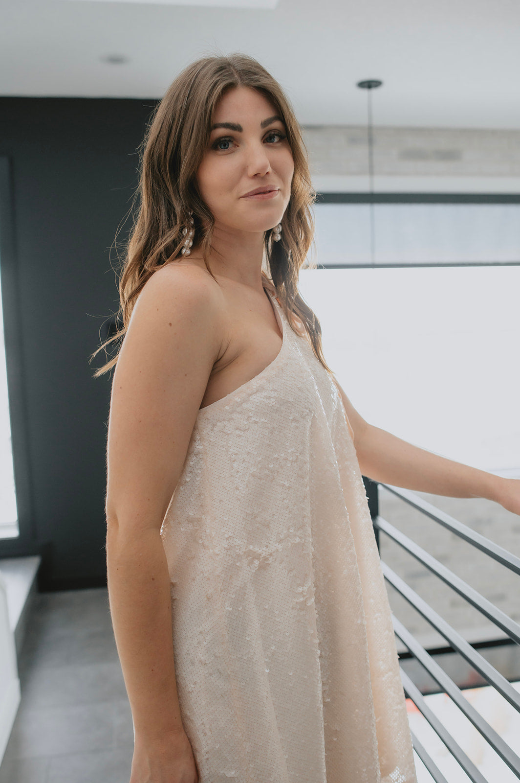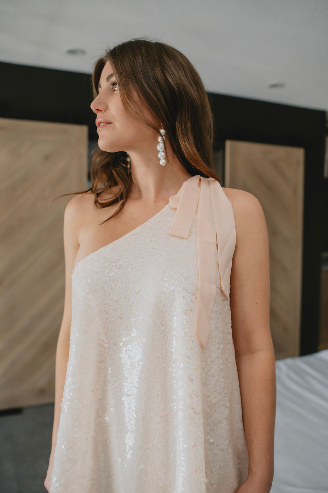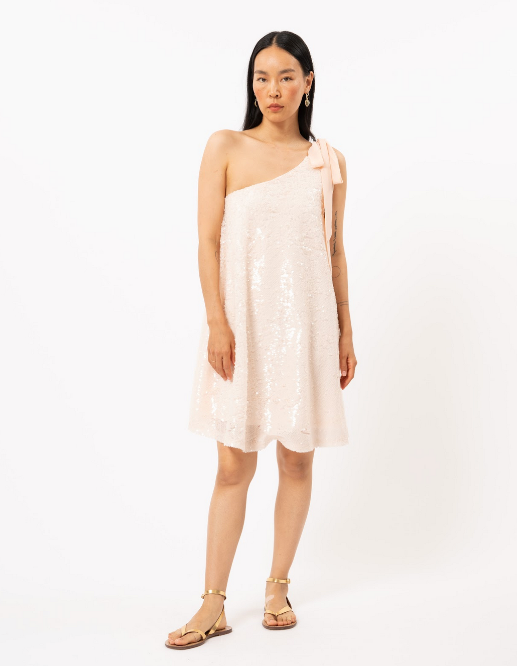 Getting married this year? Need the perfect dress for your rehearsal, shower, or bachelorette? Just looking for a fun dress for parties? Enter the spotlight with the enchanting Ariane sequined dress. This asymmetrical beauty features a charming bow on the shoulder, adding a delightful touch to your ensemble. The dress, designed in a short length with a straight cut, ensures both style and comfort. The glistening sequins accompanying the Ariane dress promise to capture attention and elevate your presence at any celebration. It's a flawless choice for those seeking a combination of modern elegance and a touch of playful charm.