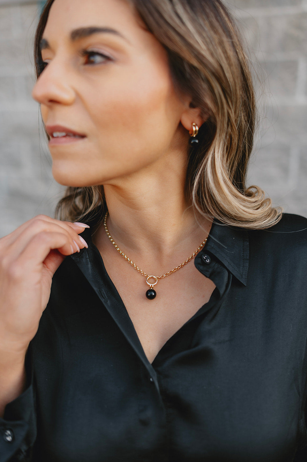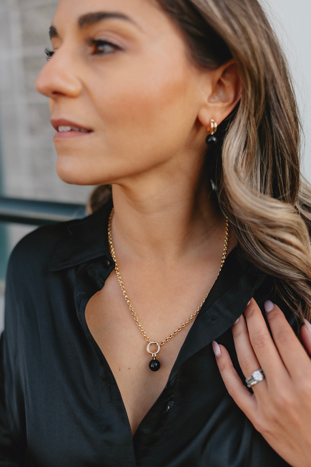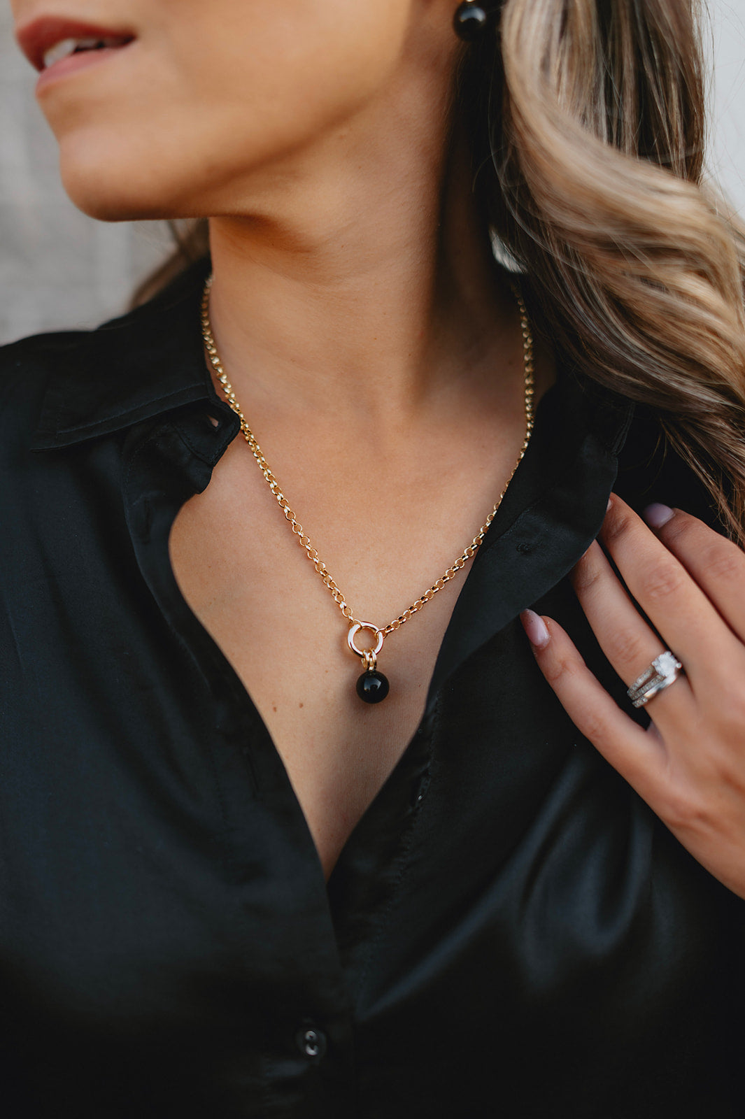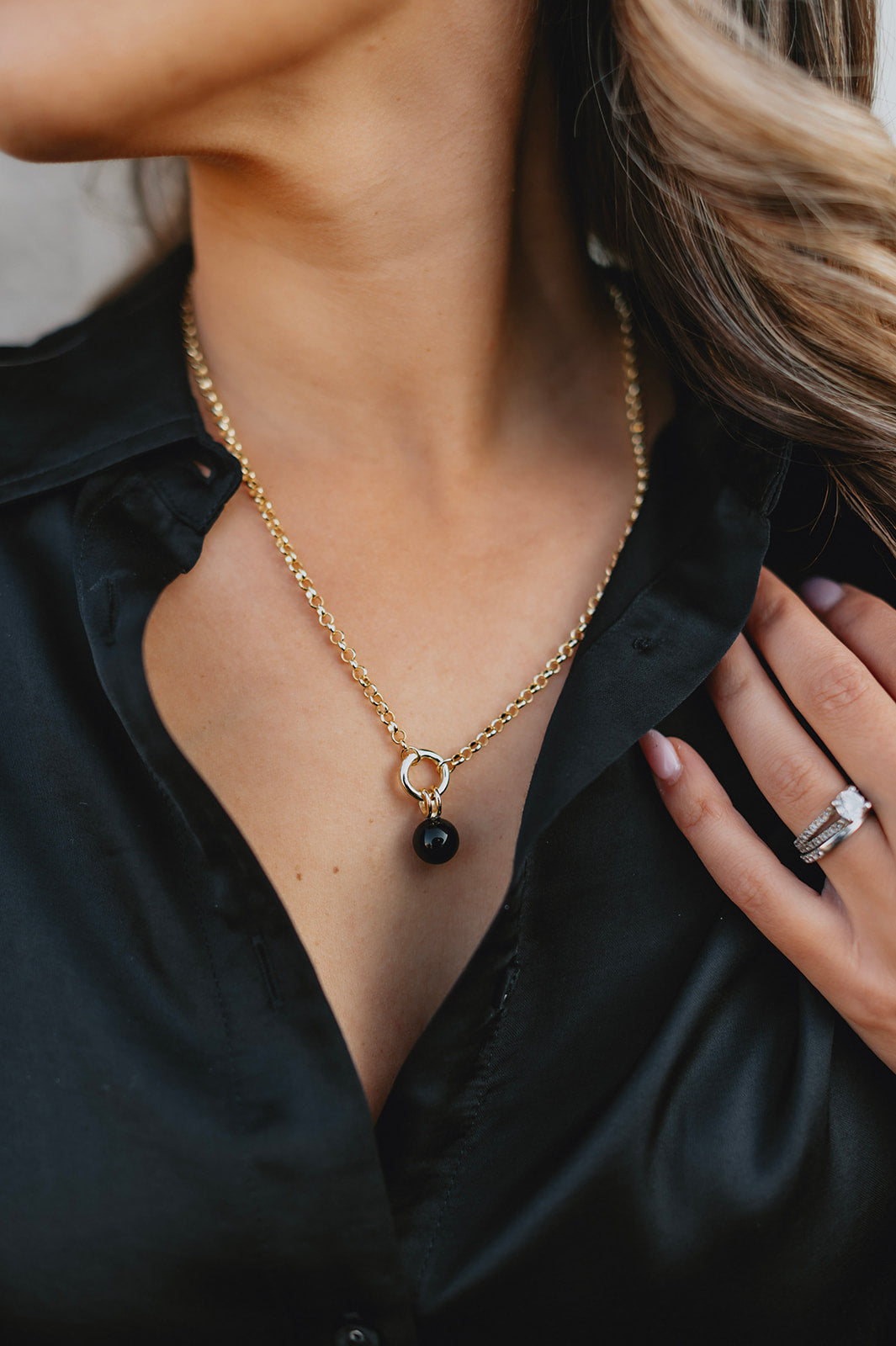 The Monroe Rolo Chain Necklace: A necklace created for both everyday wear, as well as dressed up for the most exquisite moments! Both timeless and modern, The Monroe Rolo Chain Necklace can be worn layered, solo, or even try removing the detachable Onyx Ball Charm for an entirely different look and mood! The toggle clasp was also designed to be worn solo OR with the charm, and we can't decided which way we love more!