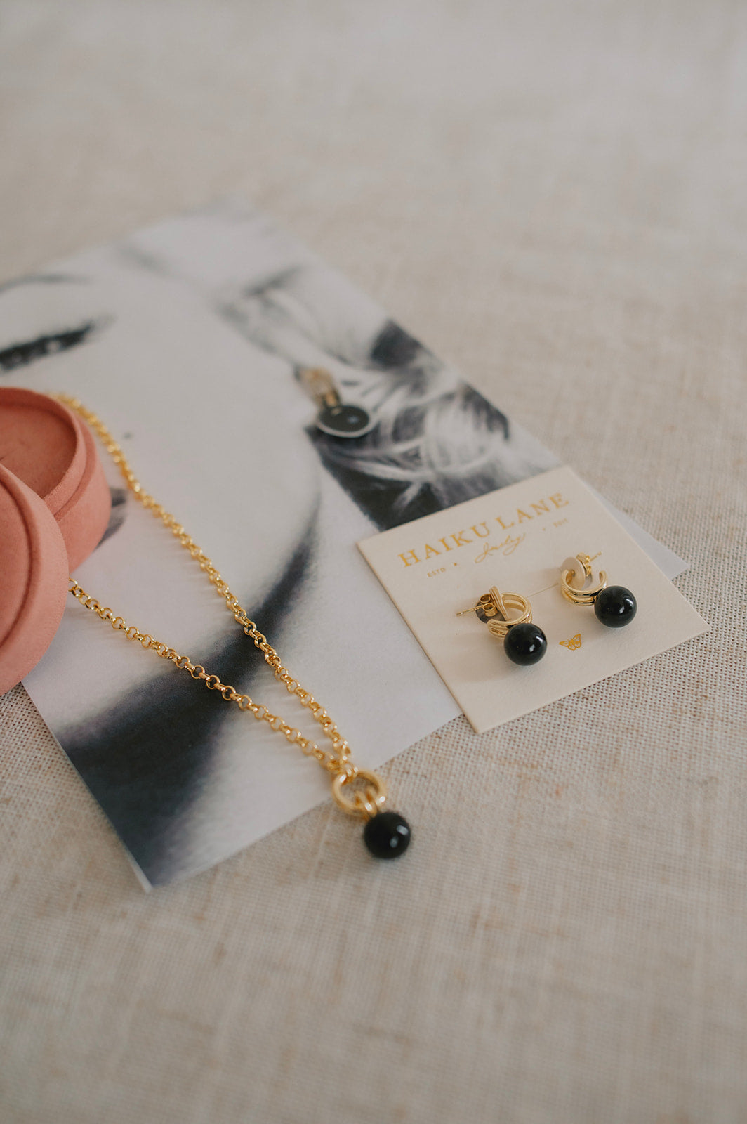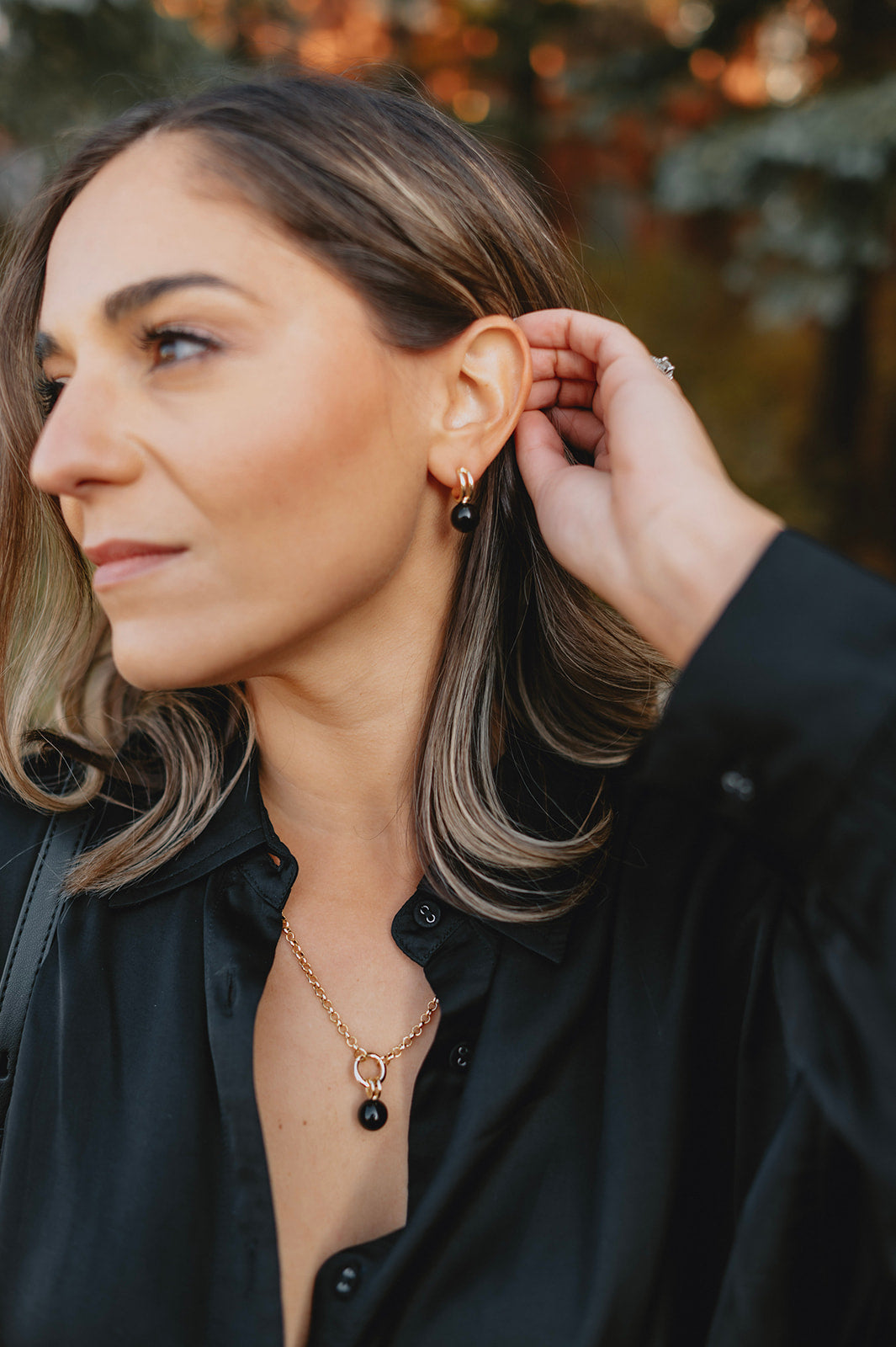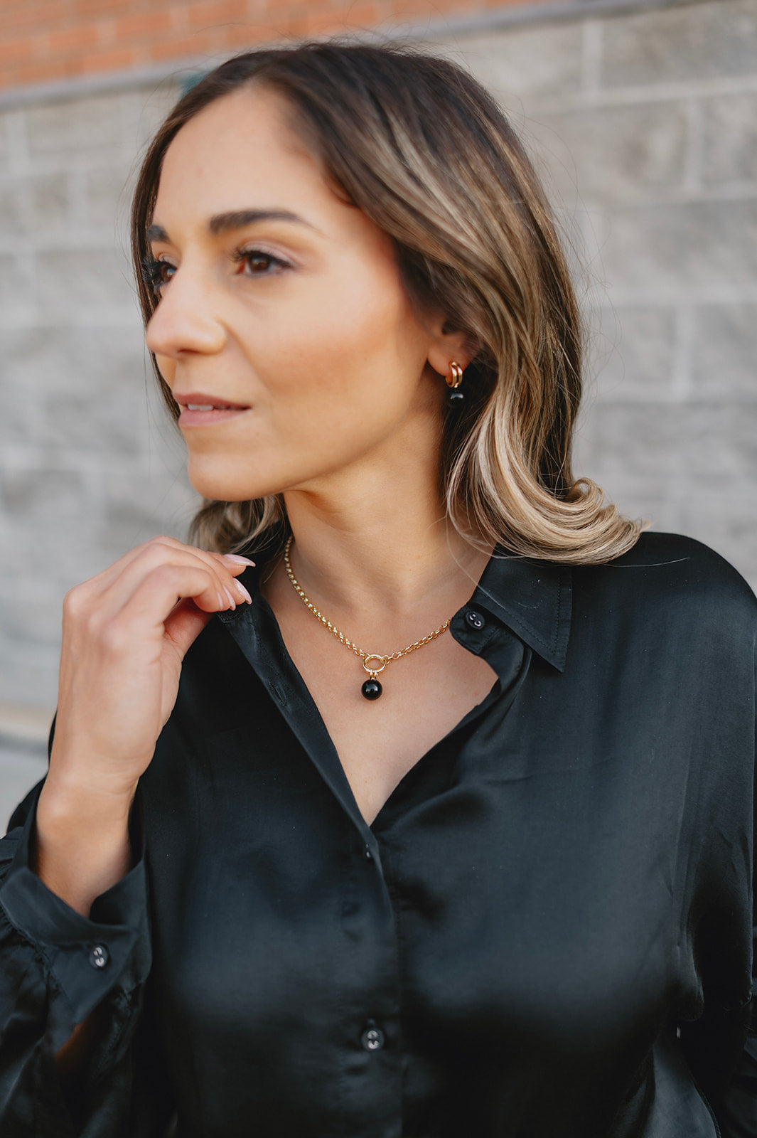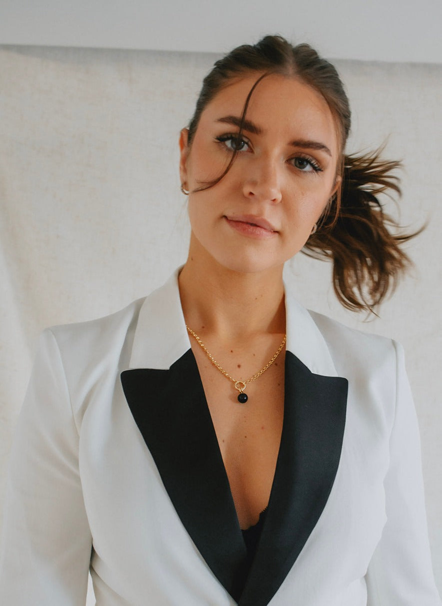 The Monroe Rolo Chain Necklace: A necklace created for both everyday wear, as well as dressed up for the most exquisite moments! Both timeless and modern, The Monroe Rolo Chain Necklace can be worn layered, solo, or even try removing the detachable Onyx Ball Charm for an entirely different look and mood! The toggle clasp was also designed to be worn solo OR with the charm, and we can't decided which way we love more!