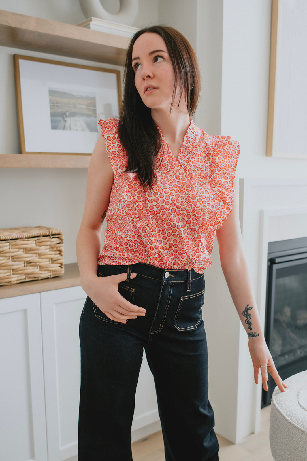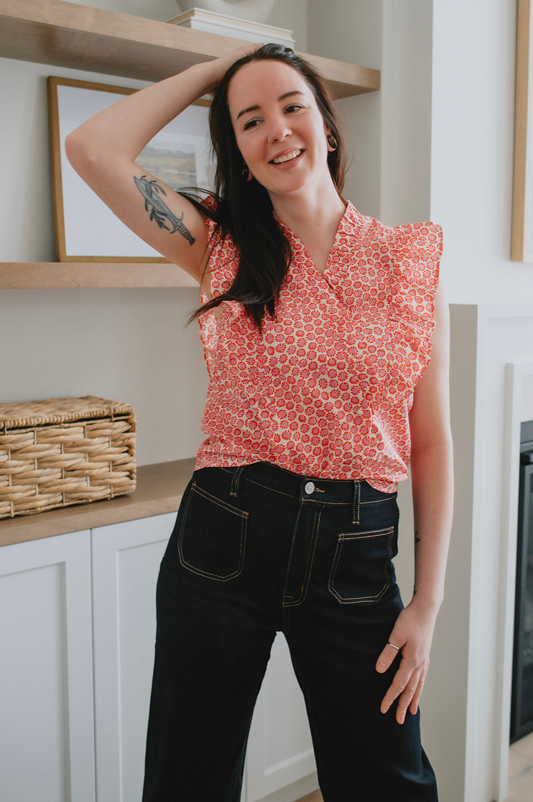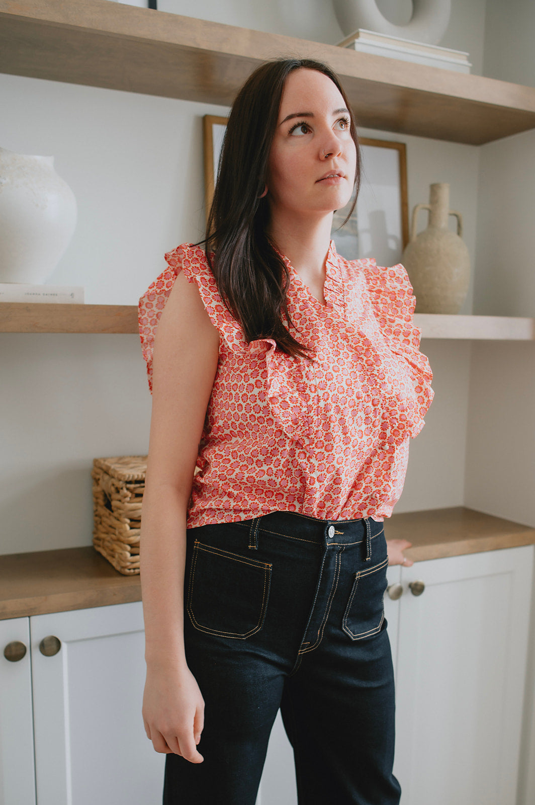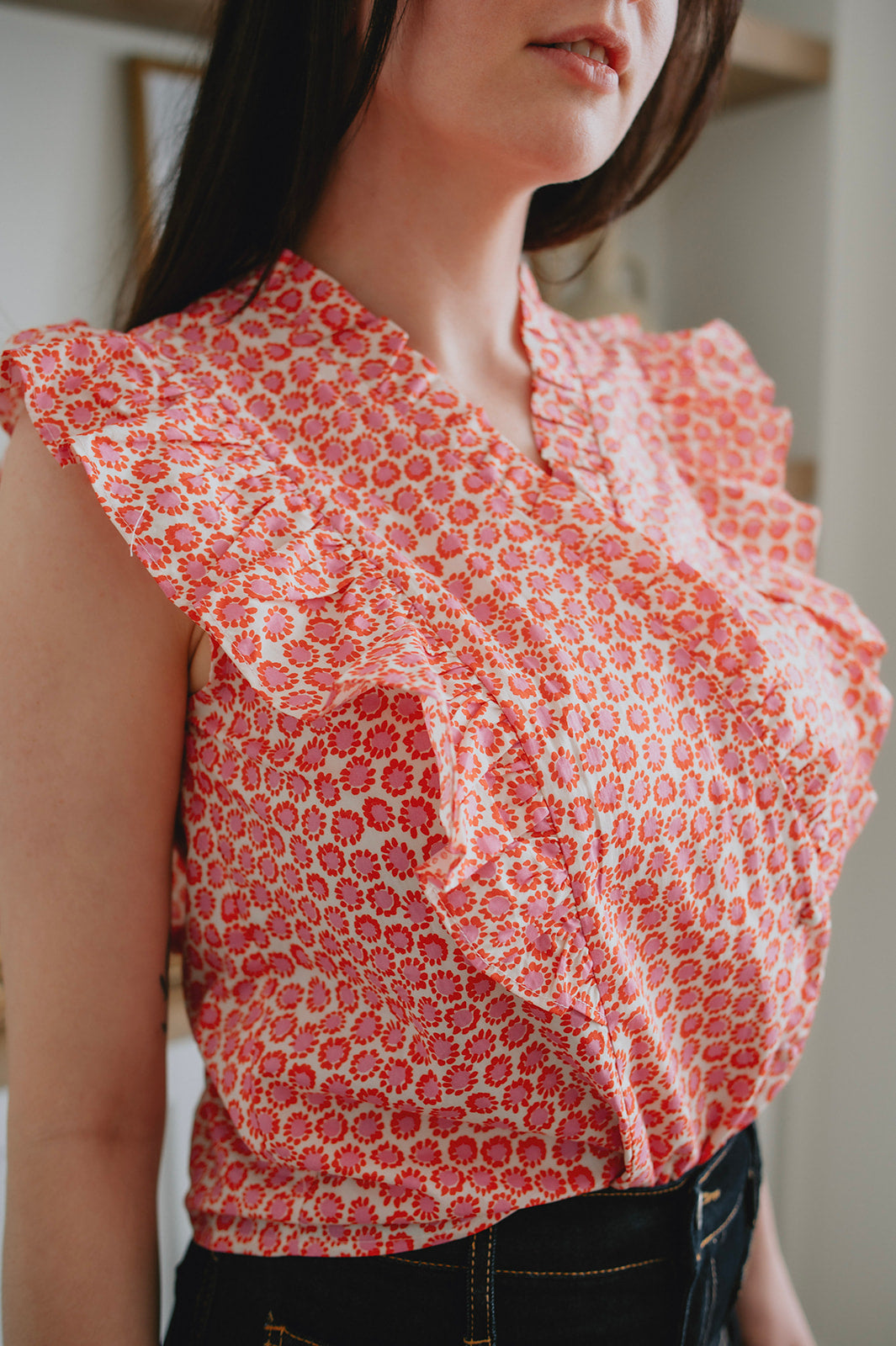 This sleeveless ruffle blouse brings the perfect amount of Spring into your outfit. The pops of red and pink mixed with the ruffle details make her easy for work and fun! The crossover front and subtle buttons make the fit much more comfortable than a traditional button front top which we are so here for.