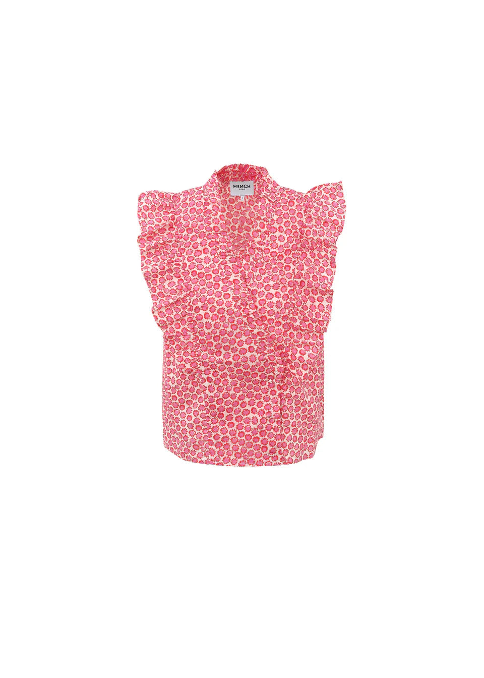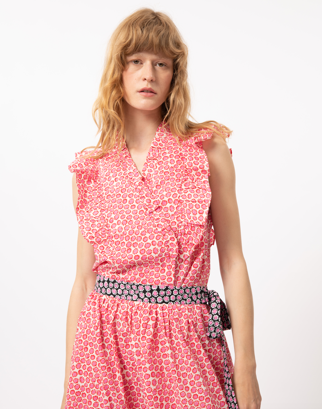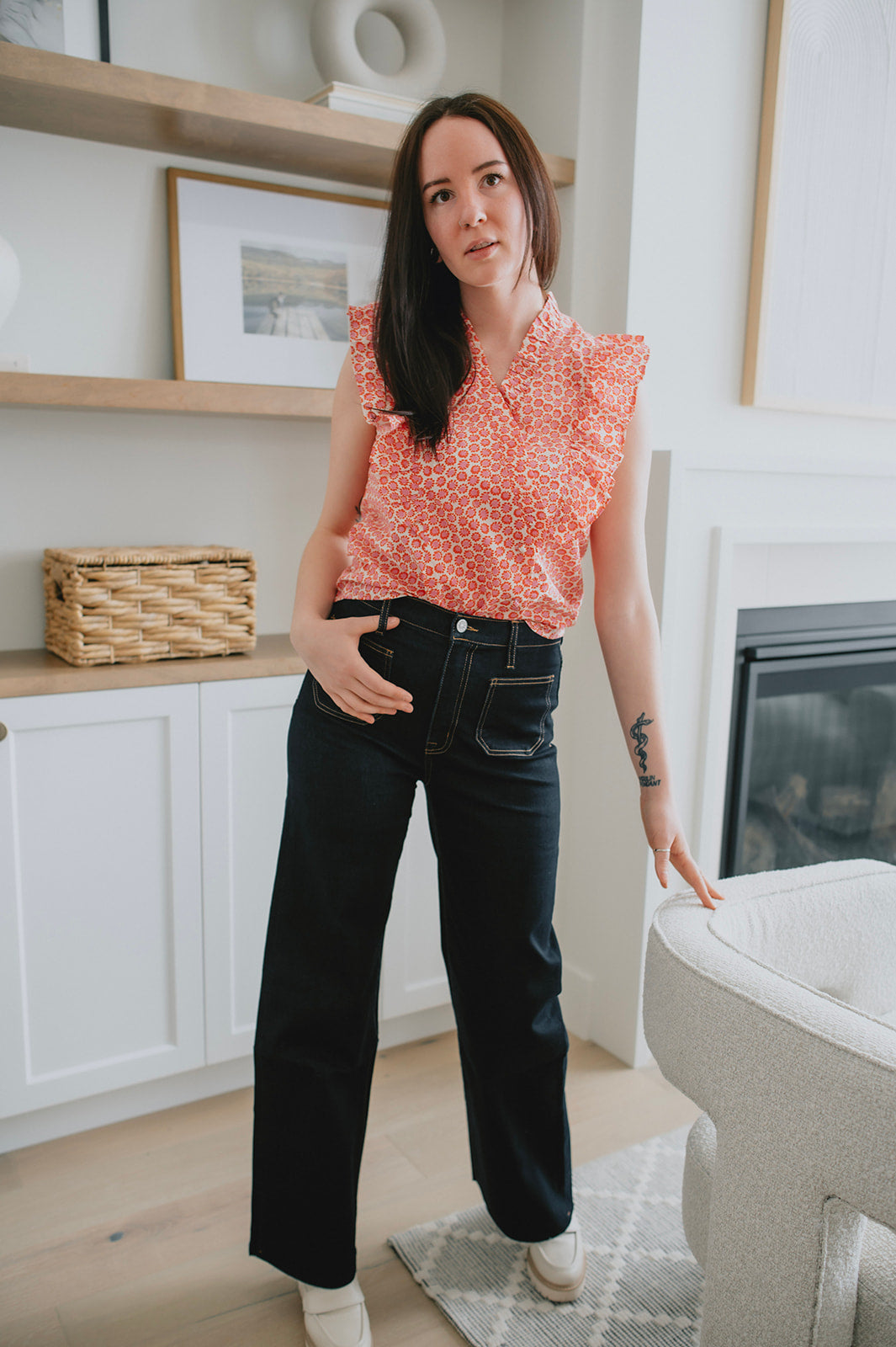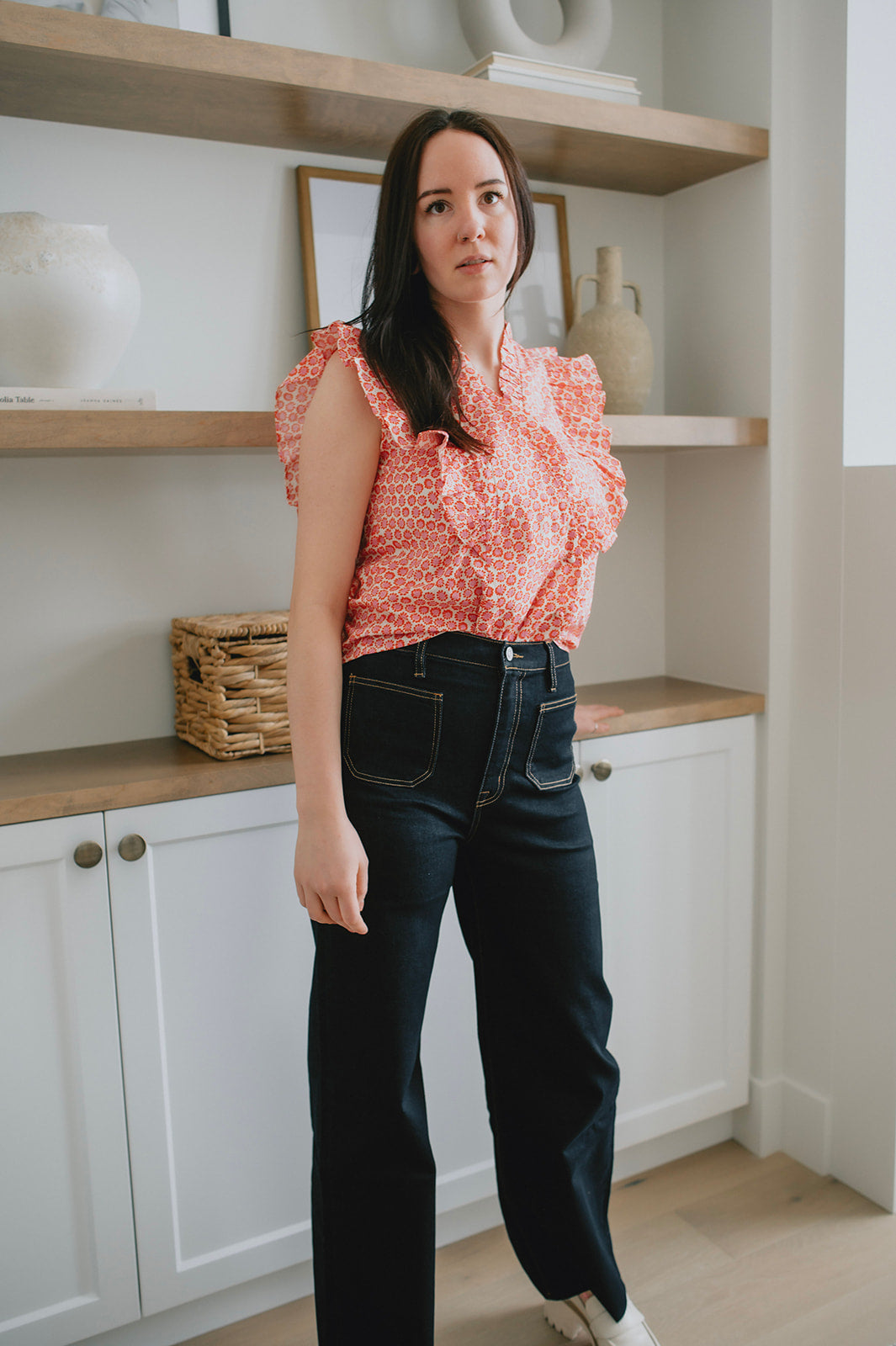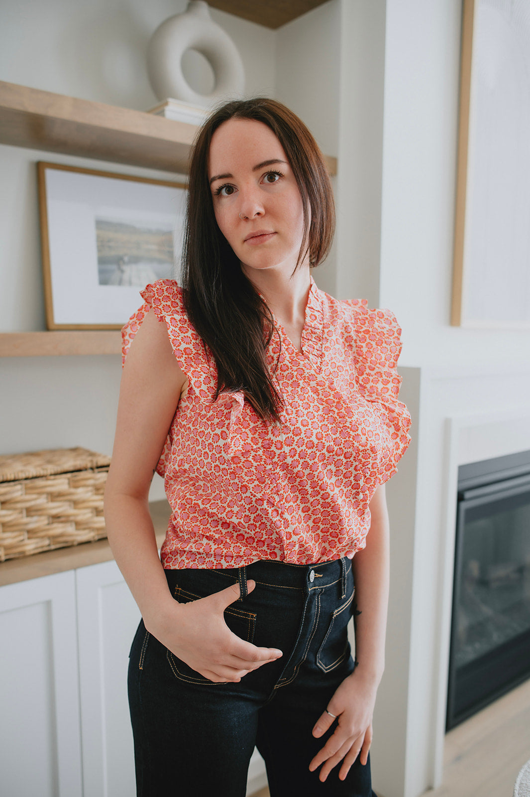 This sleeveless ruffle blouse brings the perfect amount of Spring into your outfit. The pops of red and pink mixed with the ruffle details make her easy for work and fun! The crossover front and subtle buttons make the fit much more comfortable than a traditional button front top which we are so here for.