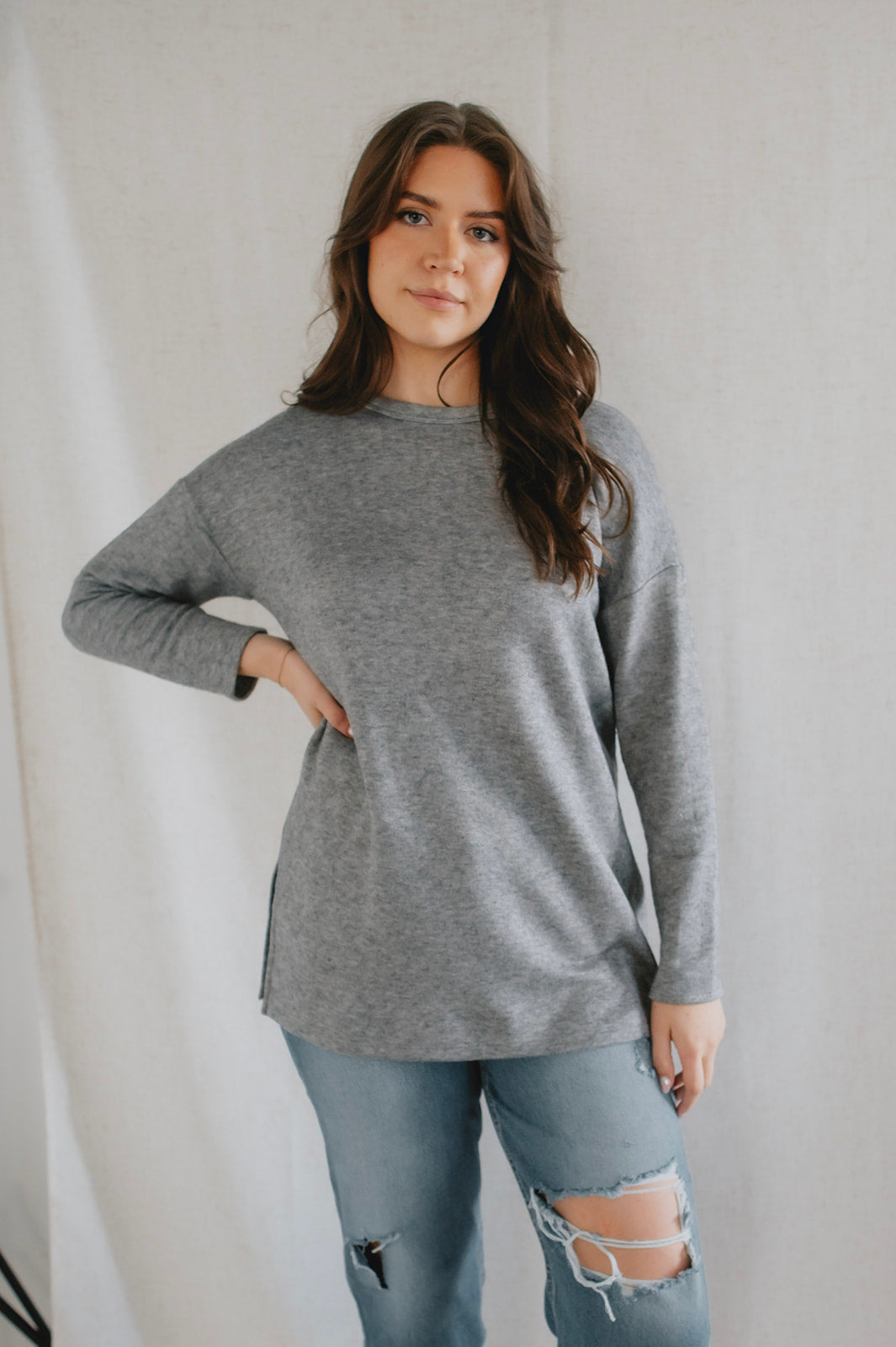 Introducing our sophisticated Gia Tunic Top, a timeless essential that seamlessly blends comfort and style. Crafted with elegance in mind, this long sleeve tunic boasts a flattering silhouette that effortlessly drapes over your figure. Featuring slits at the sides, this tunic offers added mobility and a hint of allure, allowing you to move with grace and confidence throughout your day.