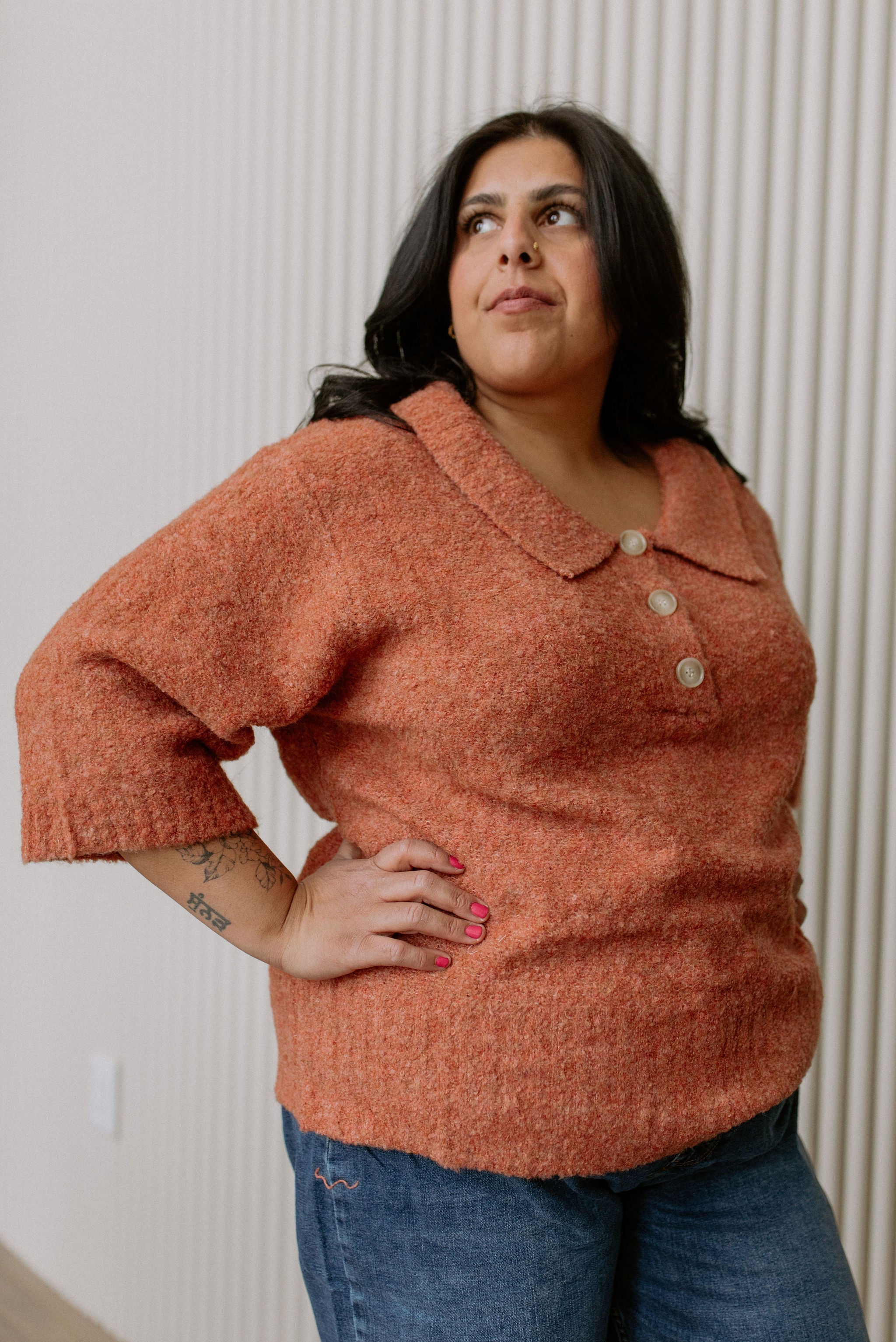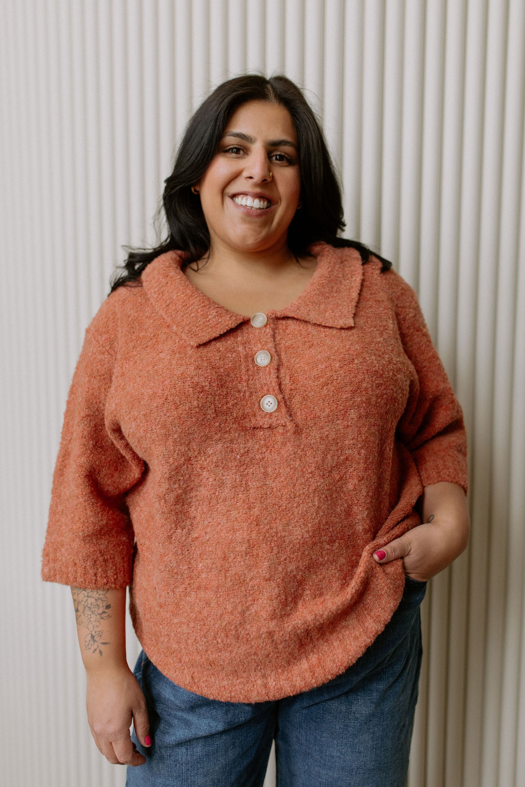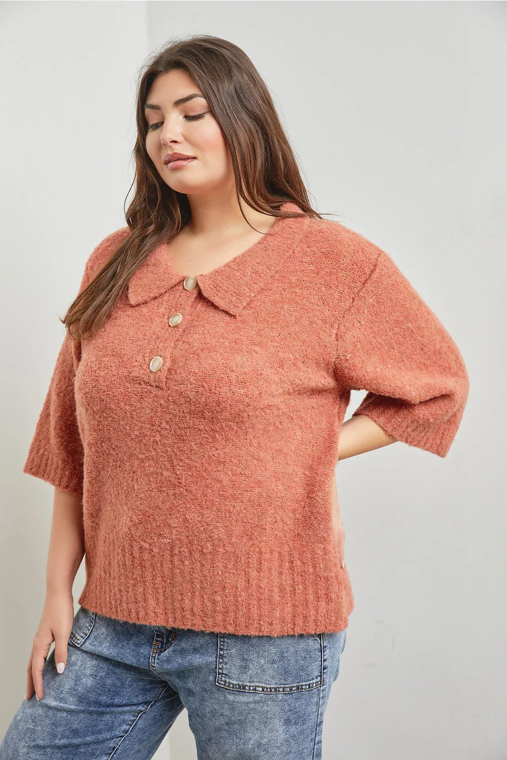 Meet our newest friend, Tori, a nostalgic nod to vintage sophistication with a contemporary twist. Crafted from a luxurious boucle knit fabric, this top exudes timeless elegance and comfort. The collared neckline and three-button placket add a classic polo-style touch, while the elbow-length sleeves offer a hint of retro charm. Delicate ribbing detail on the sleeve cuffs and bottom hem adds texture and dimension, elevating the overall aesthetic. Despite its vintage-inspired feel, this top is lightweight and breathable, making it perfect for transitional weather or layering. The fuzzy texture of the boucle knit adds an extra element of coziness and warmth, ensuring you feel as stylish as you are comfortable.